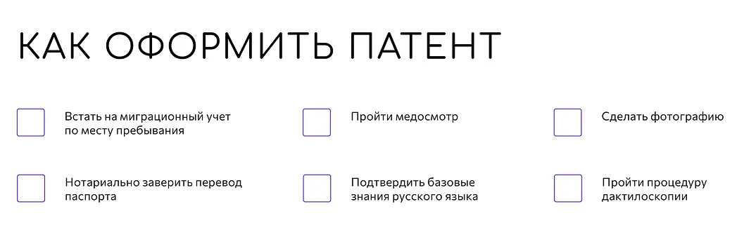 برای دریافت پتنت، باید در محل اقامت روند ثبتنام برای مهاجرت را انجام داد، ترجمه رسمی گذرنامه را تهیه کرد، معاینه پزشکی انجام داد، تأییدیه دانش پایه زبان روسی دریافت کرد، عکس گرفت و مراحل انگشتنگاری را طی کرد. هم پتنت و هم اجازه کار در واحدهای مهاجرتی «وزارت امور داخلی» (МВД) صادر میشوند.