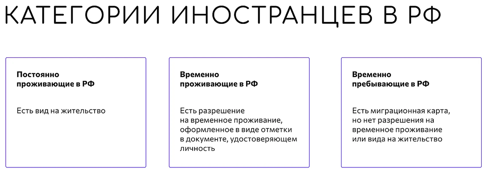براساس قانون اساسی فدراسیون روسیه، اتباع خارجی از حقوقی برابر با شهروندان روسی برخوردارند، به استثنای موارد معینی که توسط قانون فدرال یا معاهده بینالمللی مقرر شده است. شهروندان خارجی که در قلمرو فدراسیون روسیه اقامت دارند به سه دسته تقسیم میشوند: