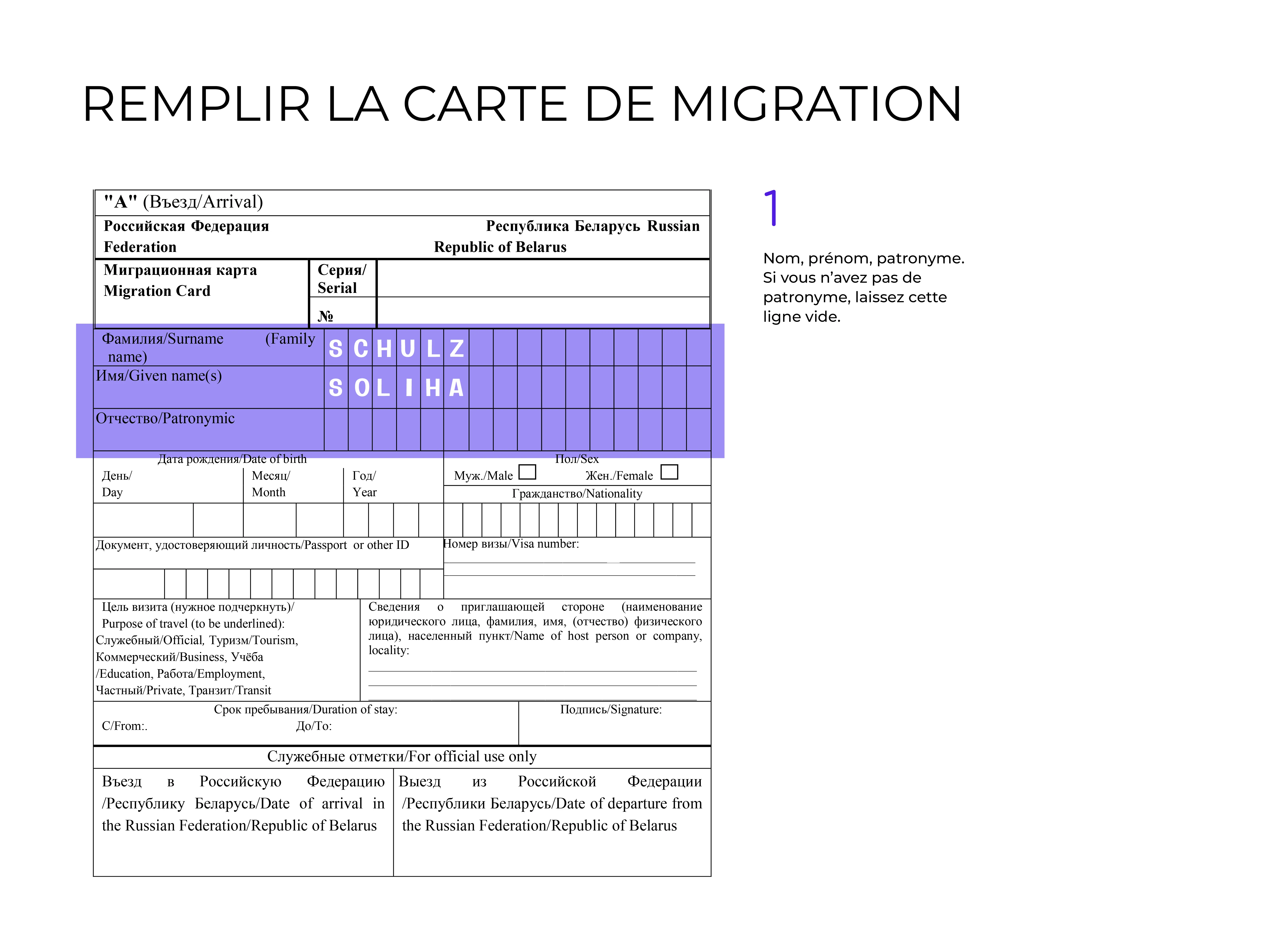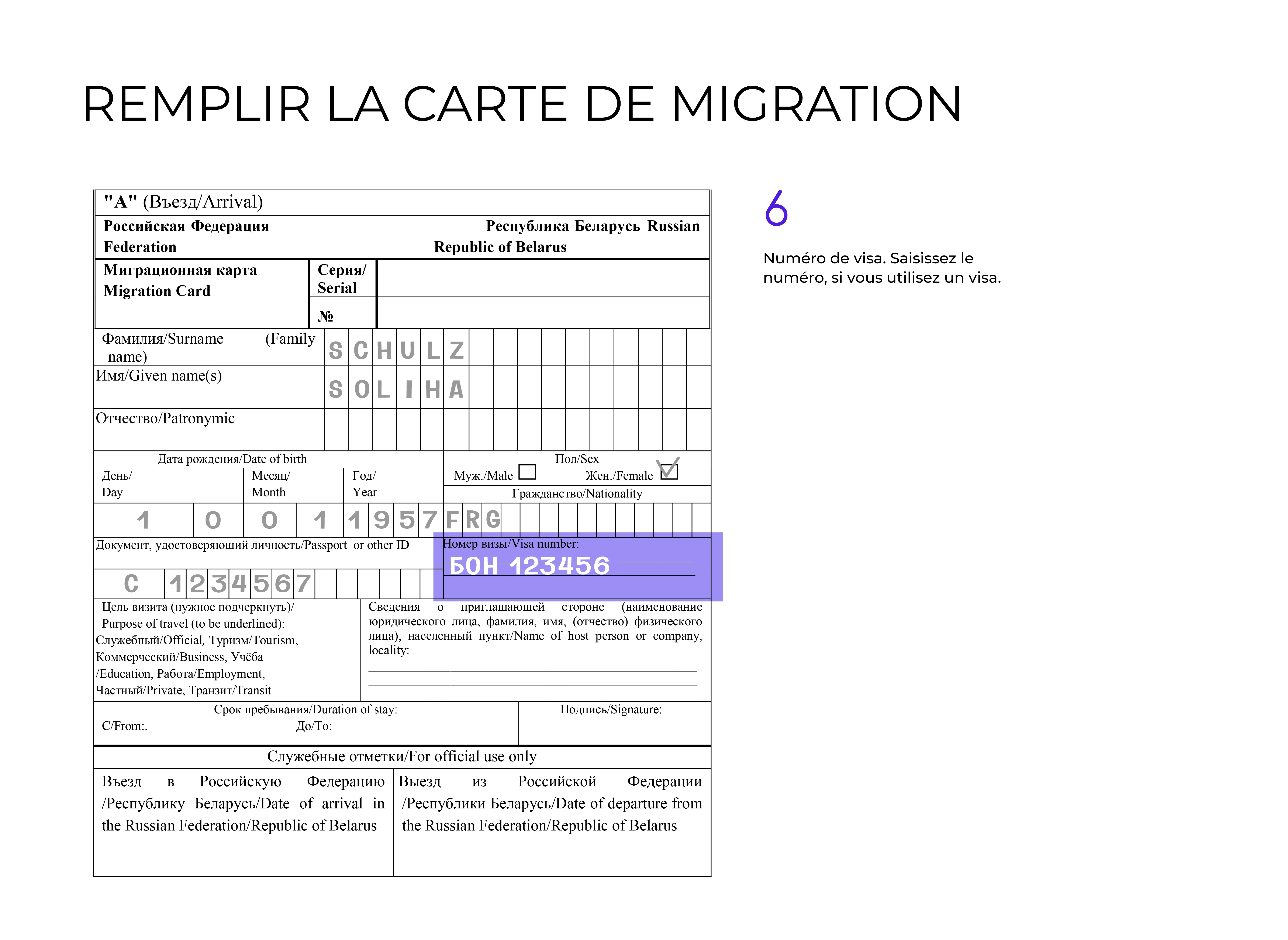 Lors de l’entrée en Fédération de Russie, le formulaire de carte de migration doit être obtenu auprès d’un agent de la police des frontières lors du contrôle des passeports.