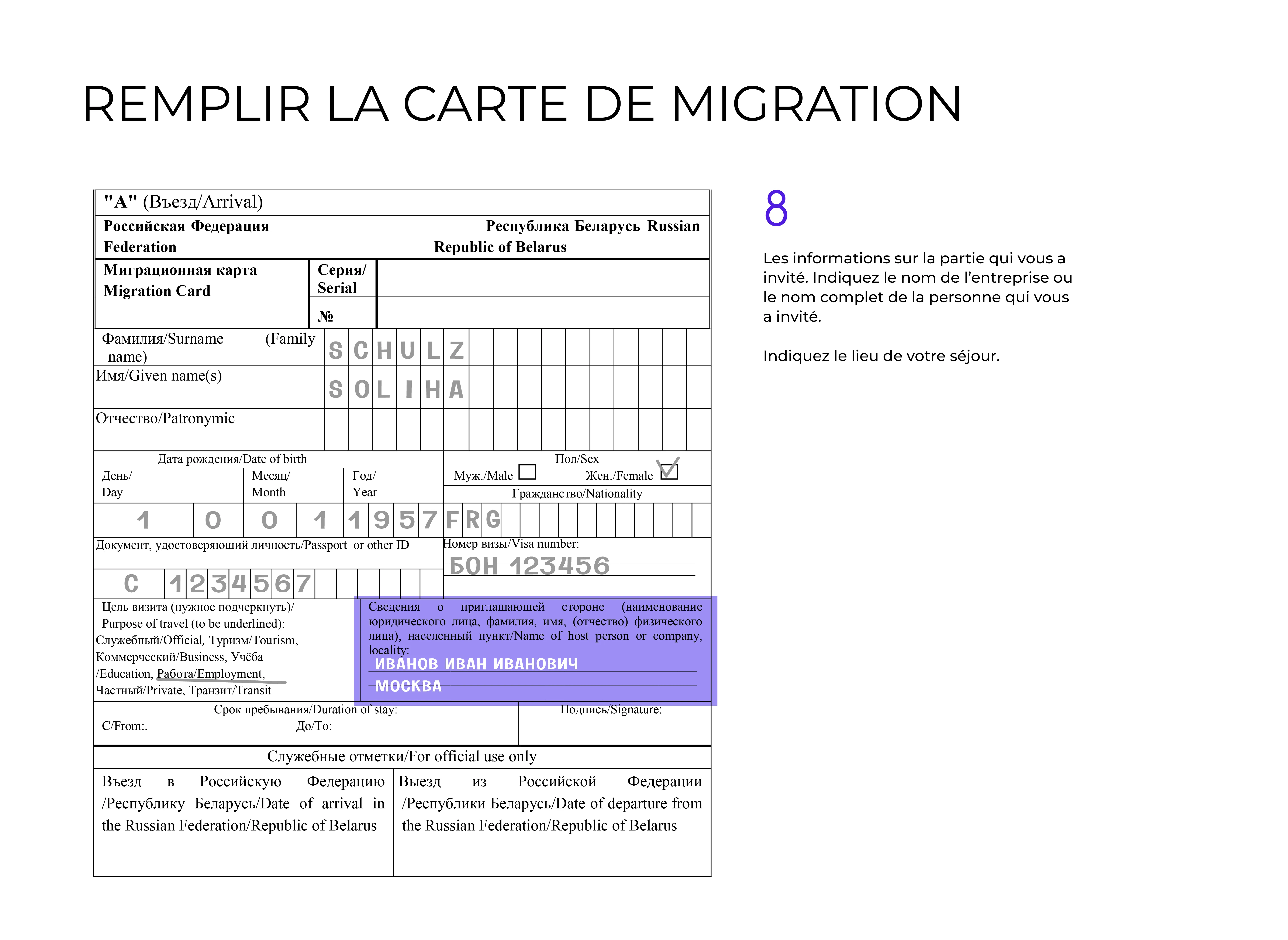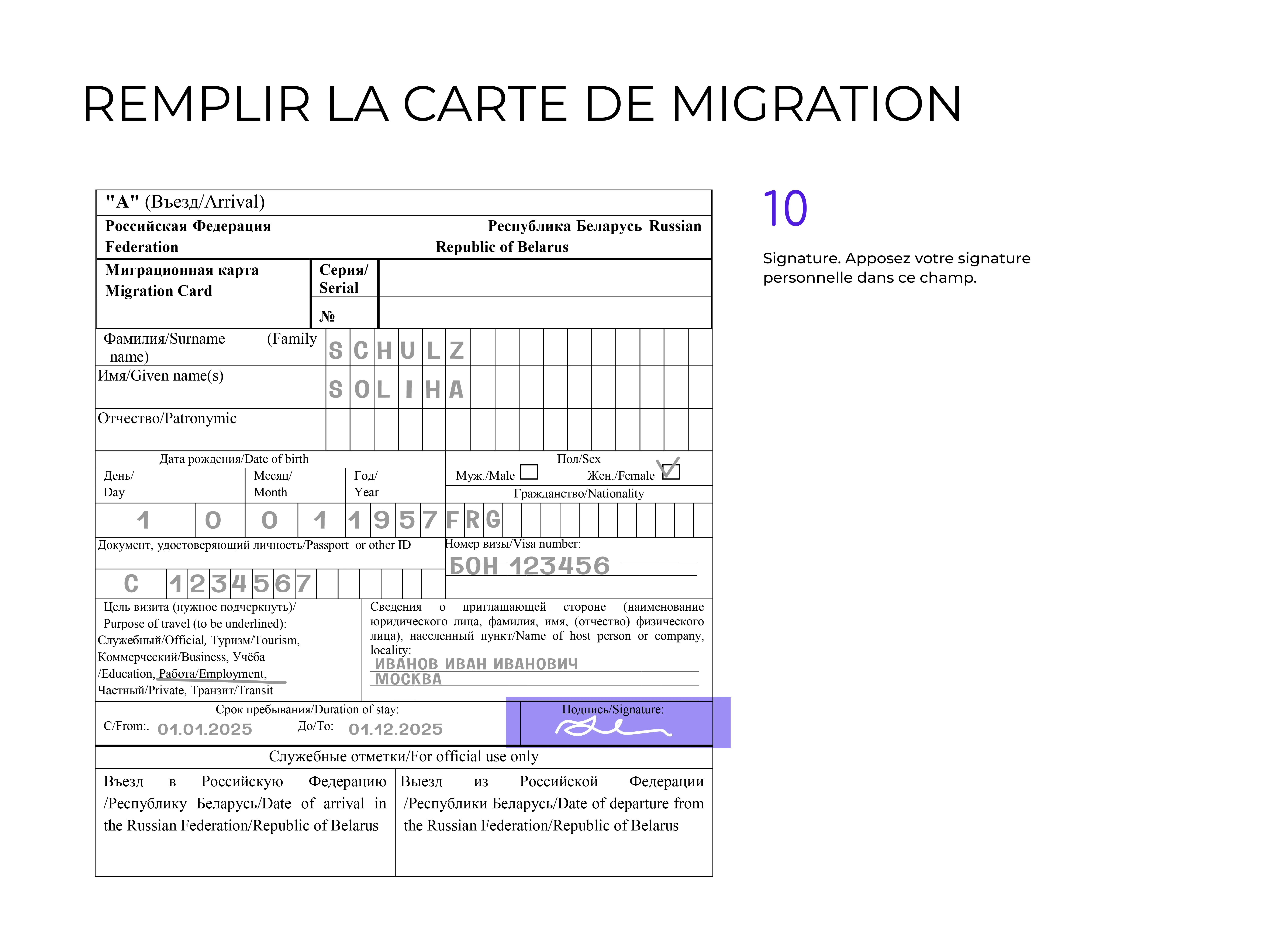 - Remplissez une carte de migration à votre arrivée et remettez-la à un agent officiel lorsque vous quittez le territoire de la Fédération de Russie.