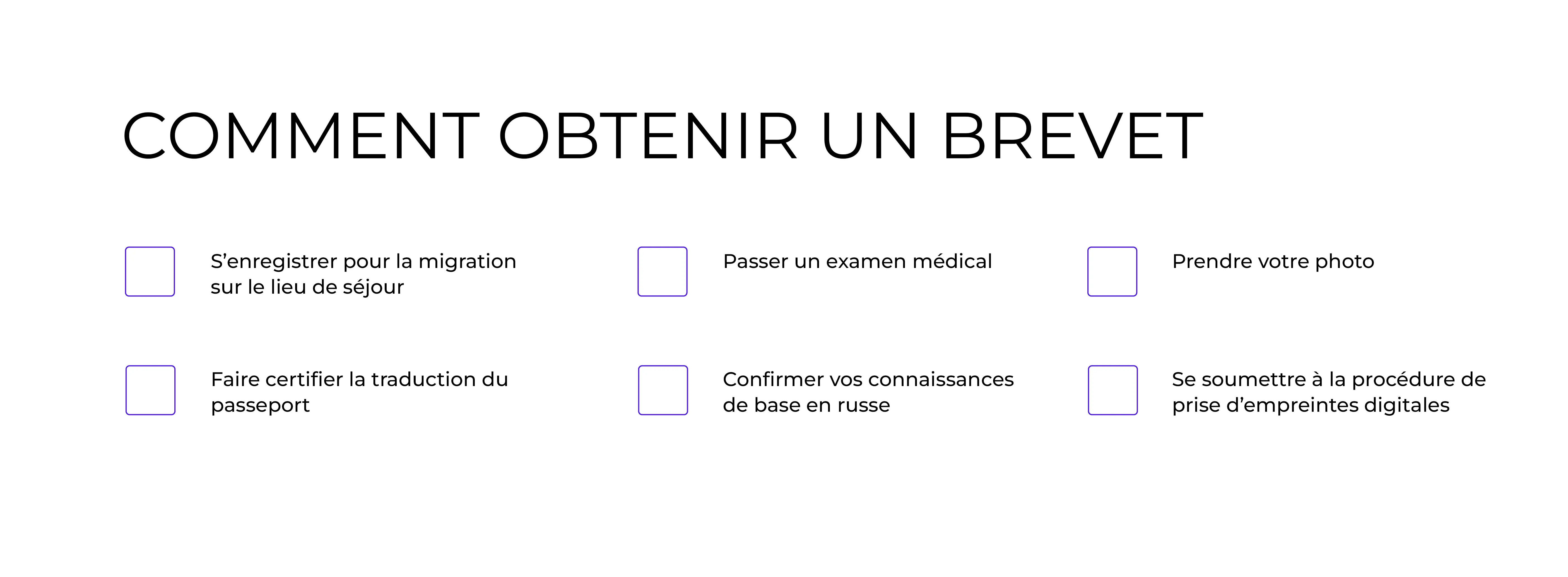 Pour obtenir un brevet, il faut s’enregistrer auprès des services d’immigration du lieu de séjour, obtenir une traduction certifiée conforme du passeport, passer un examen médical, confirmer ses connaissances de base en russe, se faire prendre en photo et se soumettre à une procédure de dactyloscopie. Le brevet et le permis de travail sont délivrés par les services d’immigration du ministère de l’Intérieur (МВД).