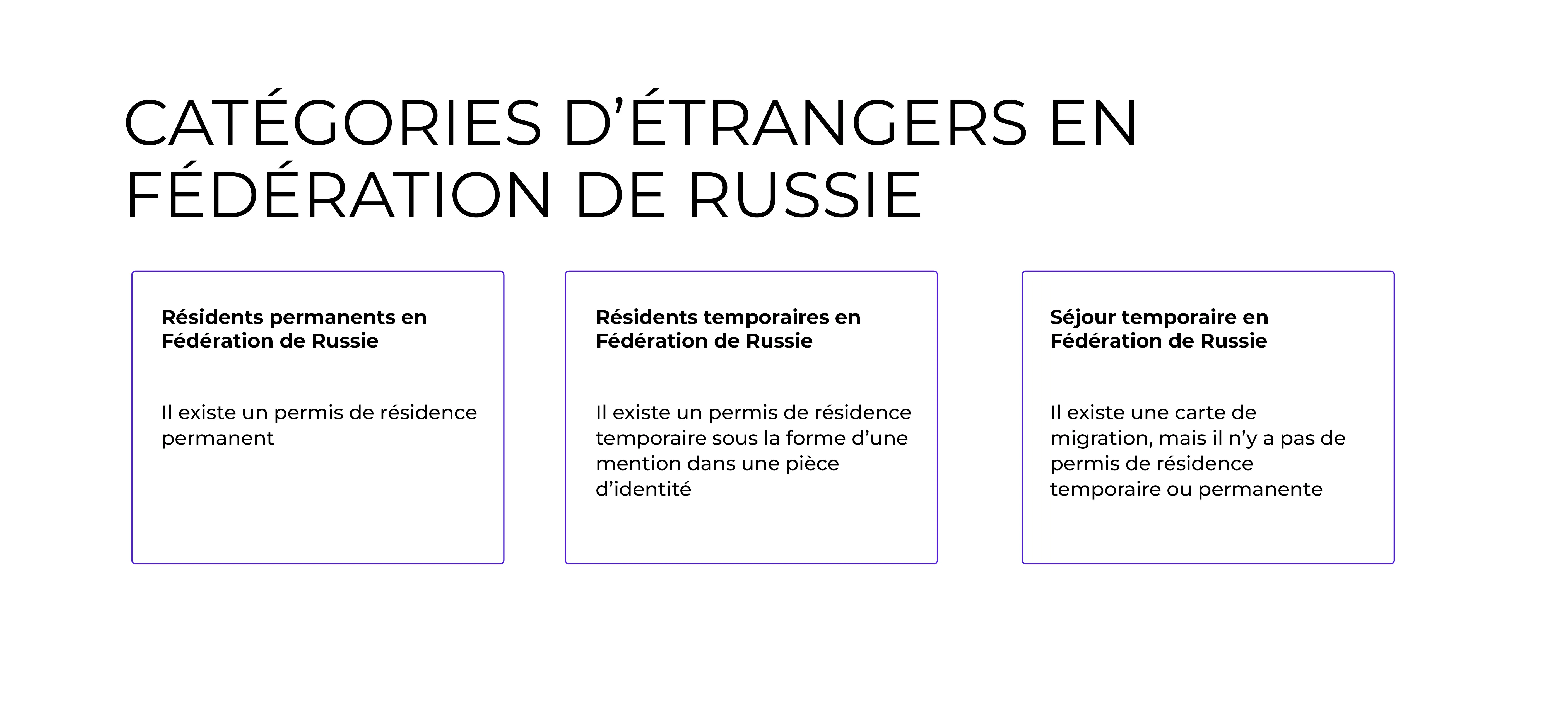 Selon la Constitution de la Fédération de Russie, les étrangers jouissent des mêmes droits que les citoyens russes, à l’exception de certains cas prévus par la législation fédérale ou les traités internationaux. Les citoyens étrangers qui séjournent sur le territoire de la Fédération de Russie sont répartis en 3 catégories :
