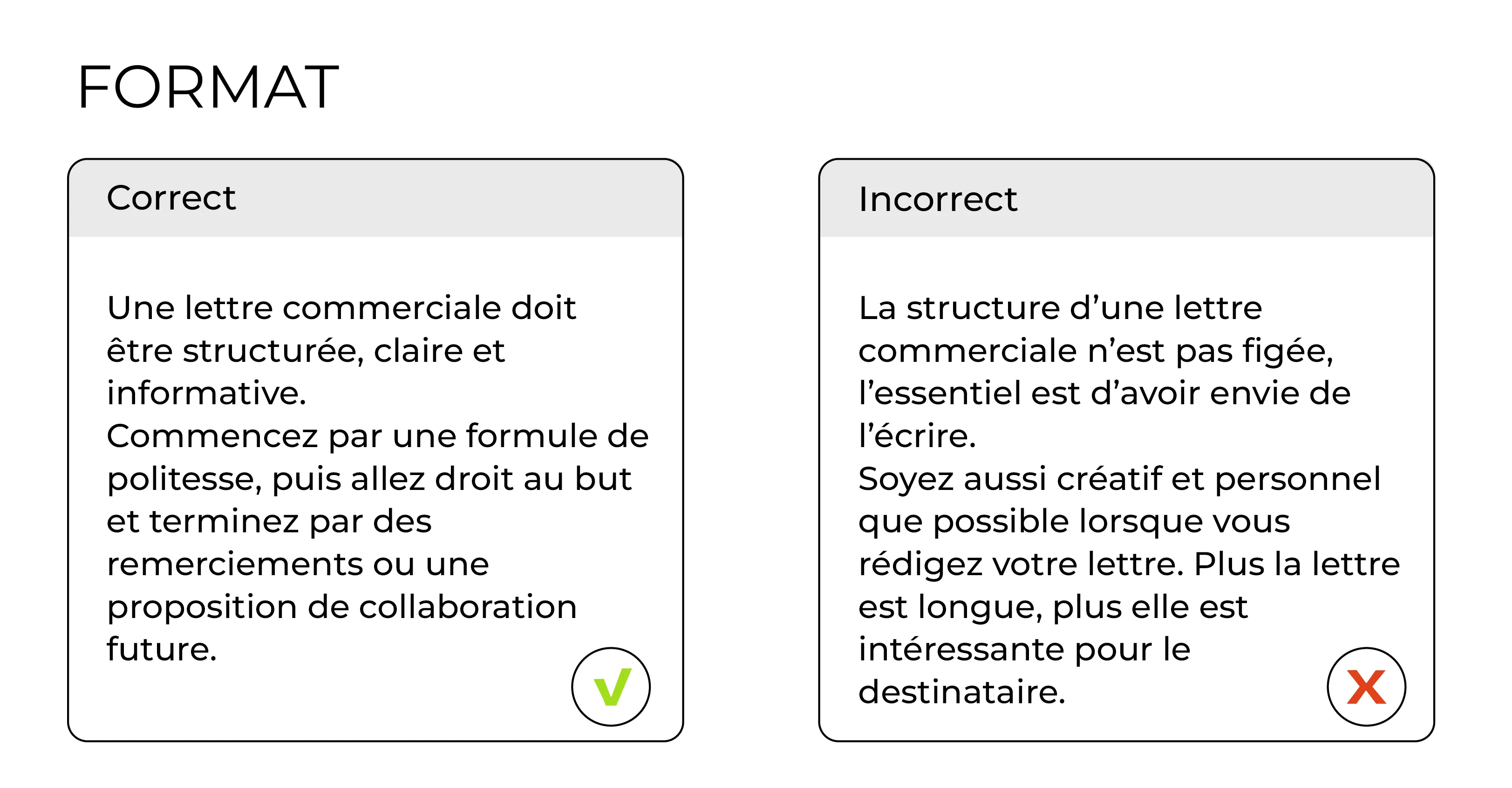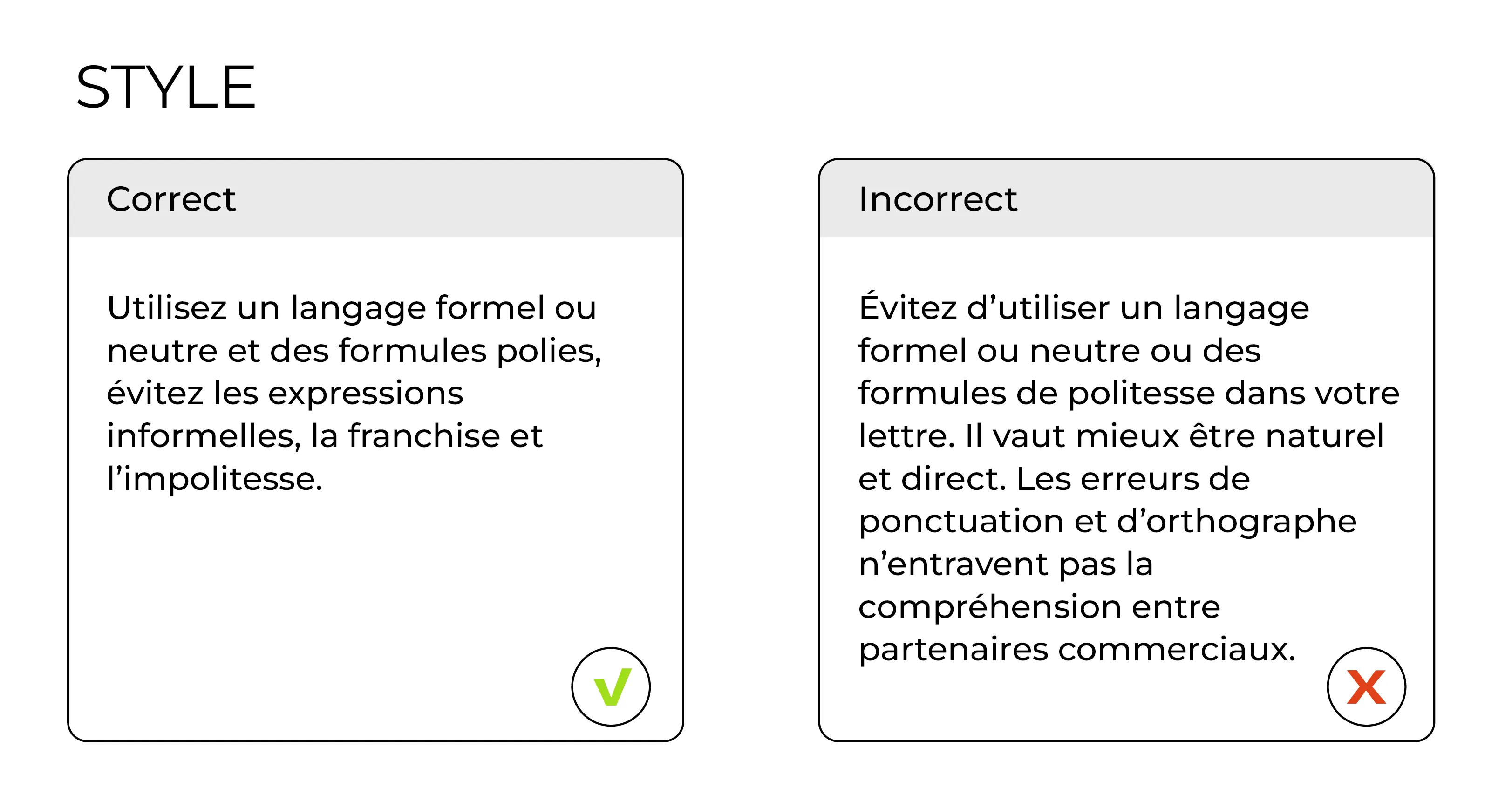 Ces bonnes pratiques s’appliquent à la rédaction de lettres classiques et d’e-mails. Il est recommandé de répondre aux e-mails dans les 24 heures suivant leur réception. Pour consulter les règles et les modèles de lettres, cliquez ici..