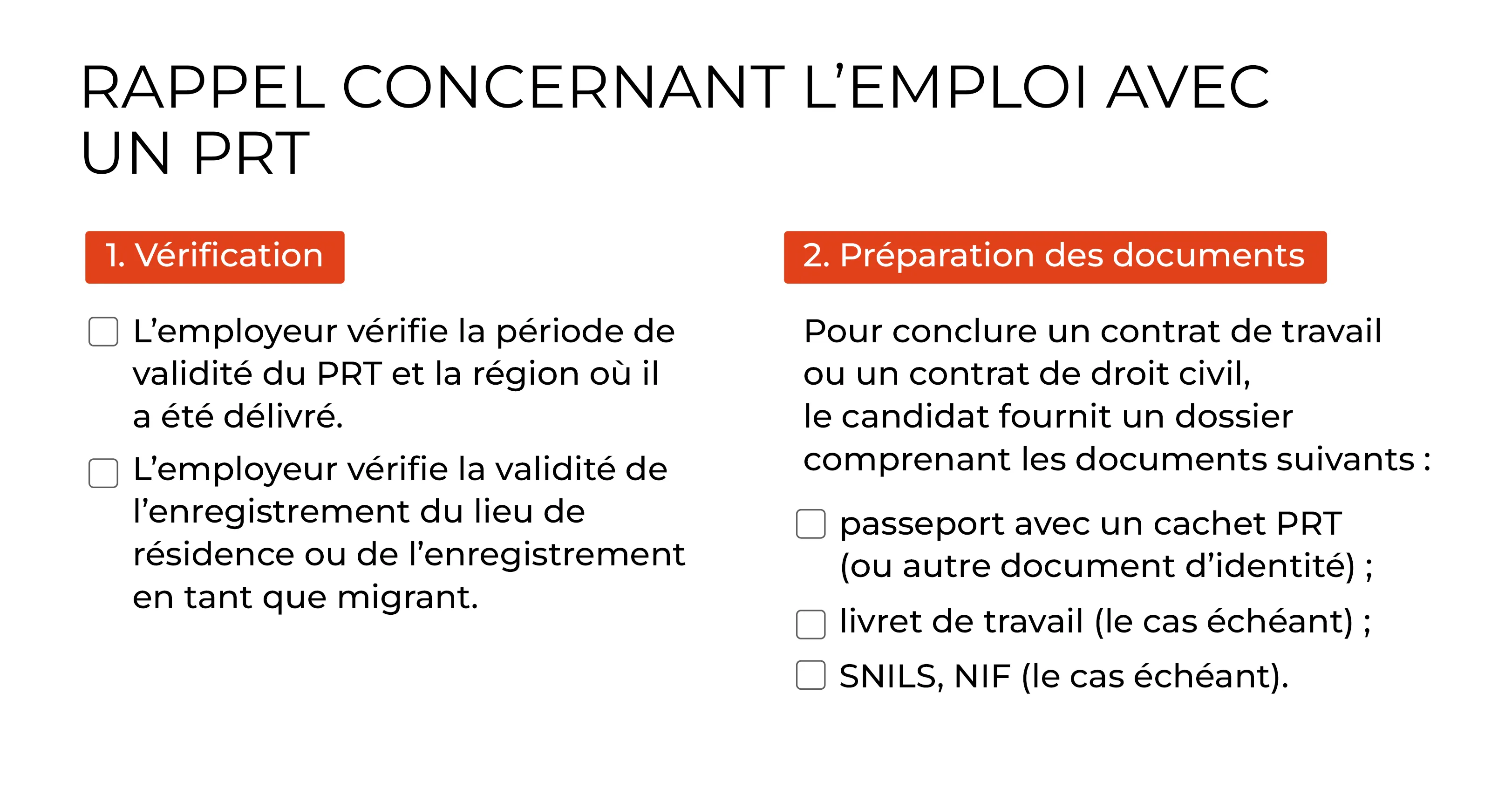 Si vous venez de Biélorussie, du Kazakhstan, d’Arménie ou du Kirghizistan, la procédure d’embauche sera la même que pour tout ressortissant russe. Vous devrez présenter votre carte de migration, votre permis de résidence temporaire (PRT) ou votre permis de résidence permanente (PRP). Les citoyens de la République de Biélorussie doivent uniquement présenter leur passeport biélorusse.
