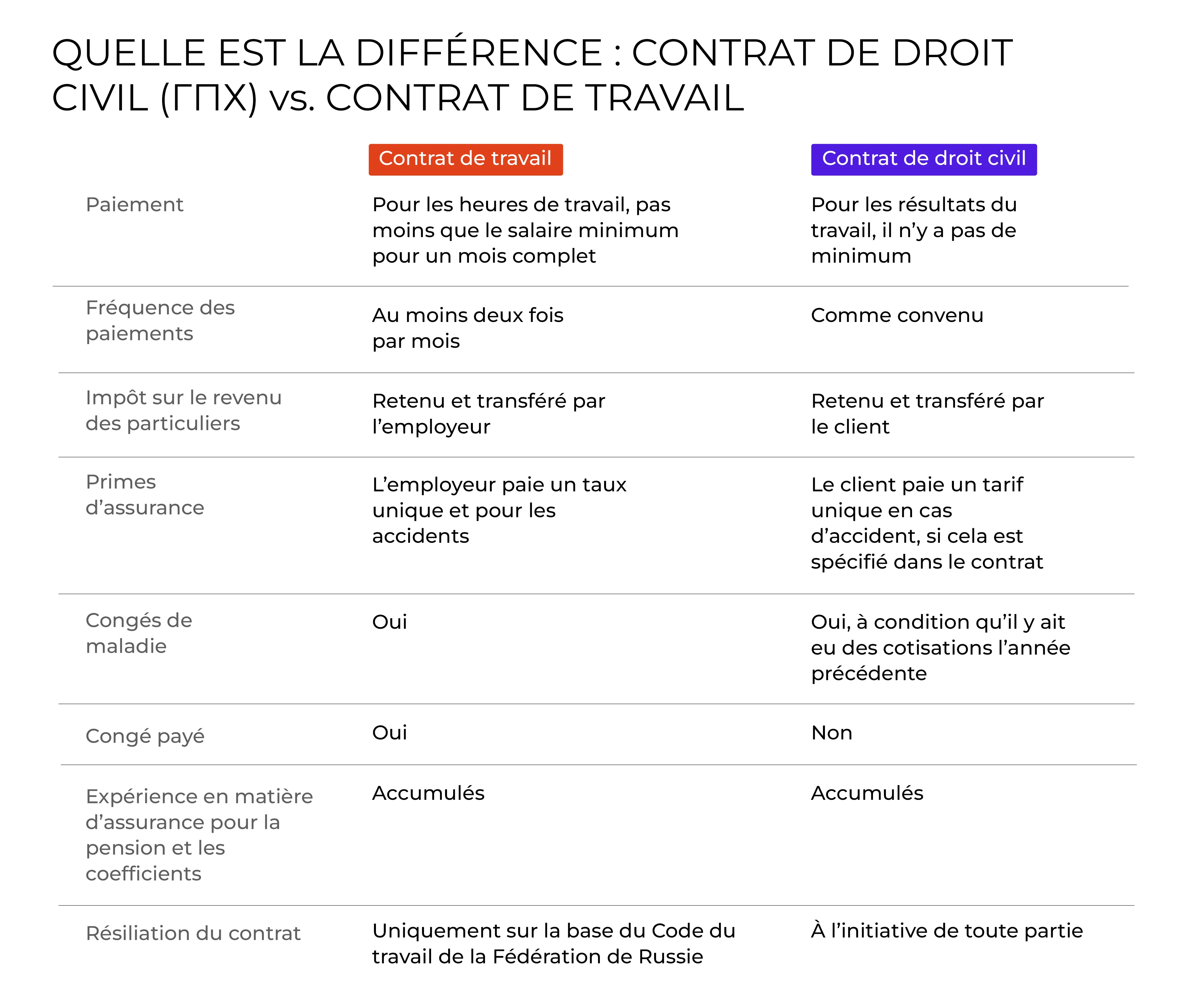 Un contrat de droit civil (ГПХ) diffère des autres contrats par l’absence d’un certain nombre de conditions essentielles (voir le tableau). C’est quelque chose à garder à l’esprit.