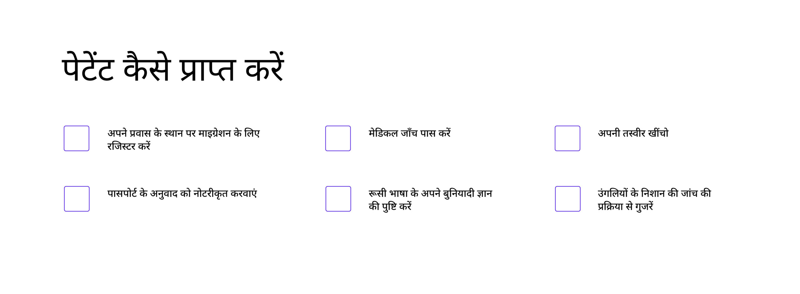 पेटेंट प्राप्त करने के लिए, प्रवास के स्थान पर माइग्रेशन रजिस्ट्रेशन कराना होता है, पासपोर्ट का नोटरीकृत अनुवाद कराना होता है, मेडिकल जाँच कराना होता है, रूसी भाषा के मूल ज्ञान की पुष्टि करनी होती है, फोटो खिंचवानी होती है और डैक्टिलोस्कोपी प्रक्रिया से गुजरना पड़ता है। पेटेंट और वर्क परमिट दोनों आंतरिक मामलों के मंत्रालय (МВД) की प्रवासन इकाइयों द्वारा जारी किए जाते हैं।