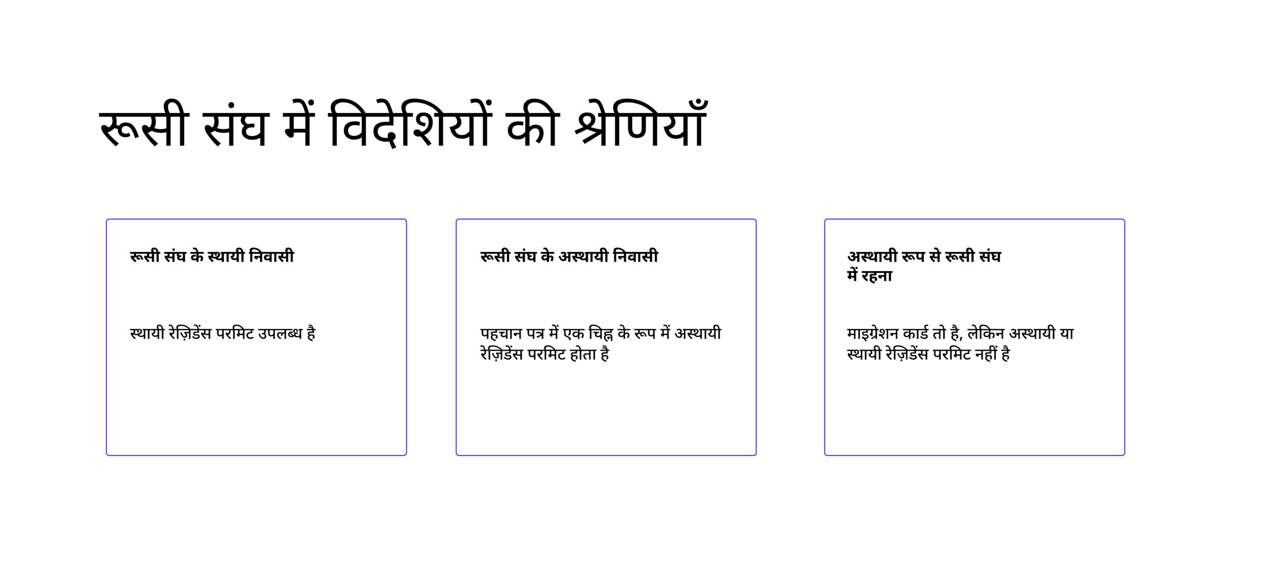 रूसी संघ के संविधान के अनुसार, संघीय कानून या अंतर्राष्ट्रीय संधि द्वारा तय किए गए कुछ मामलों को छोड़कर, विदेशियों को रूसी नागरिकों के समान अधिकार प्राप्त हैं। रूसी संघ के क्षेत्र में रहने वाले विदेशी नागरिकों को 3 श्रेणियों में बांटा गया है: