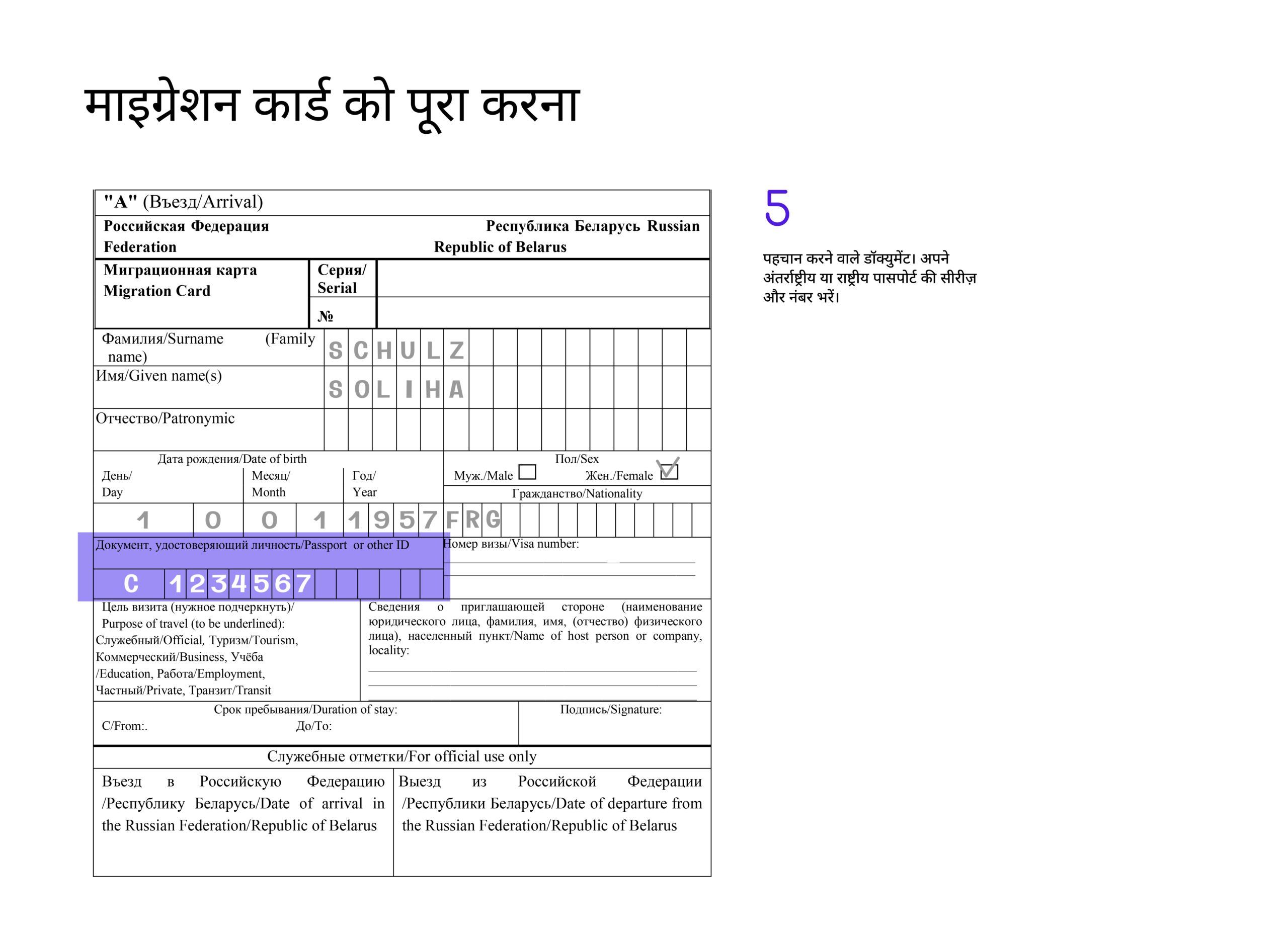 डॉक्युमेंट को रूसी भाषा में भरना बेहतर होता है, लेकिन इसे अंग्रेजी अक्षरों में भी भरा जा सकता है।