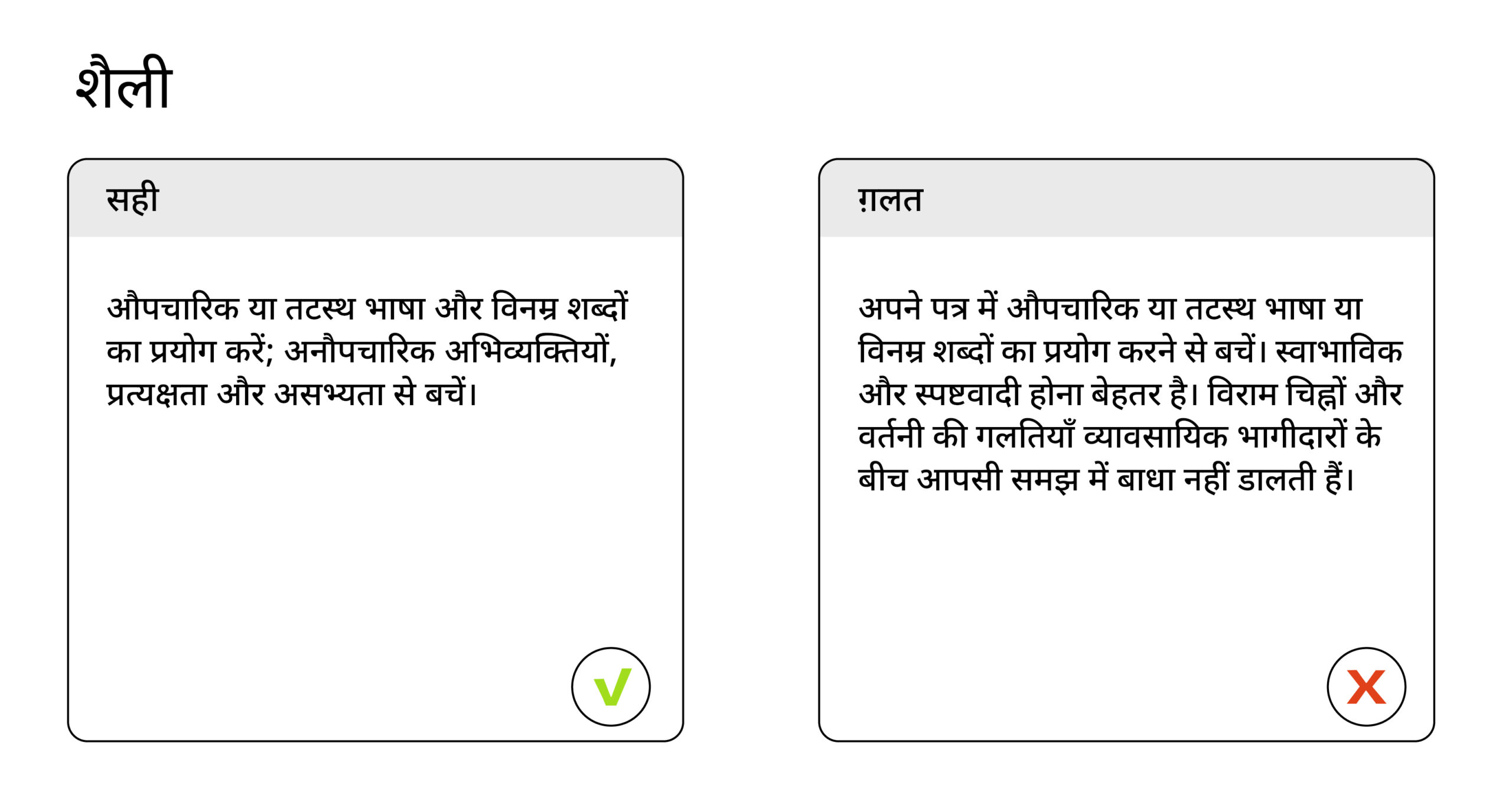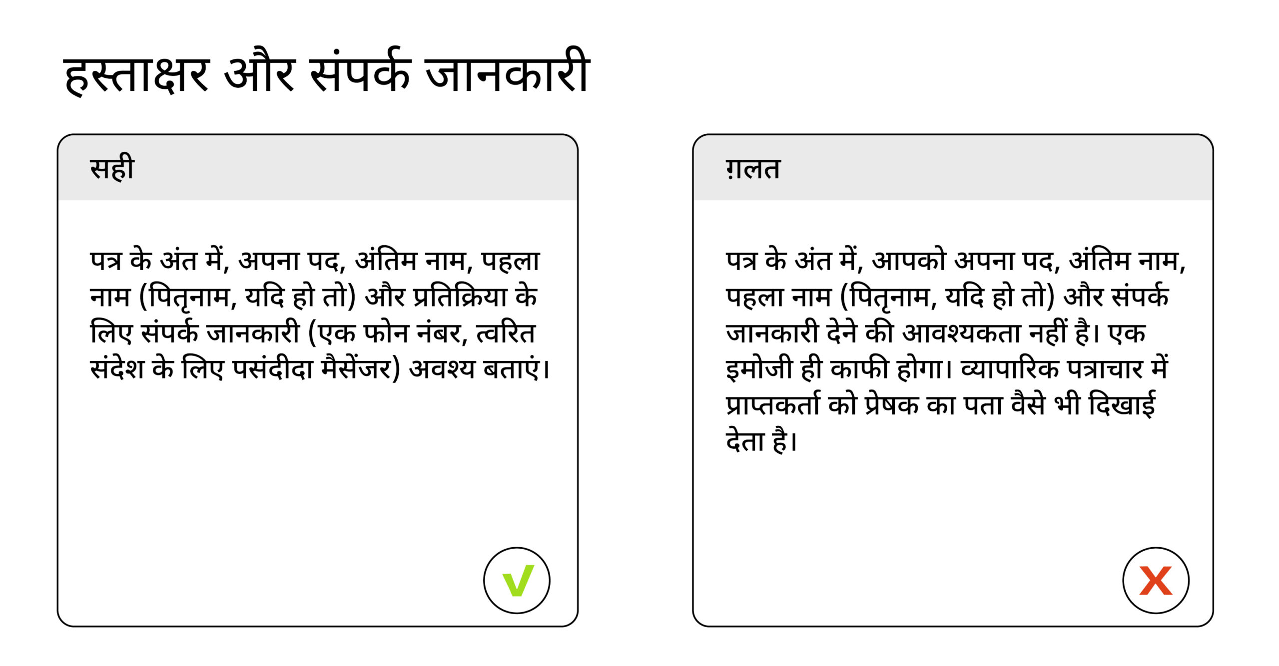 ये सर्वोत्तम प्रेक्टिस नियमित लेटर और ई-मेल दोनों लिखने पर लागू होती हैं। यह अनुशंसा की जाती है कि ई-मेल का उत्तर प्राप्ति के 24 घंटे के भीतर दिया जाए। नियमों और नमूना लेटर पर करीब से नज़र डालने के लिए, यहाँ क्लिक करें।.