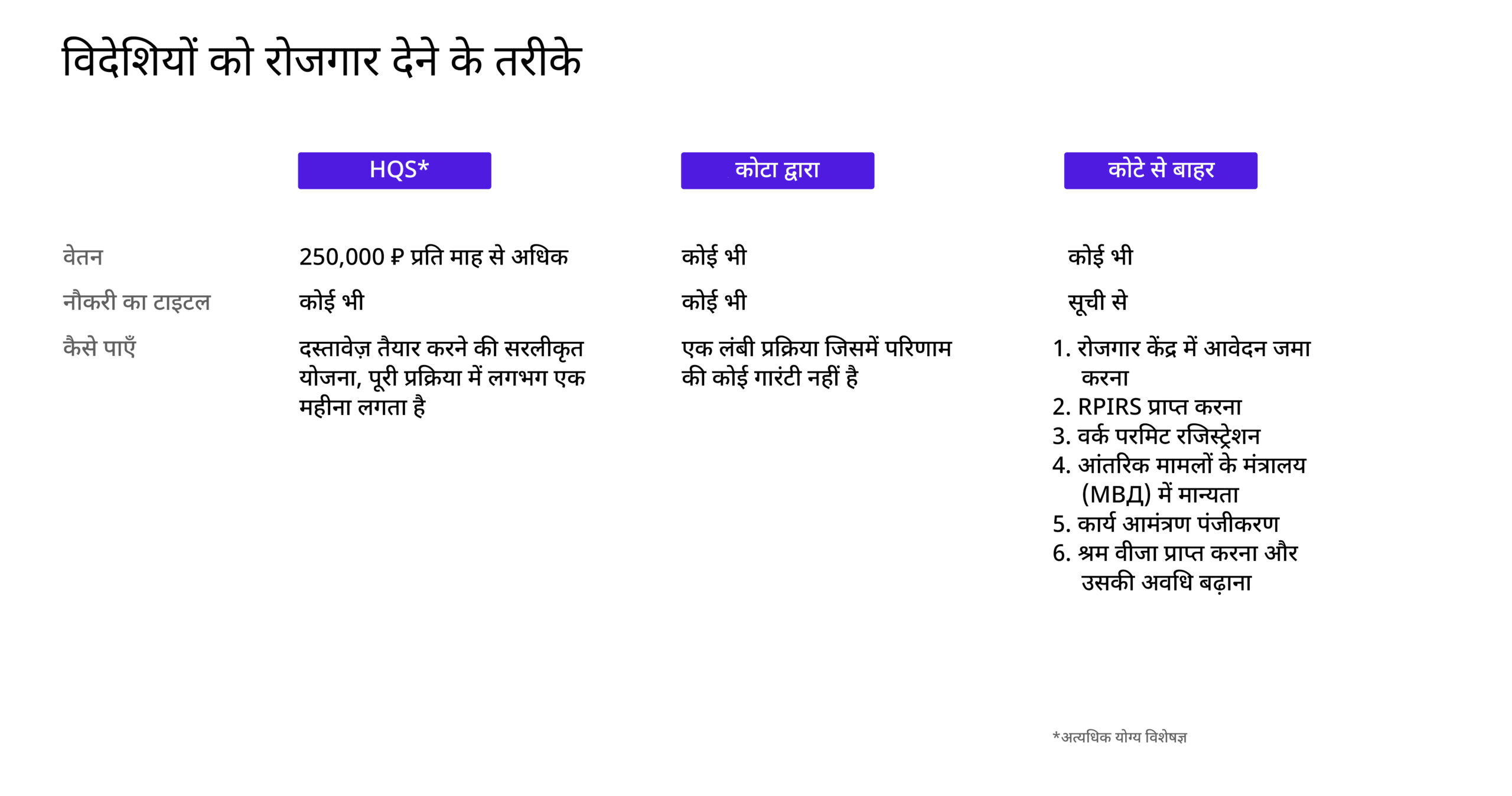 उच्च योग्यता प्राप्त कार्मिकों के लिए उपयुक्त। 3 वर्ष तक की रोजगार अवधि, तथा कर-पूर्व वेतन 3 मिलियन रूबल प्रति वर्ष से शुरू। आपके साथ एक रोजगार अनुबंध या सिविल कानून अनुबंध (ГПХ) संपन्न किया जाएगा। कृपया अपवादों का ध्यान रखें। आप एकल उद्यमियों (आईई), आध्यात्मिक संगठनों (धार्मिक और शैक्षिक), प्रीस्कूल संगठनों (किंडरगार्टन, नर्सरी, बच्चों के अस्थायी प्रवास के समूह) और स्कूली शिक्षा के लिए काम नहीं करेंगे। आपको नौकरी वीज़ा और वर्क परमिट की आवश्यकता होगी।