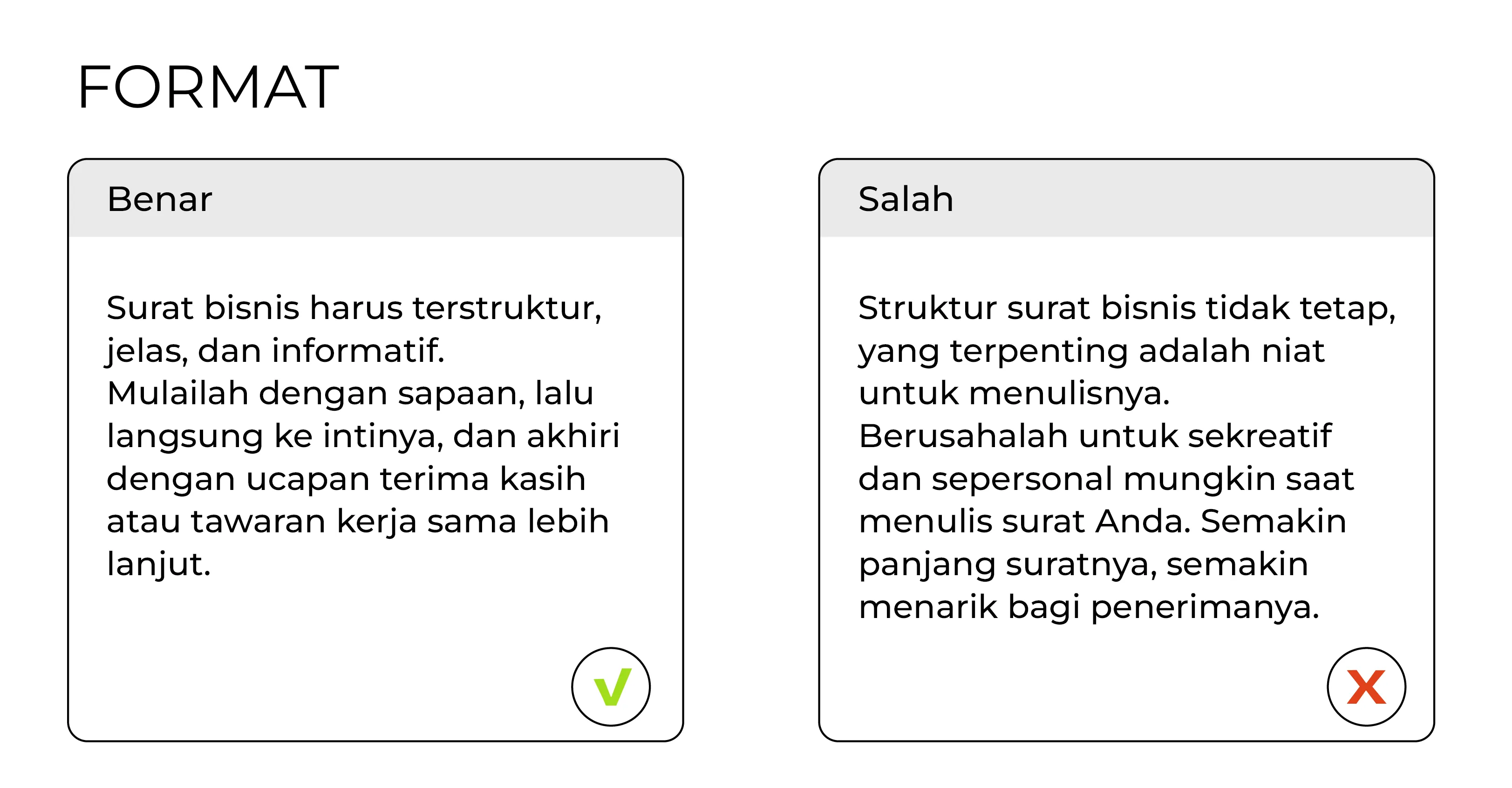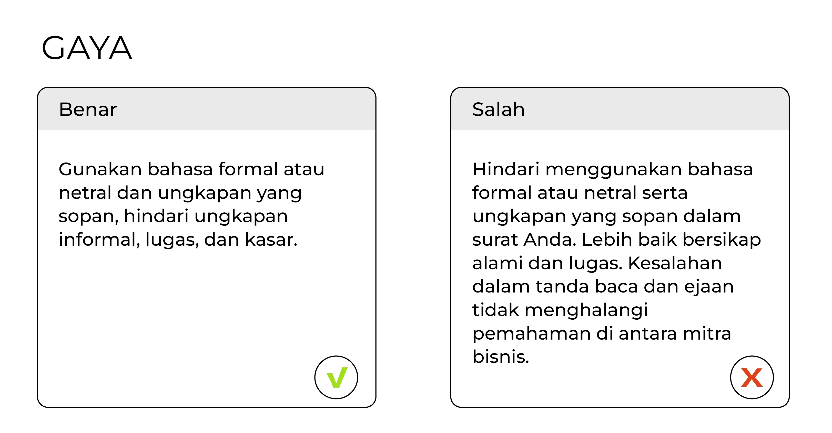 Praktik terbaik ini berlaku untuk menulis surat biasa dan email. Sebaiknya email ditanggapi dalam waktu 24 jam setelah diterima. Untuk mempelajari lebih lanjut terkait aturan dan contoh surat, klik di sini..