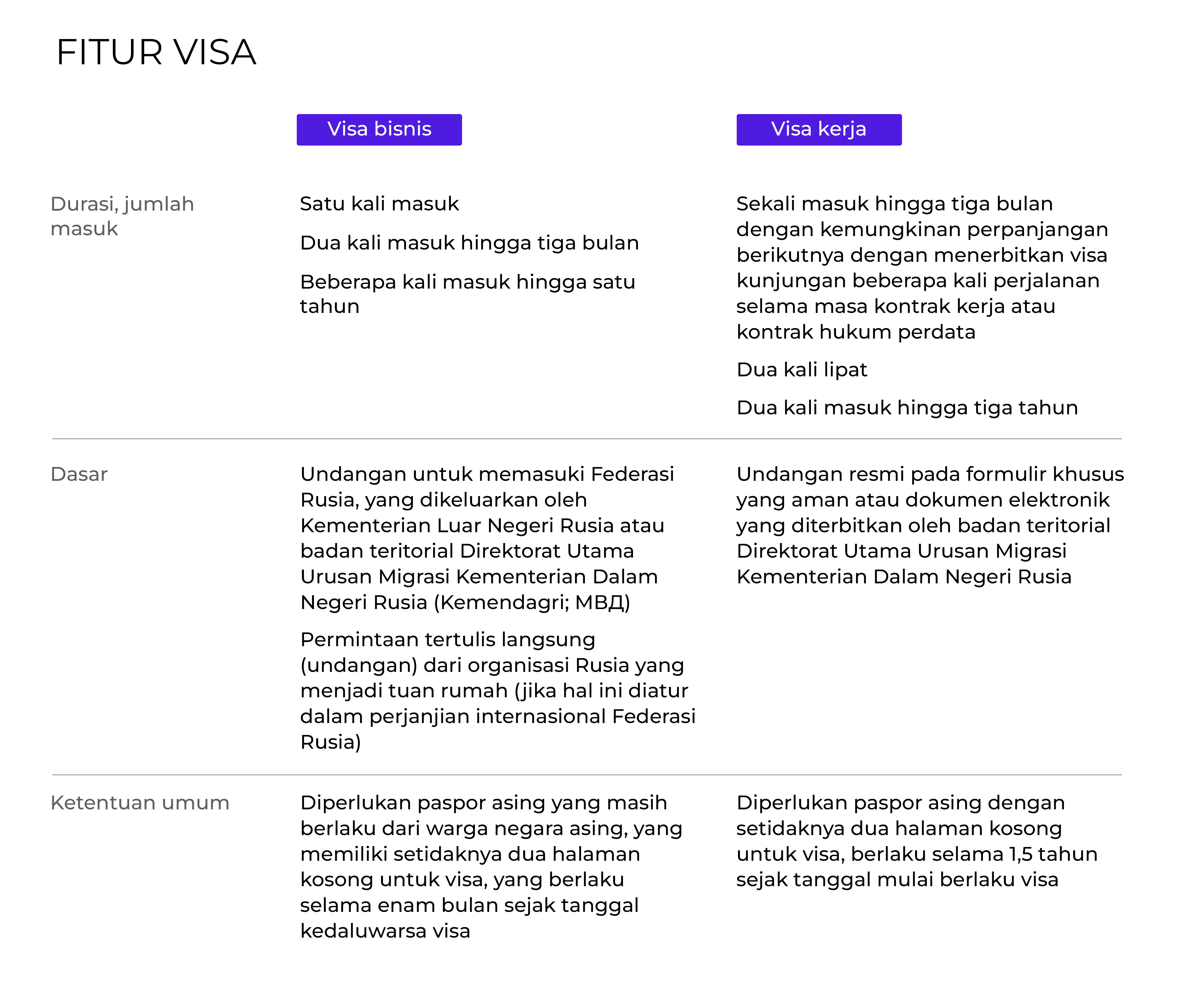 Terdapat lebih dari 10 jenis visa yang dapat digunakan oleh warga negara asing untuk memasuki Rusia. Beberapa yang paling umum adalah visa bisnis dan visa kerja. Tabel di bawah ini merangkum fitur utamanya.