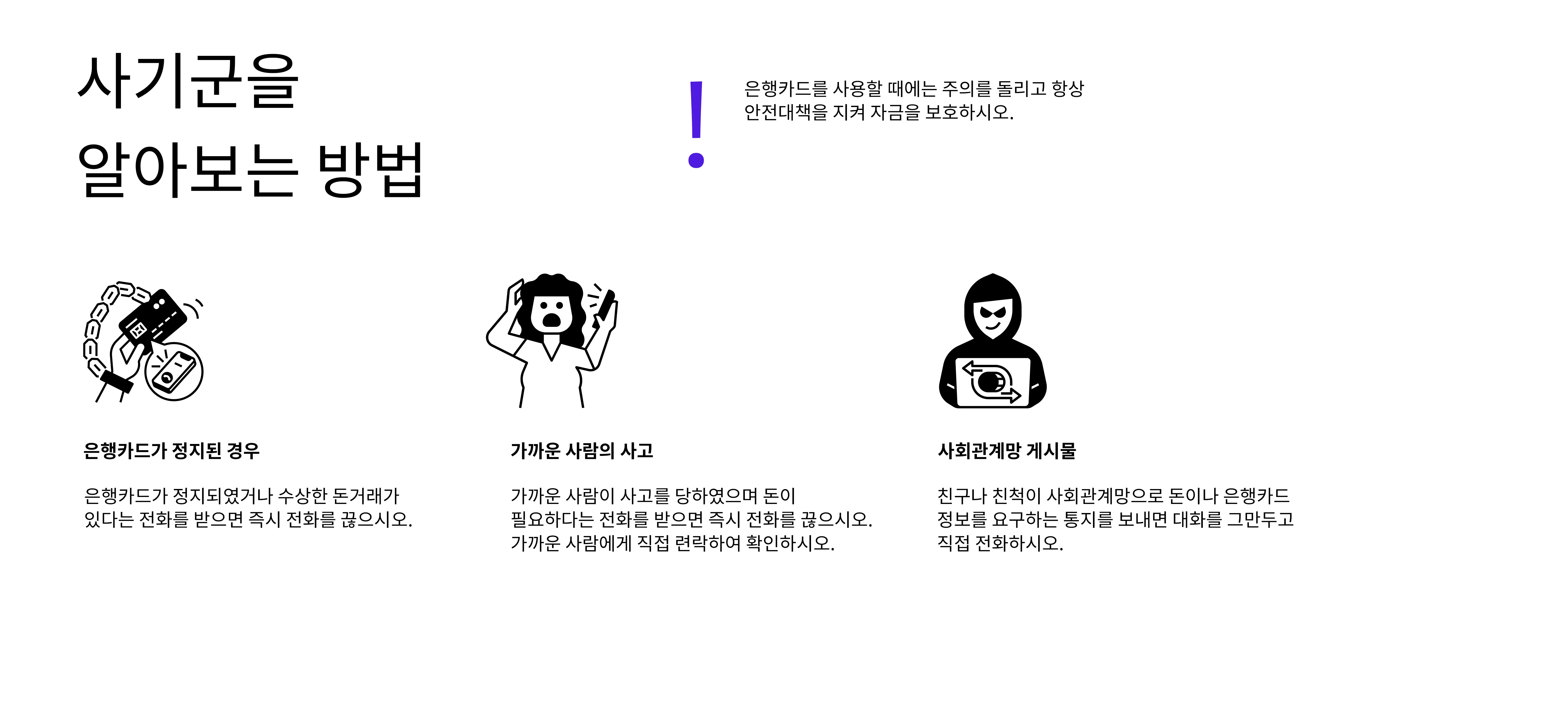 - 모든 신용카드 및 송금 거래는 공식 결제 서비스 및 은행 앱을 통해서만 이루어져야 합니다.