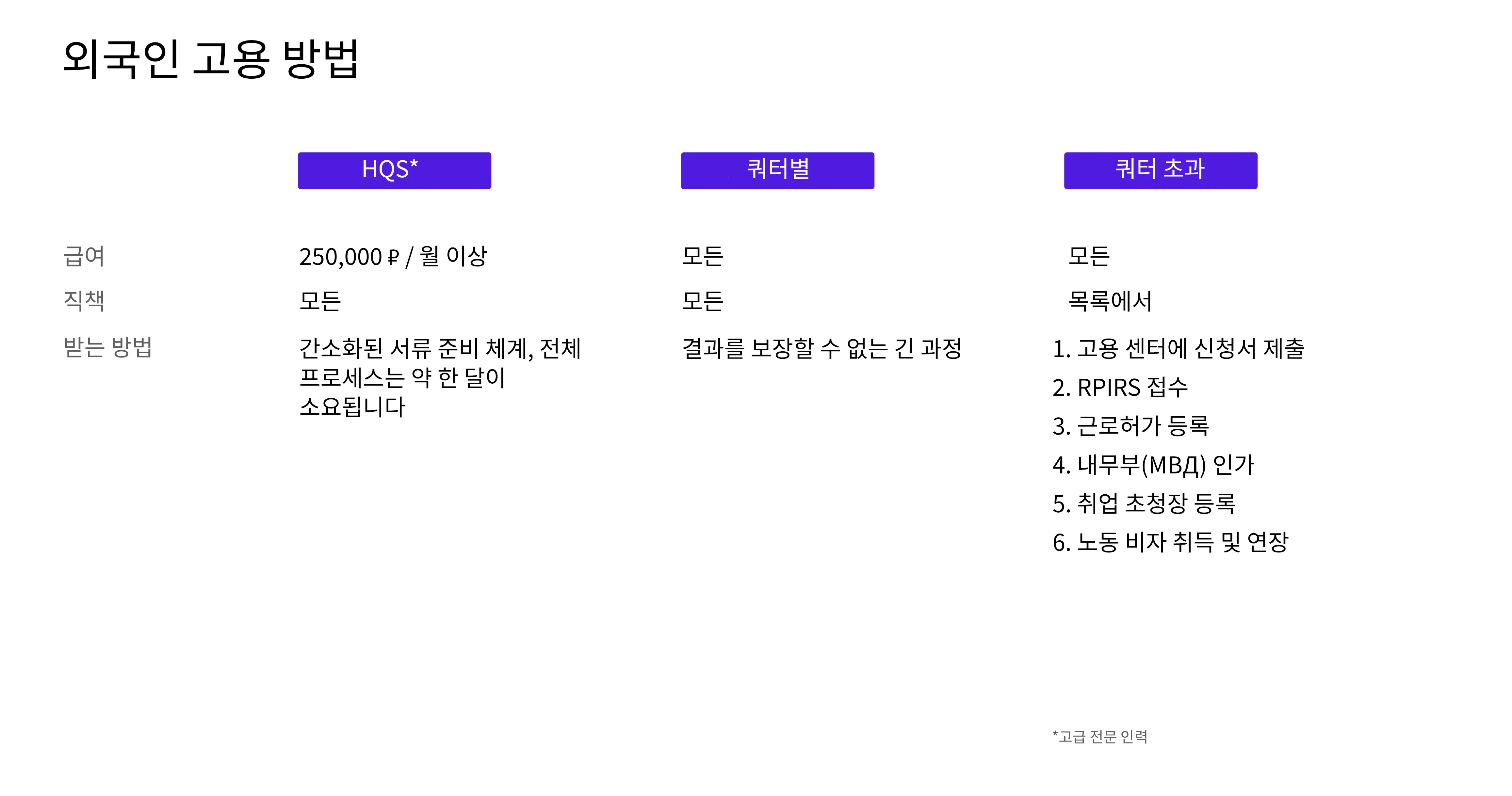 고도의 자격을 갖춘 직원에게 적합. 고용 기간은 최대 3년, 세전 급여는 연간 300만 루블부터 시작됩니다. 귀하와 고용 계약 또는 민법상 계약(CLC)을 체결합니다. 예외 사항에 유의하세요. 개인 사업자(IE), 영적 조직(종교 및 교육), 유치원(유치원, 보육원, 어린이 시간제 보육 그룹) 및 학교 교육 기관에서 일해서는 안 됩니다. 취업 비자와 근로허가가 필요합니다.