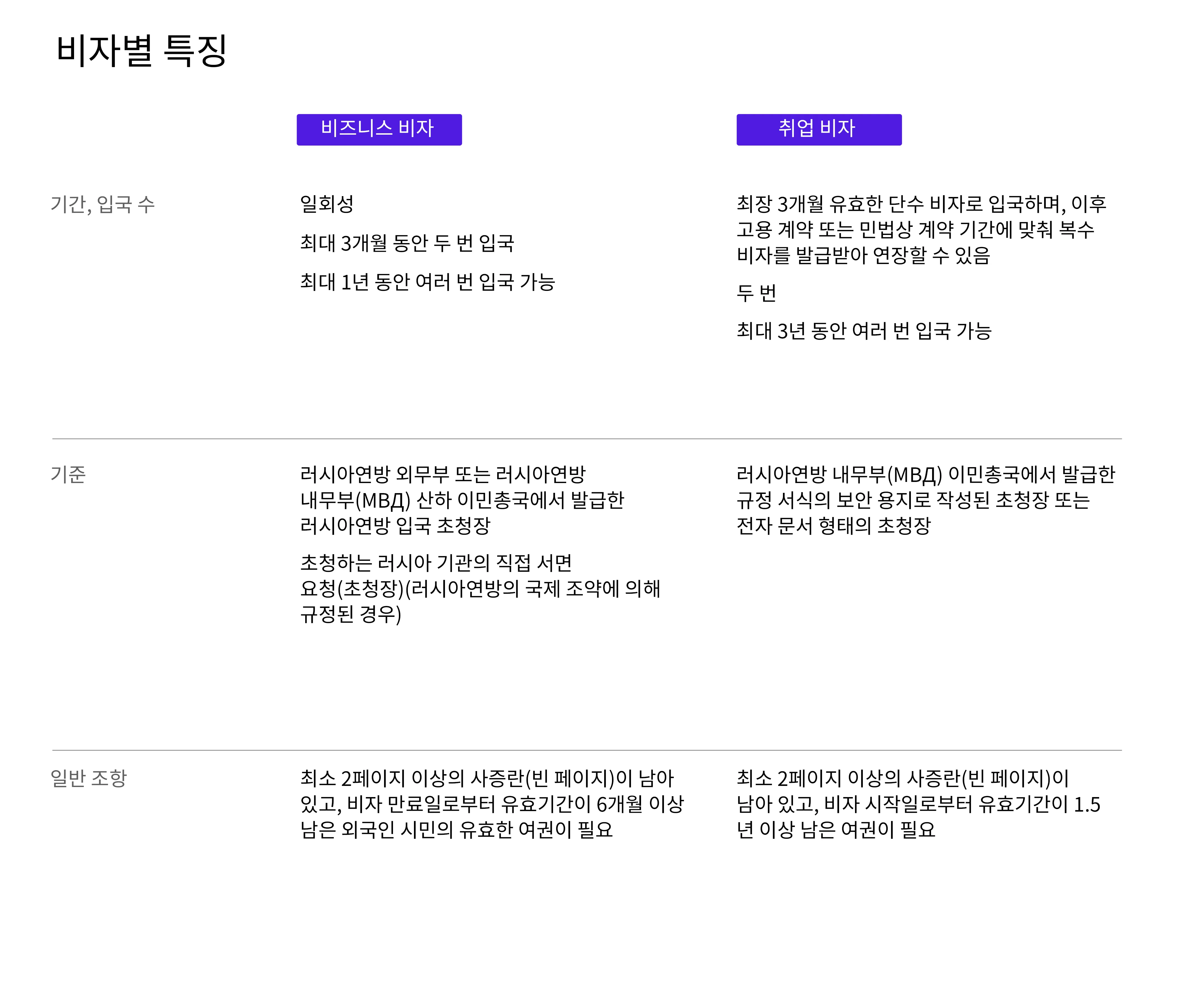 외국인이 러시아에 입국할 수 있는 비자의 종류는 10가지가 넘습니다. 가장 일반적인 것은 비즈니스 및 취업 비자입니다. 아래 표에는 주요 기능이 요약되어 있습니다.