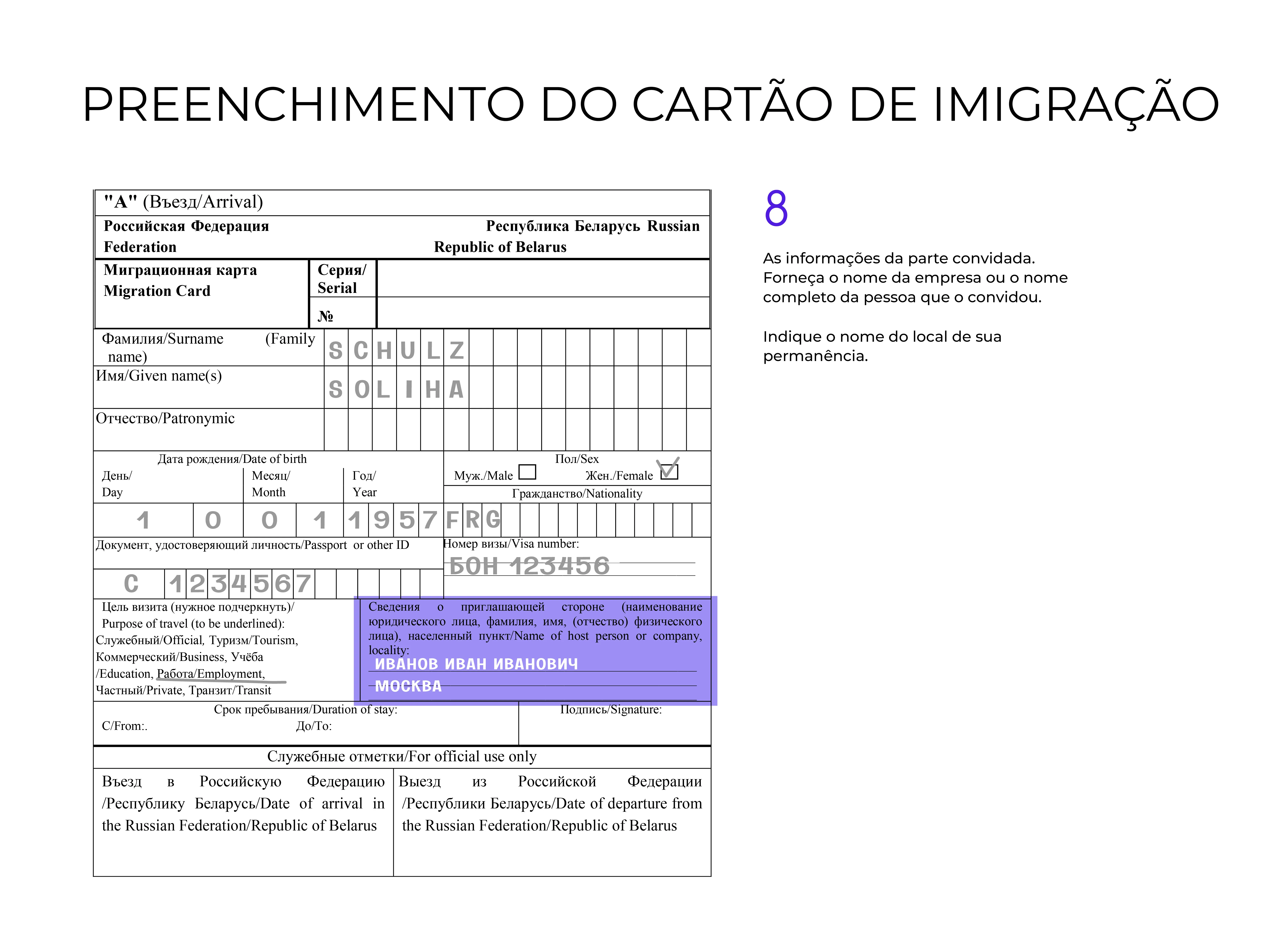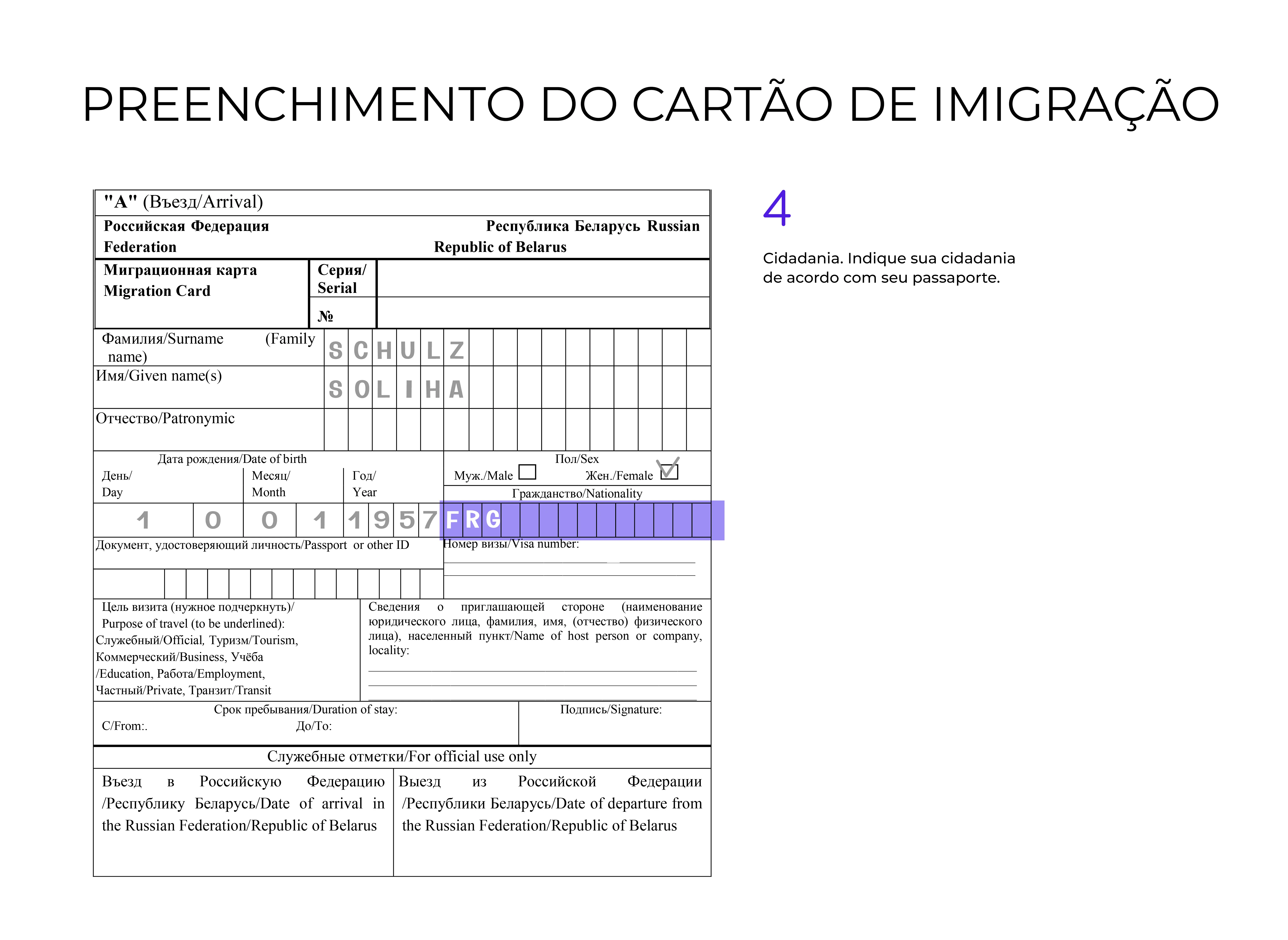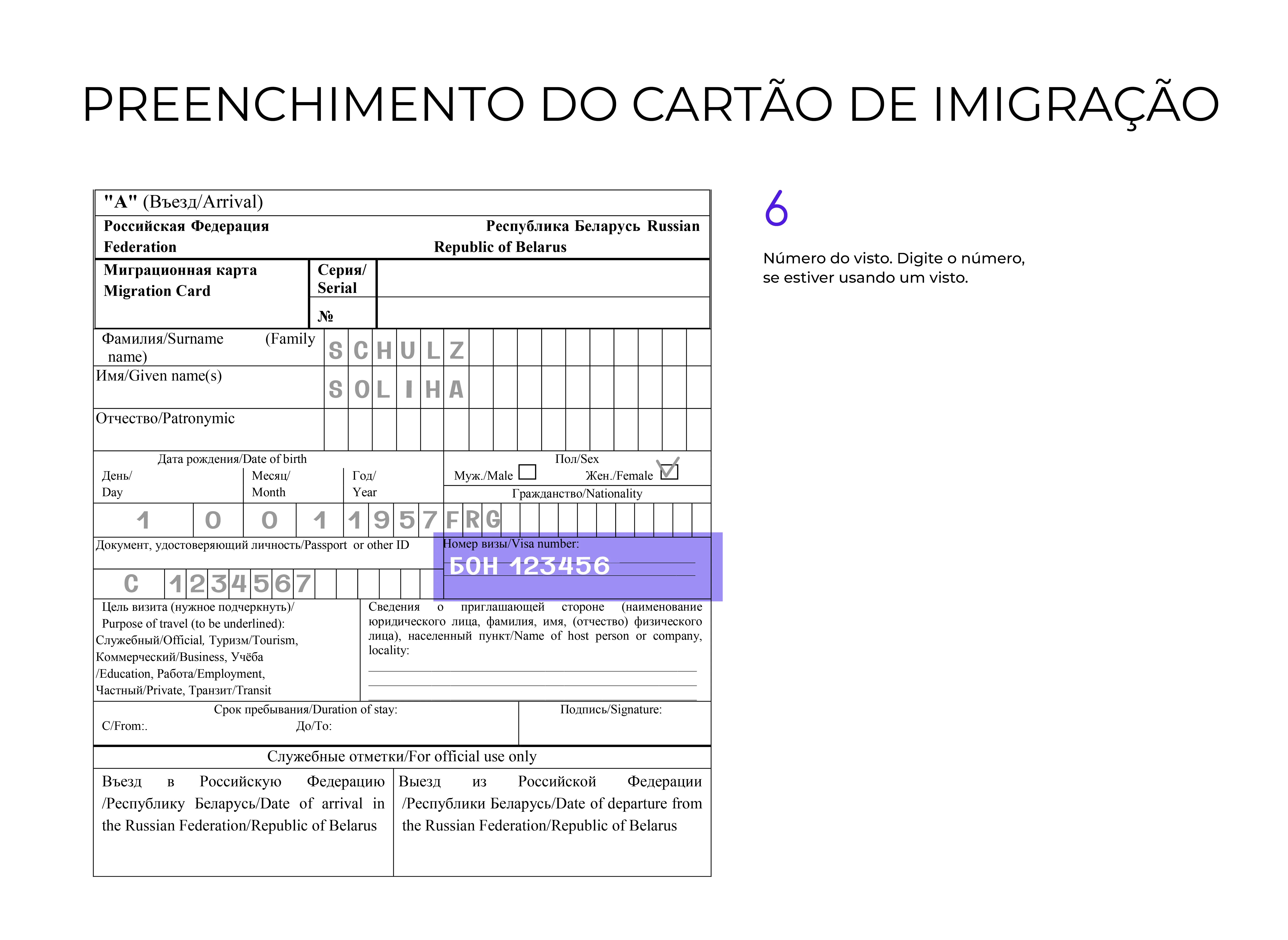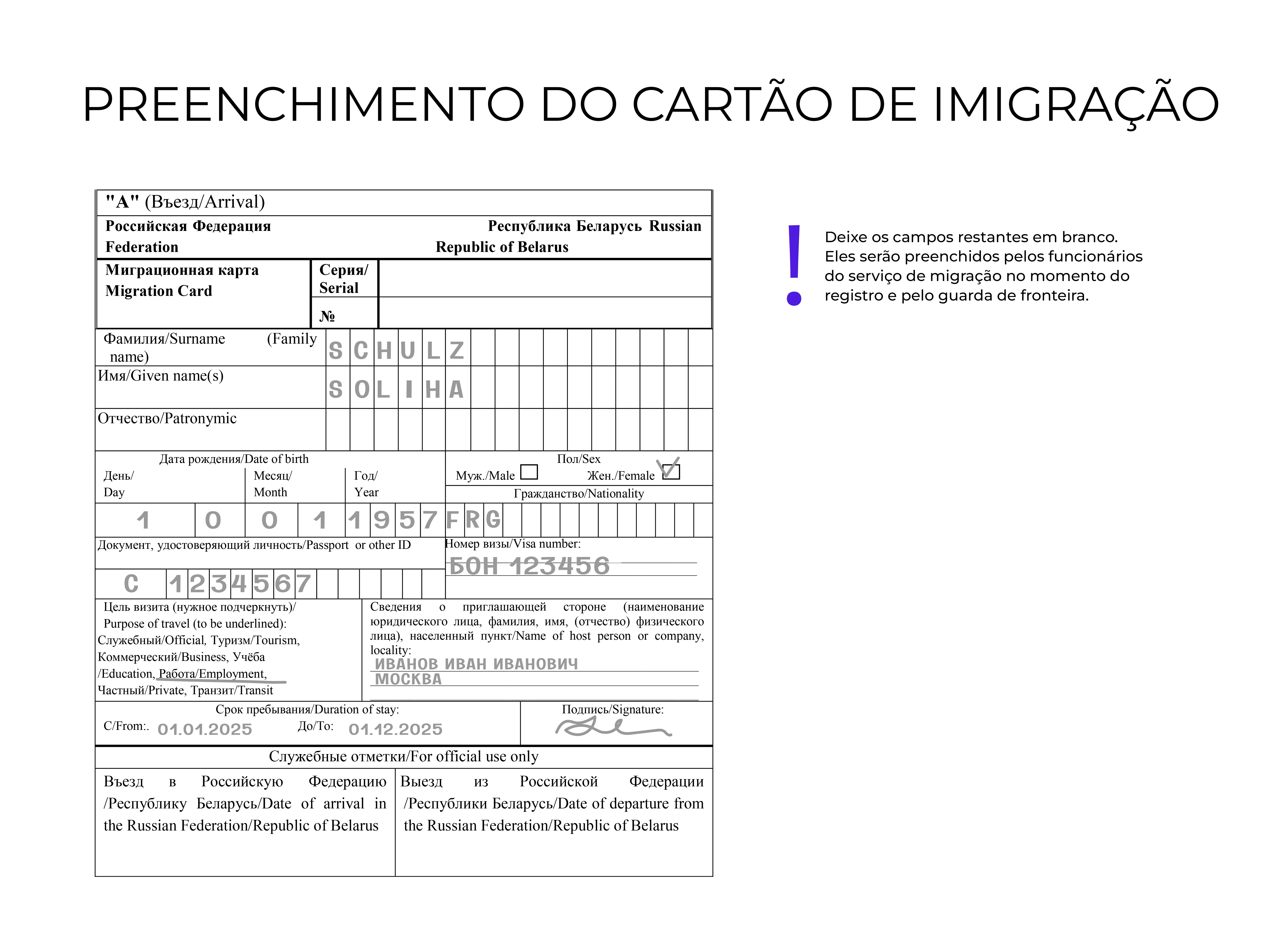 - Preencha um cartão de imigração ao entrar e entregue-o a um funcionário ao sair do território da Federação da Rússia.