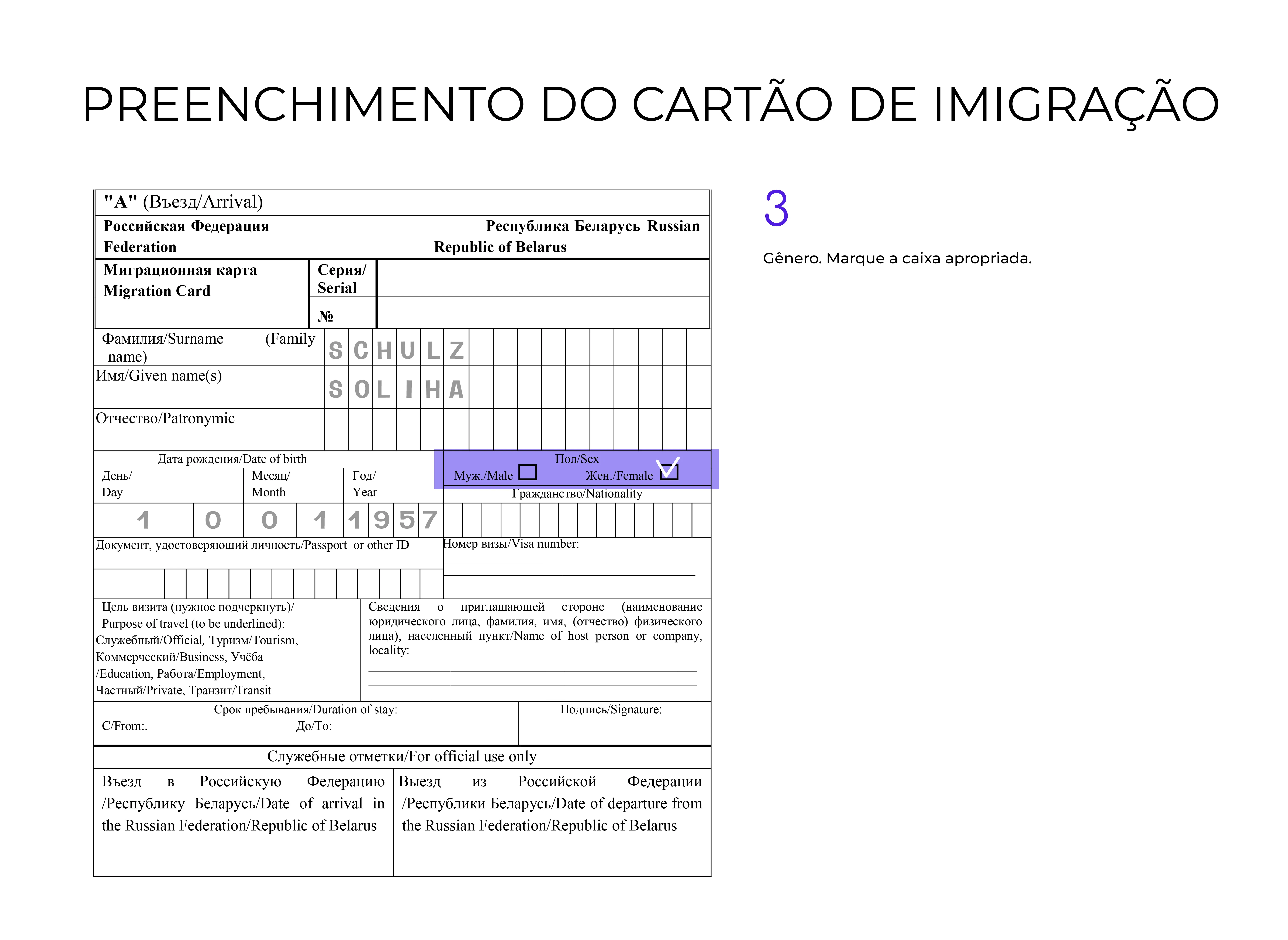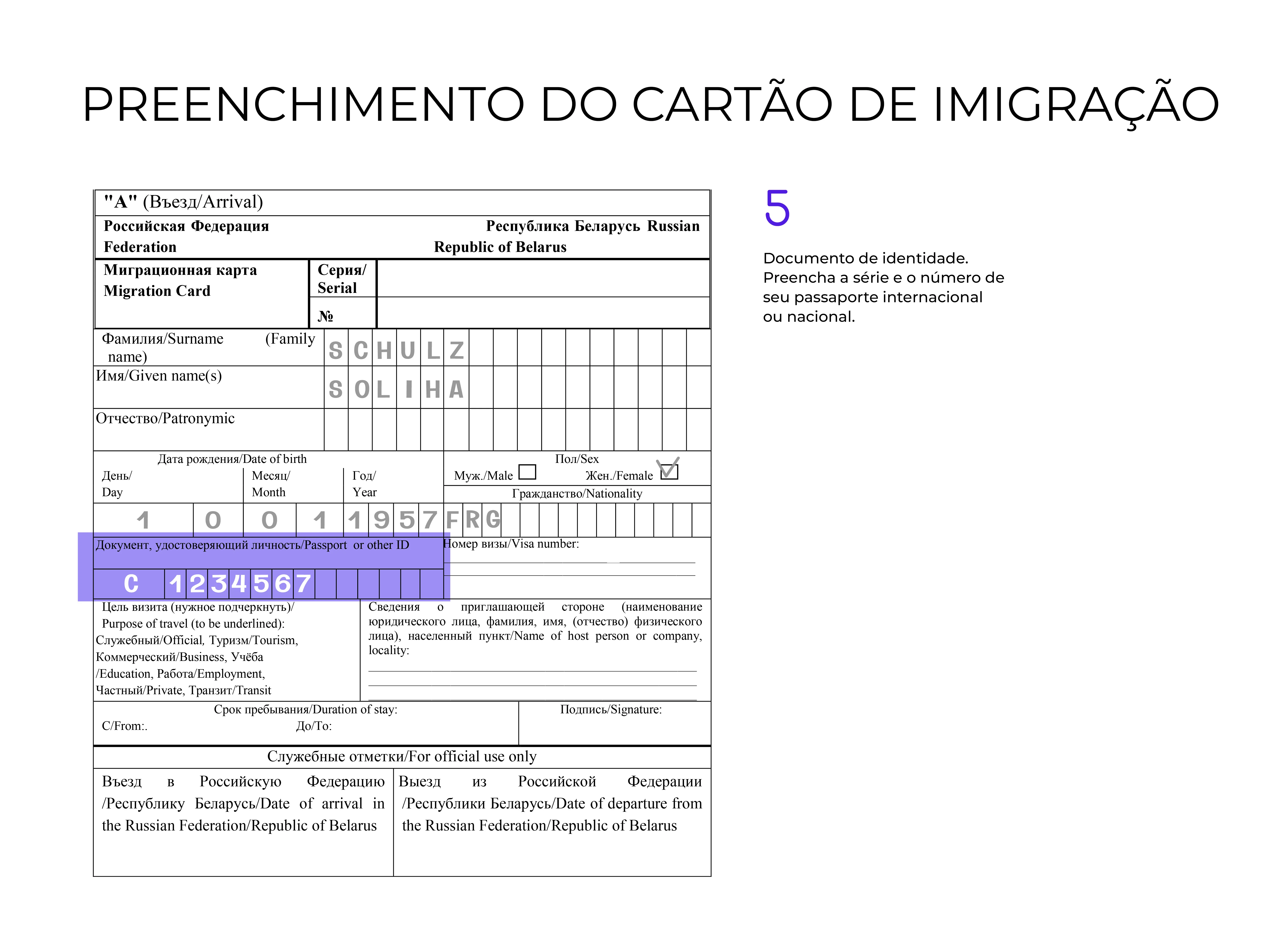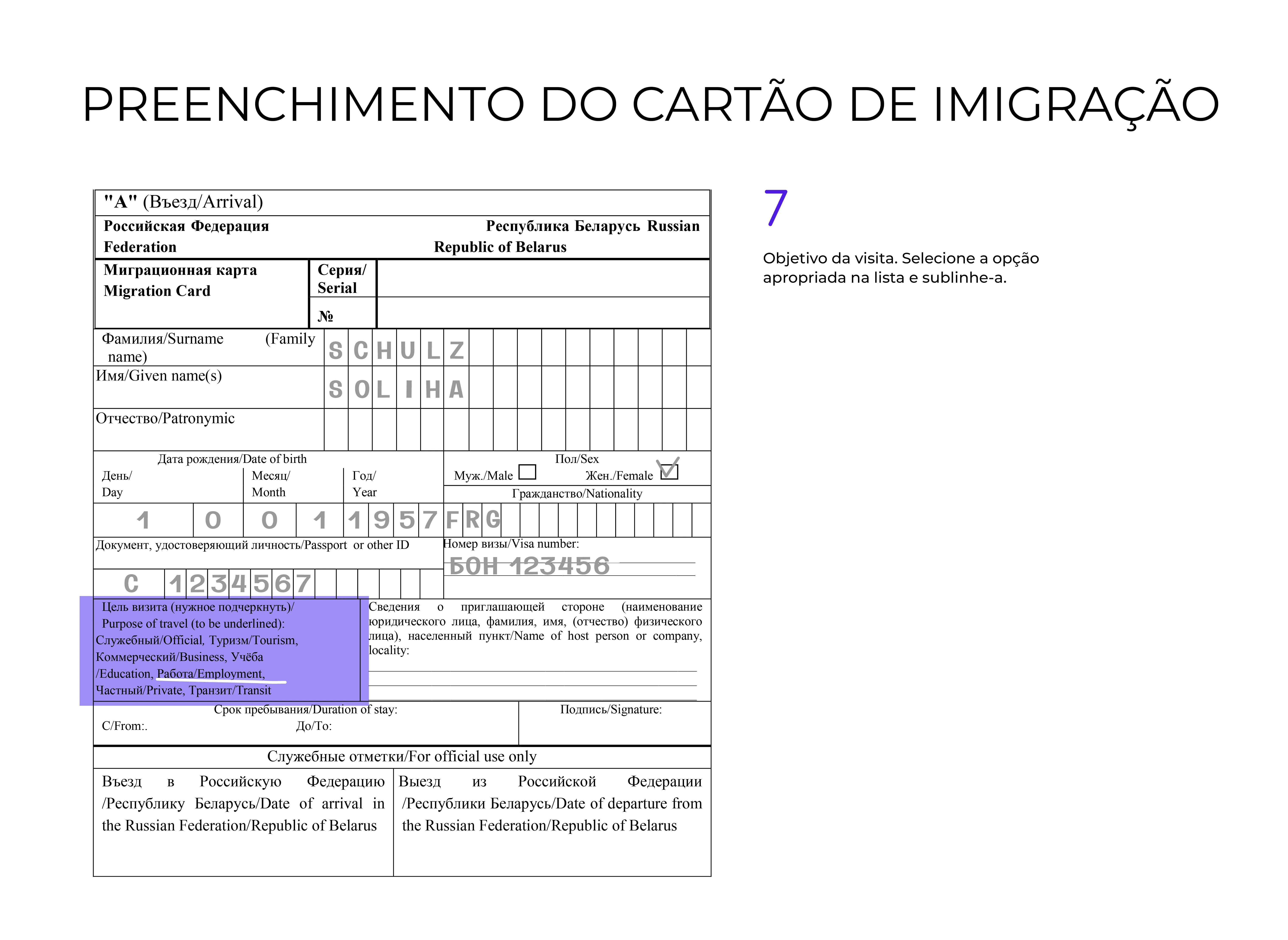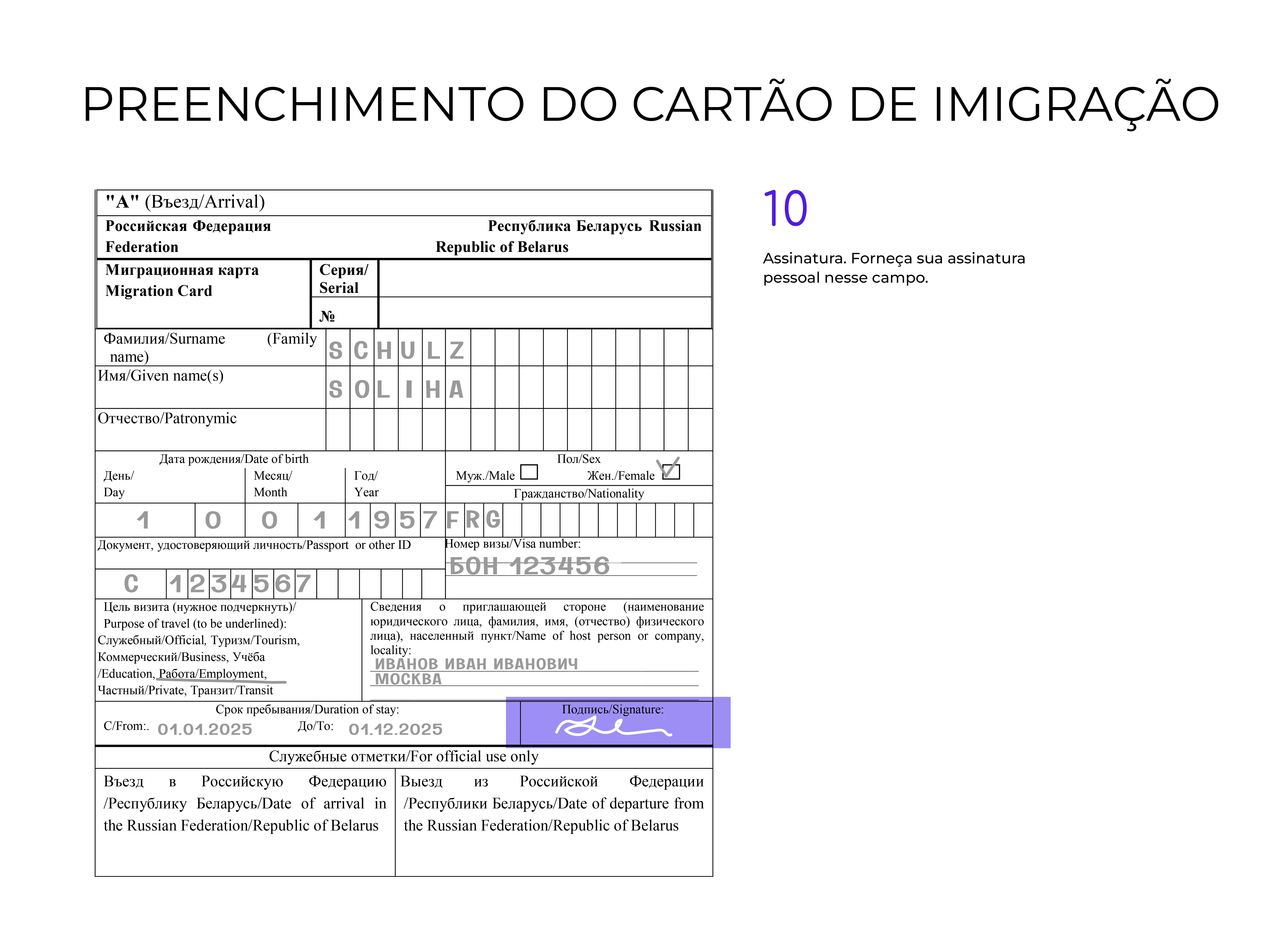 - Preencha um cartão de imigração ao entrar e entregue-o a um funcionário ao sair do território da Federação da Rússia.