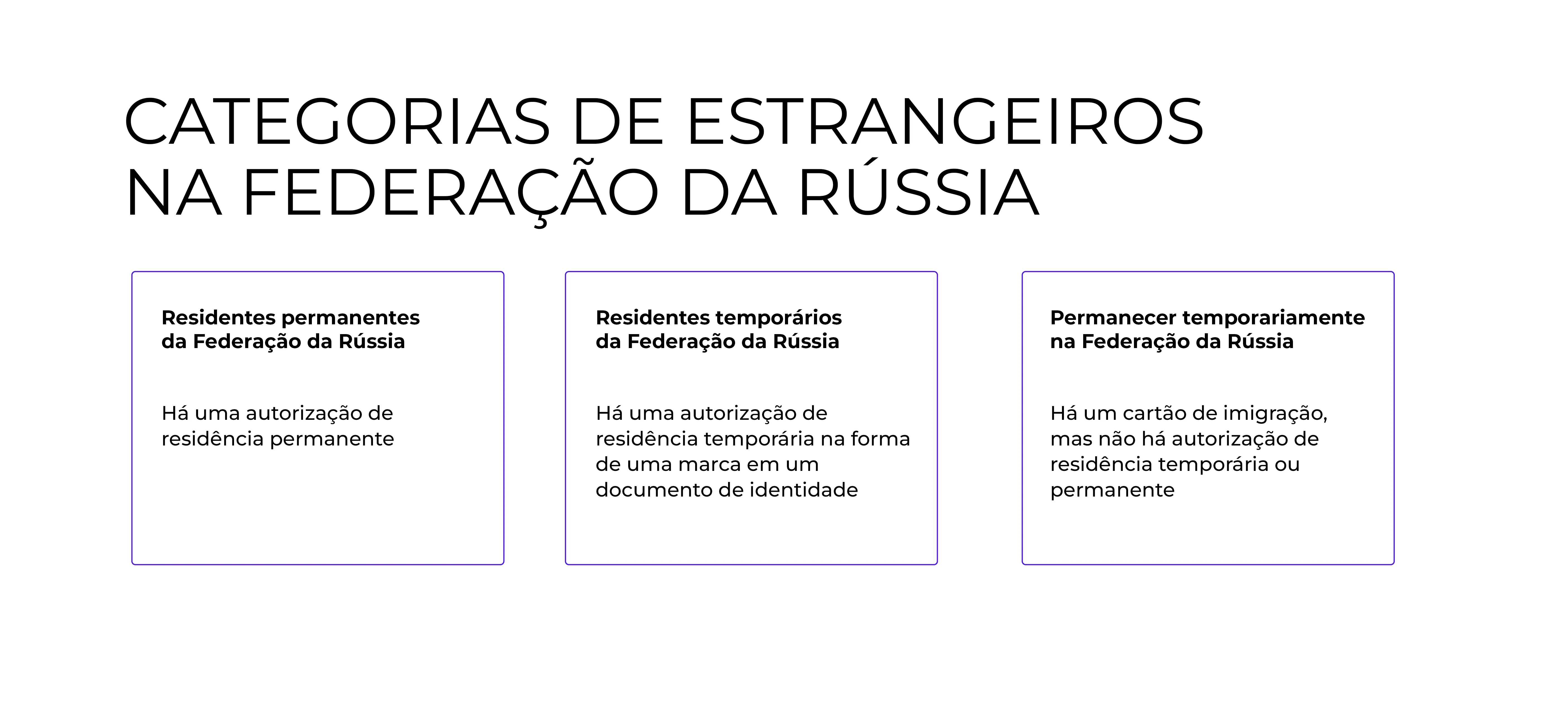 De acordo com a Constituição da Federação da Rússia, os estrangeiros têm os mesmos direitos que os cidadãos russos, com exceção de certos casos estabelecidos por lei federal ou tratado internacional. Os cidadãos estrangeiros que permanecem no território da Federação da Rússia são divididos em três categorias: