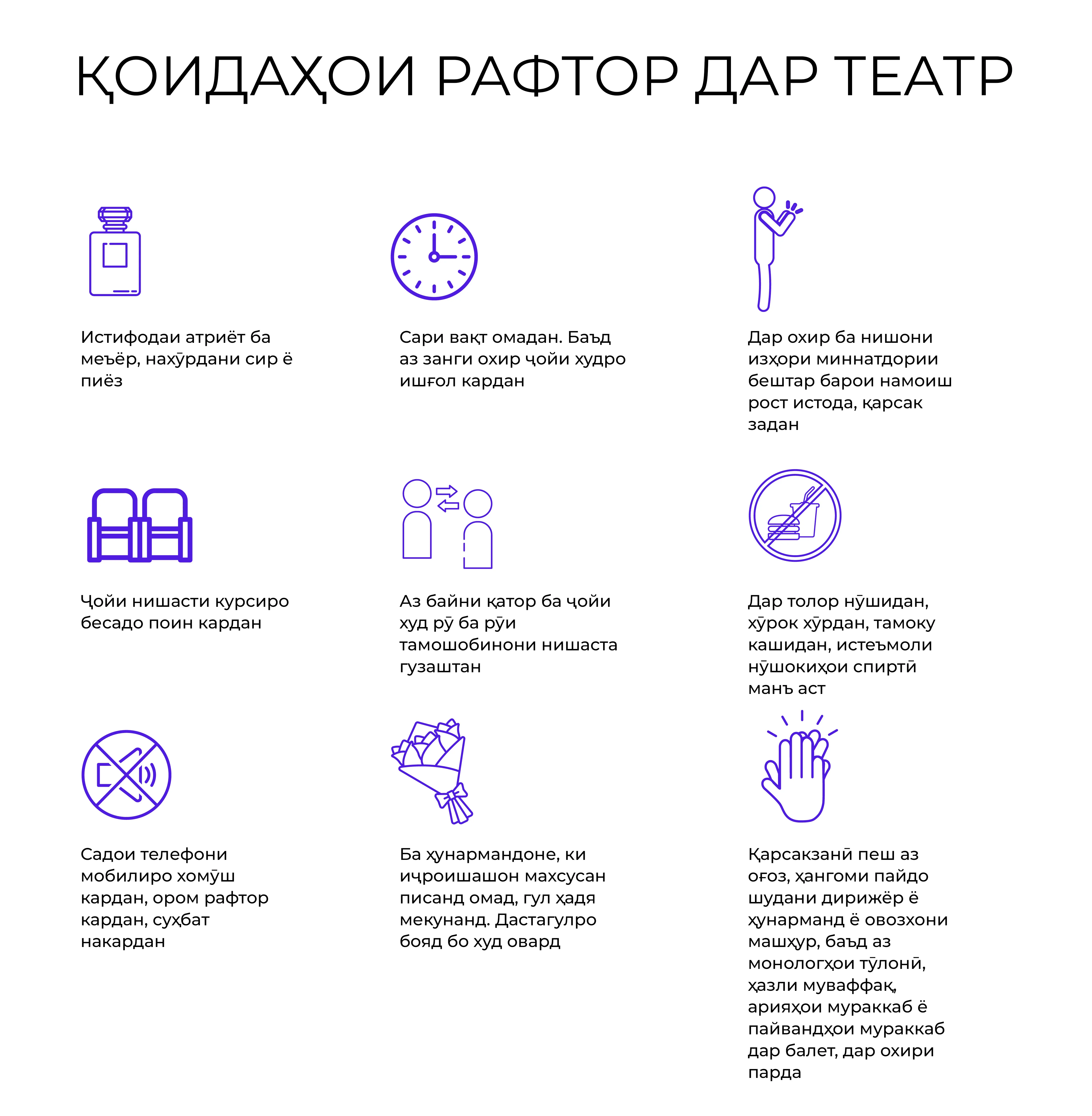 - Ба театр дер кардан беадабист. Пеш аз оғози намоиш зангҳо садо медиҳанд, пас аз занги сеюм чароғ хомӯш мешавад ва ҷои худро ёфтан бе халал расонидан ба тамошобинон душвор хоҳад буд.