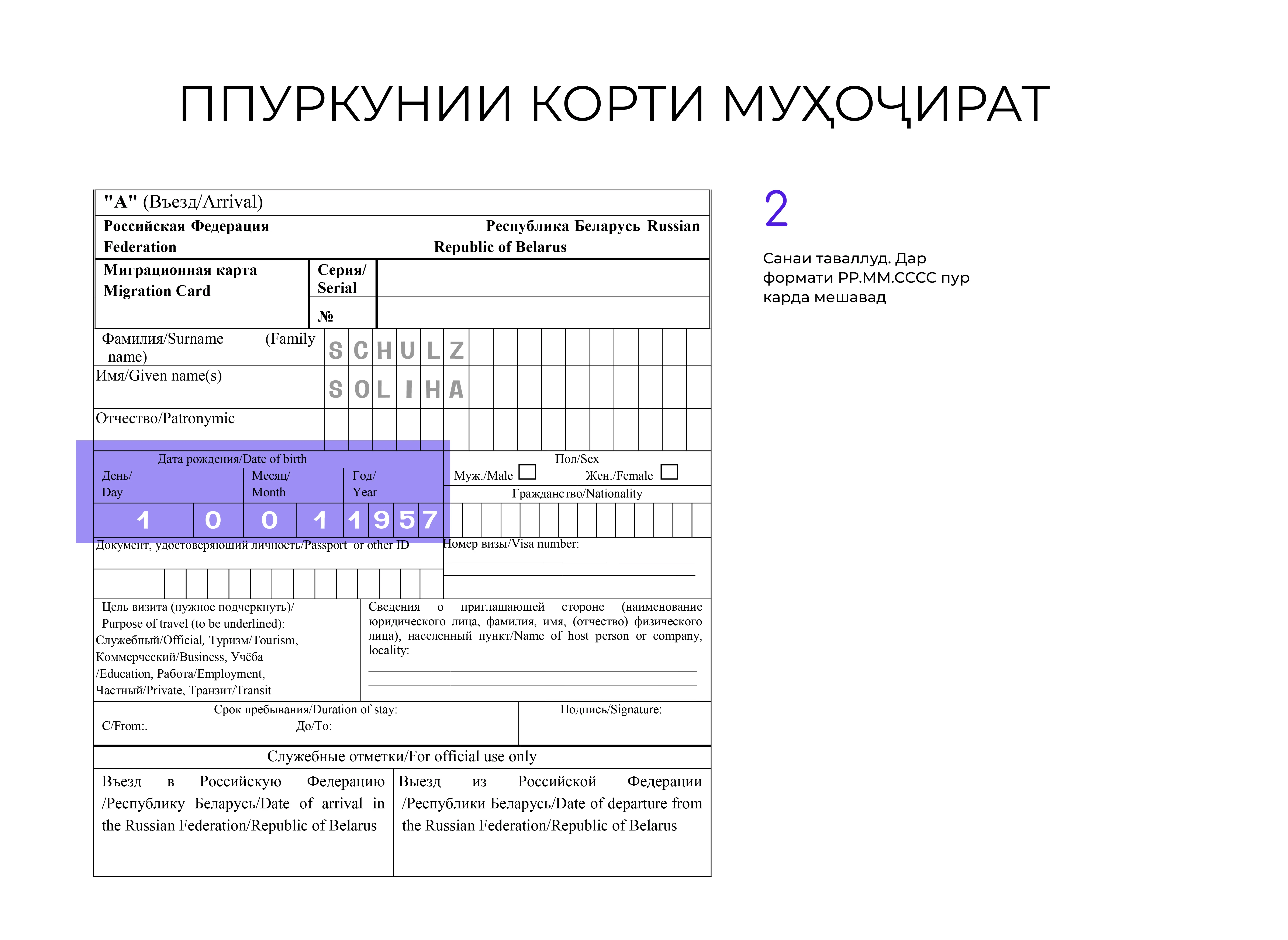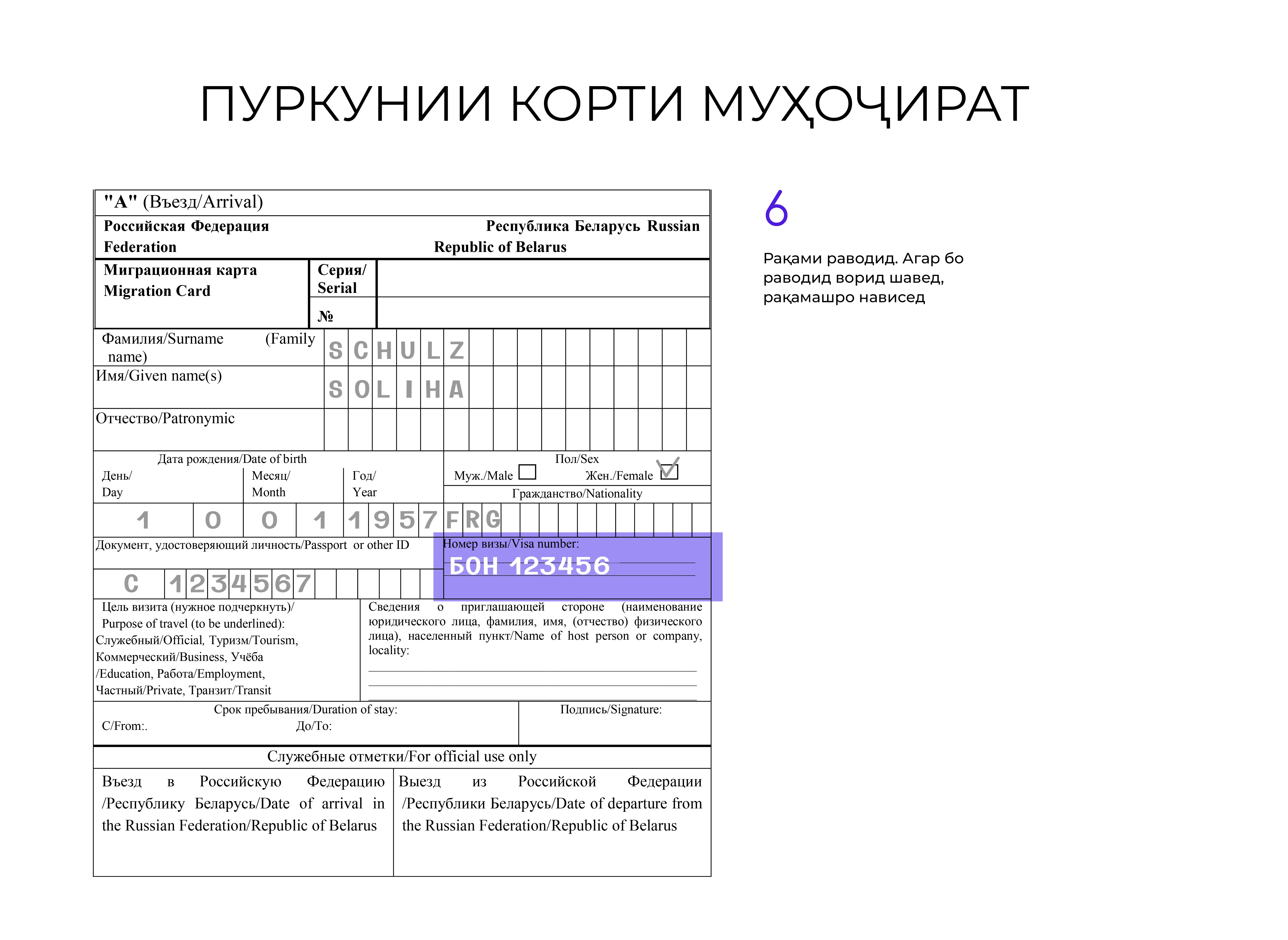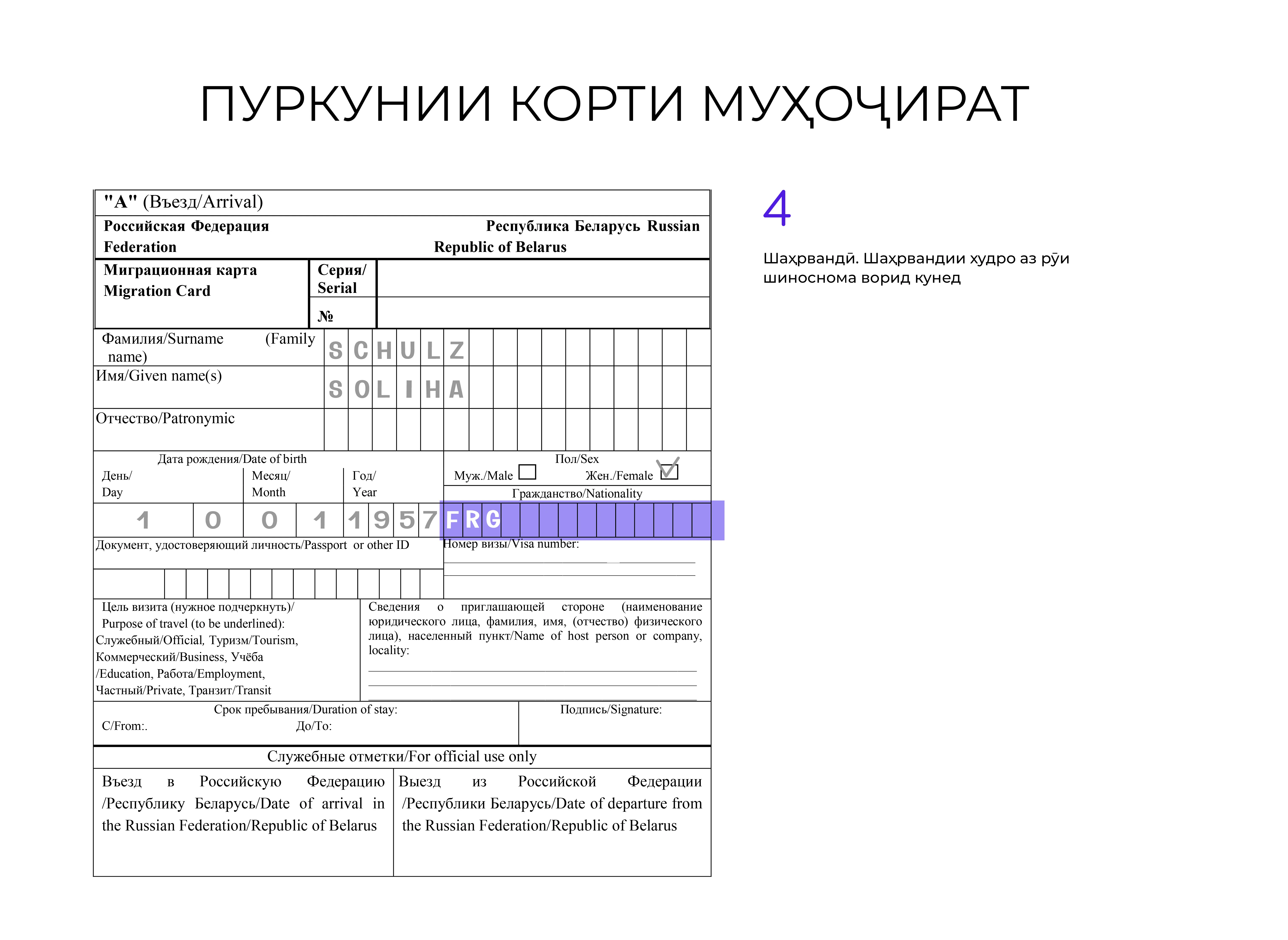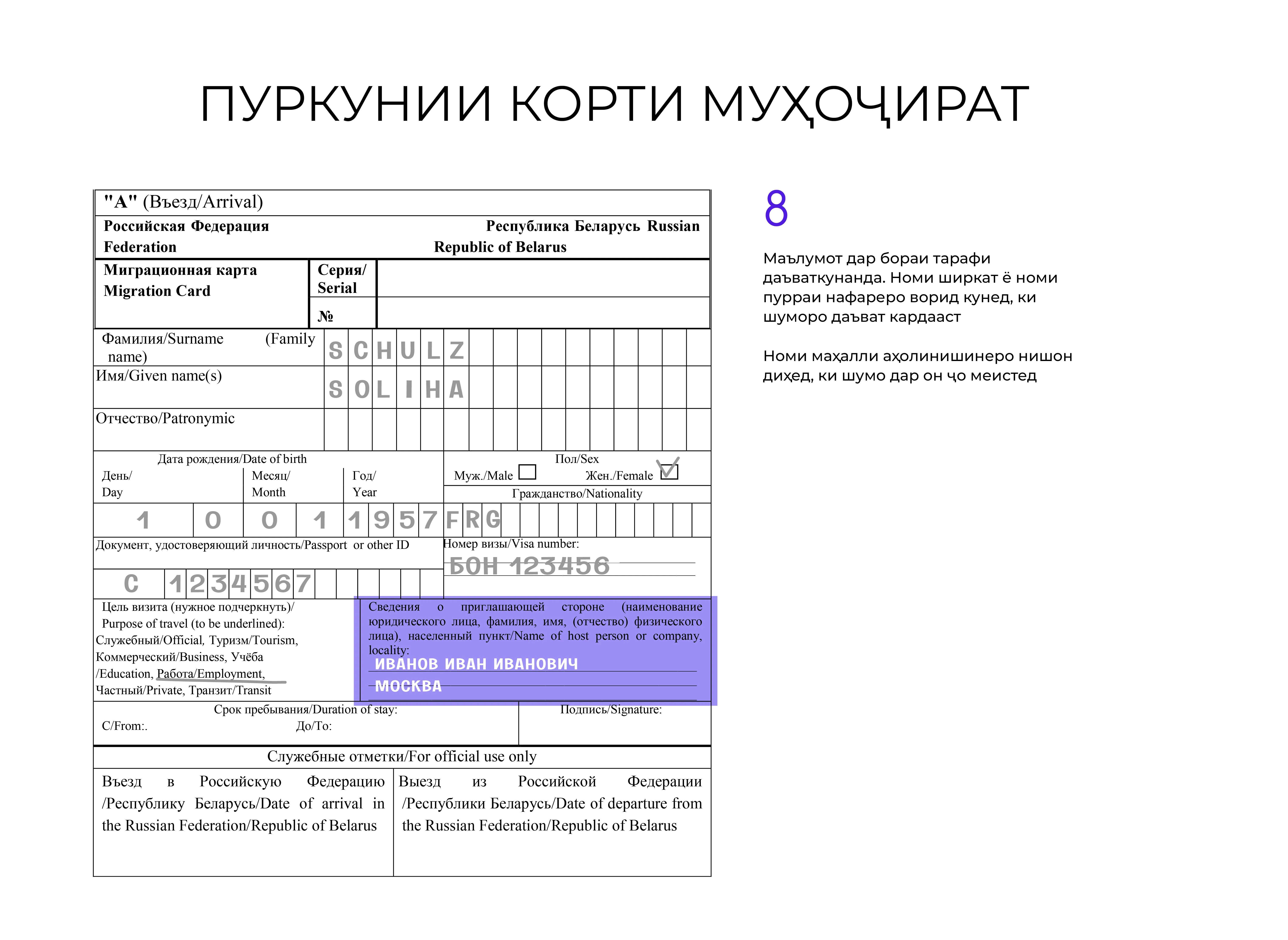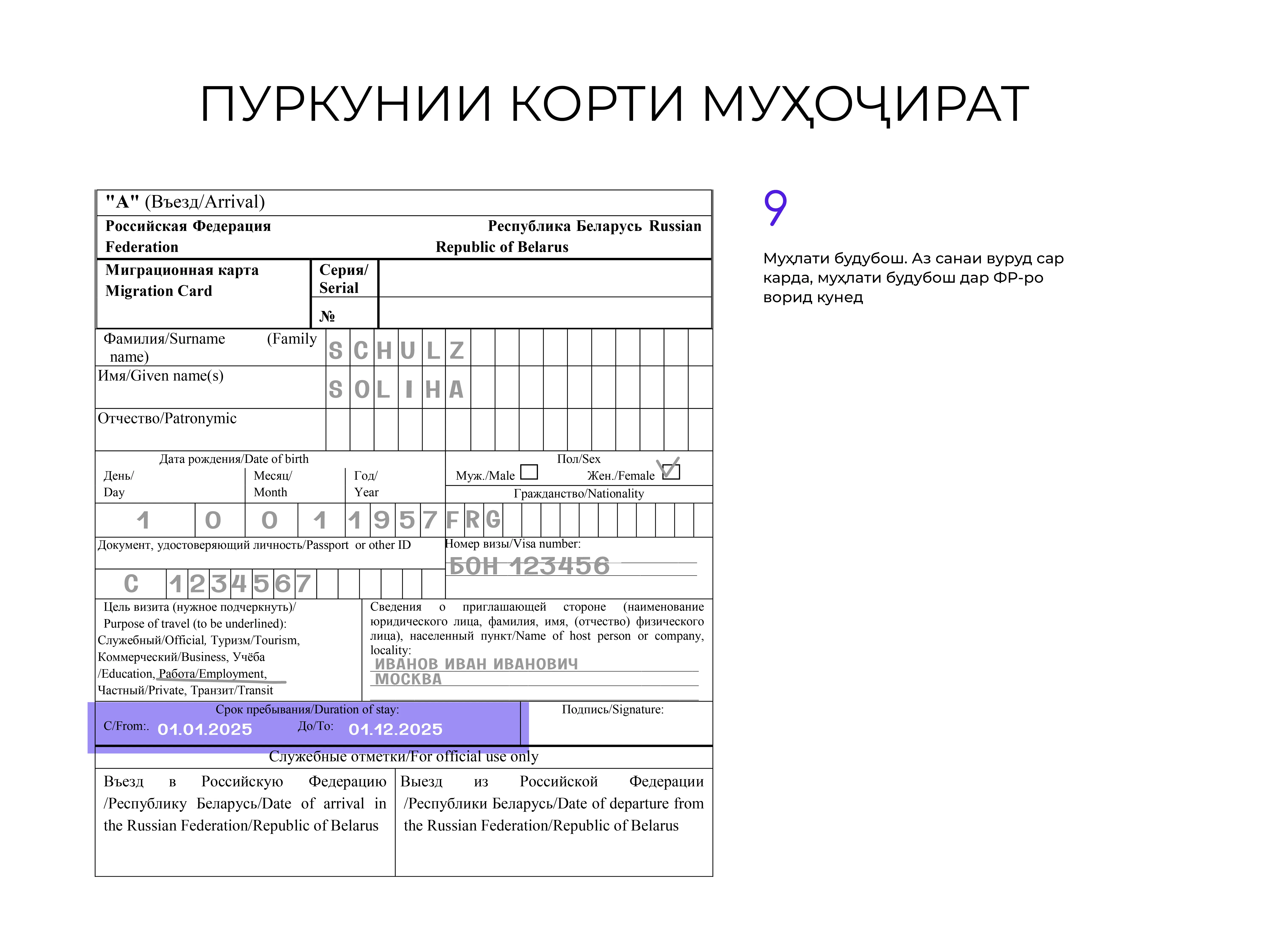 - Ҳангоми вуруд корти муҳоҷиратиро пур кардан ва ҳангоми баромадан аз ҳудуди ФР ба шахси мансабдор супоридан.