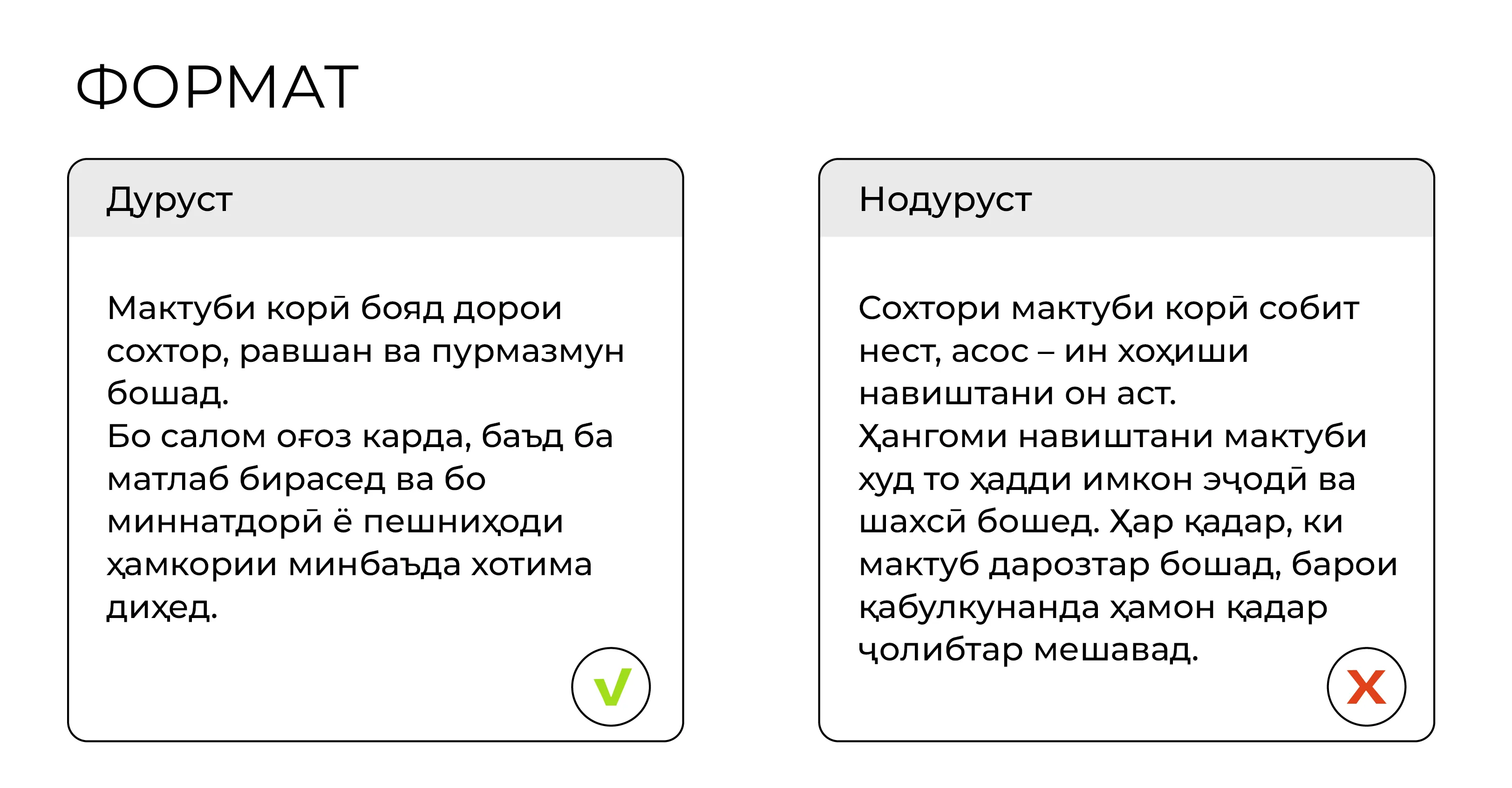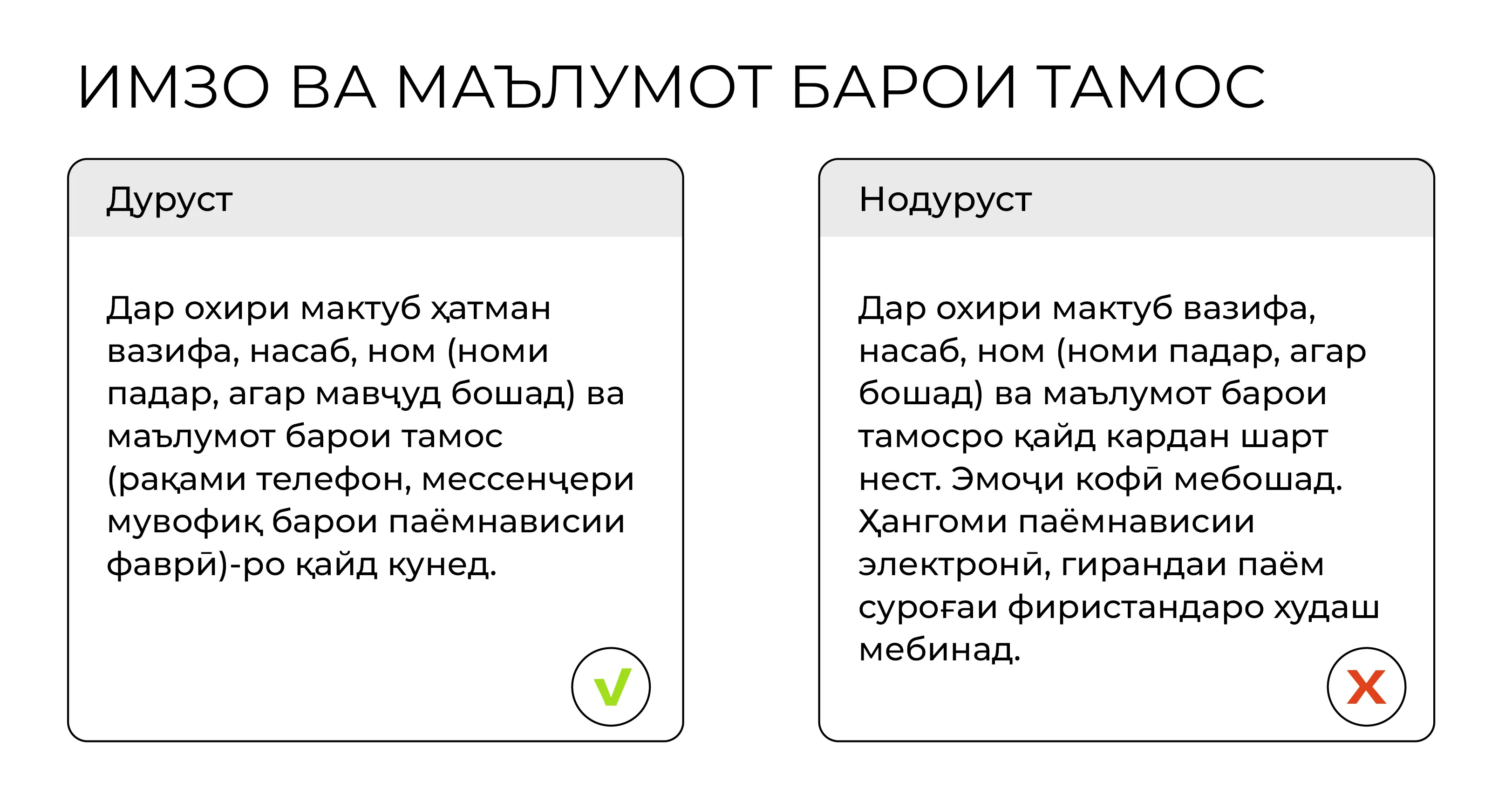 Қоидаҳо барои навиштани мактубҳои муқаррарӣ ва почтаи электронӣ татбиқ мешаванд. Тавсия дода мешавад, ки ба паёмҳои электронӣ дар давоми 24 соат пас аз қабул ҷавоб диҳед. Шумо метавонед бо қоидаҳо ва намунаҳои ҳарфҳо муфассал дар ин ҷо шинос шавед.