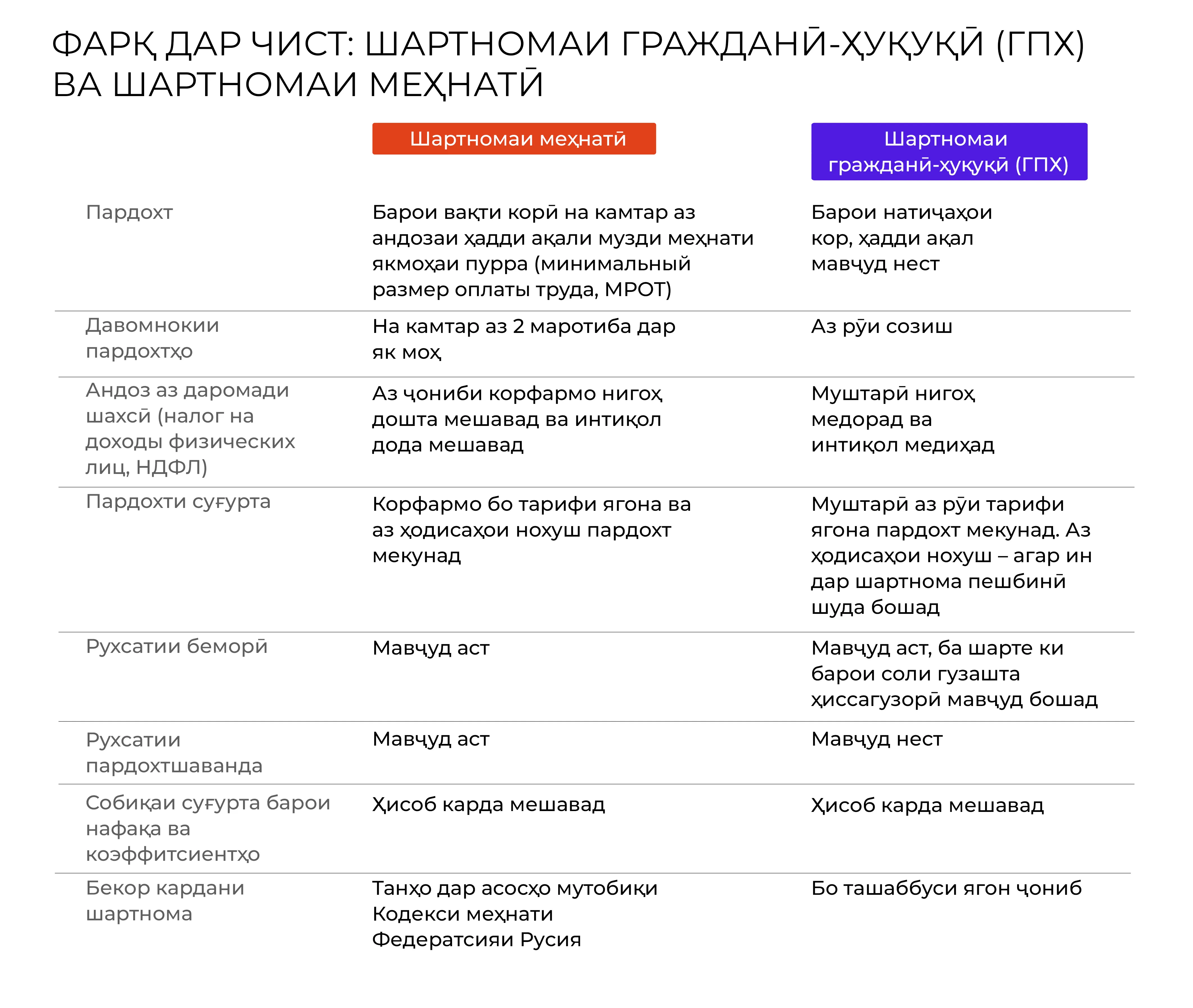 Шартномаи меҳнатӣ нисбат ба шартномаи гражданӣ-ҳуқуқӣ (ГПХ) афзалтар аст, зеро он ба корманд кафолату ҳимояи бештар медиҳад. Дар байни онҳо: рухсатӣ ва рухсатии бемории пардохтшаванда, ҳифзи саломатӣ ҳангоми иҷрои вазифаҳои меҳнатӣ.