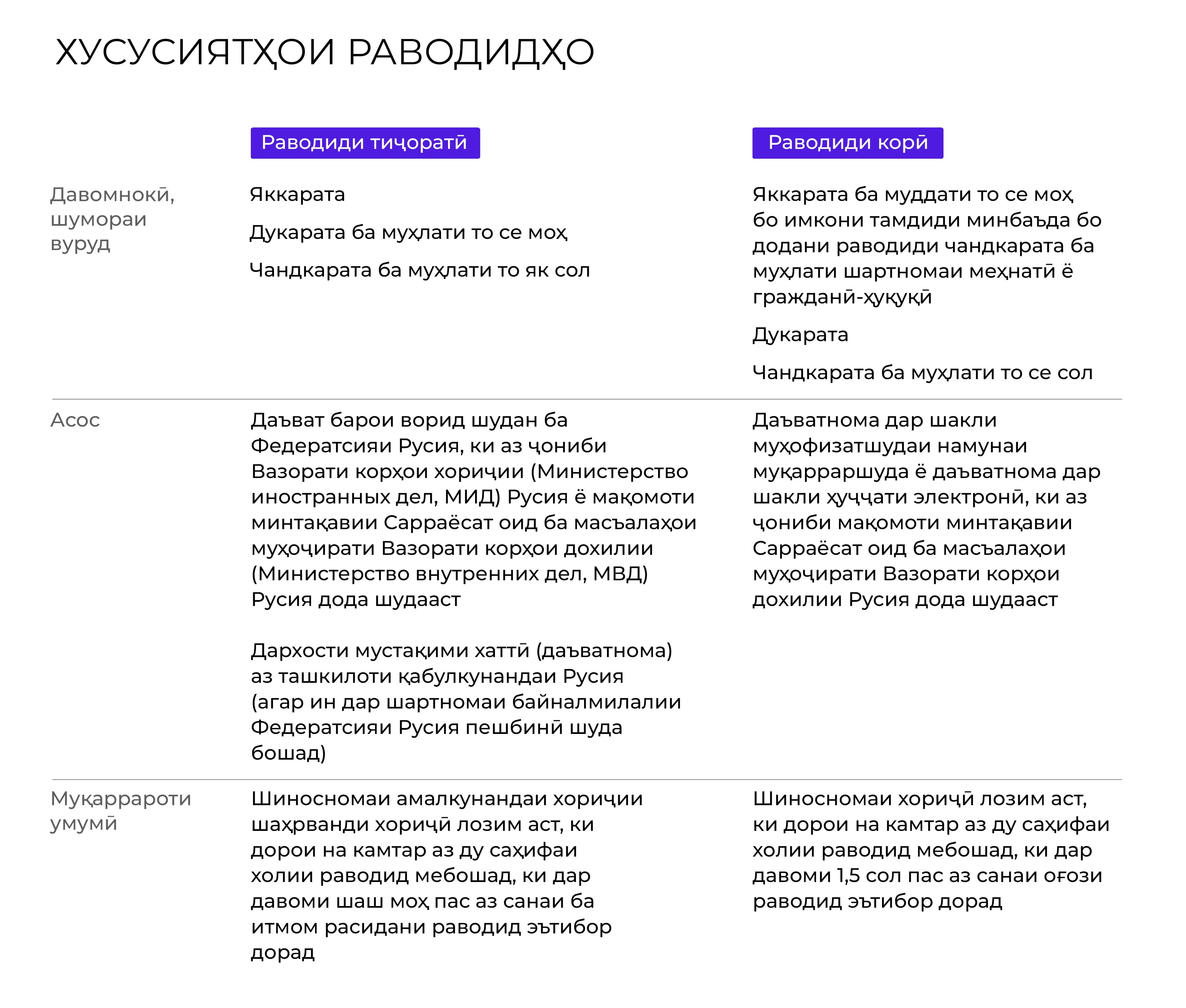Зиёда аз даҳ намуди раводид вуҷуд дорад, ки тибқи онҳо шаҳрвандони хориҷӣ имкони вуруд ба Русияро доранд. Баъзе аз маъмултарини онҳо раводиди тиҷоратӣ ва раводиди корӣ мебошанд. Дар ҷадвал хусусиятҳои асосии онҳо нишон дода шудаанд.