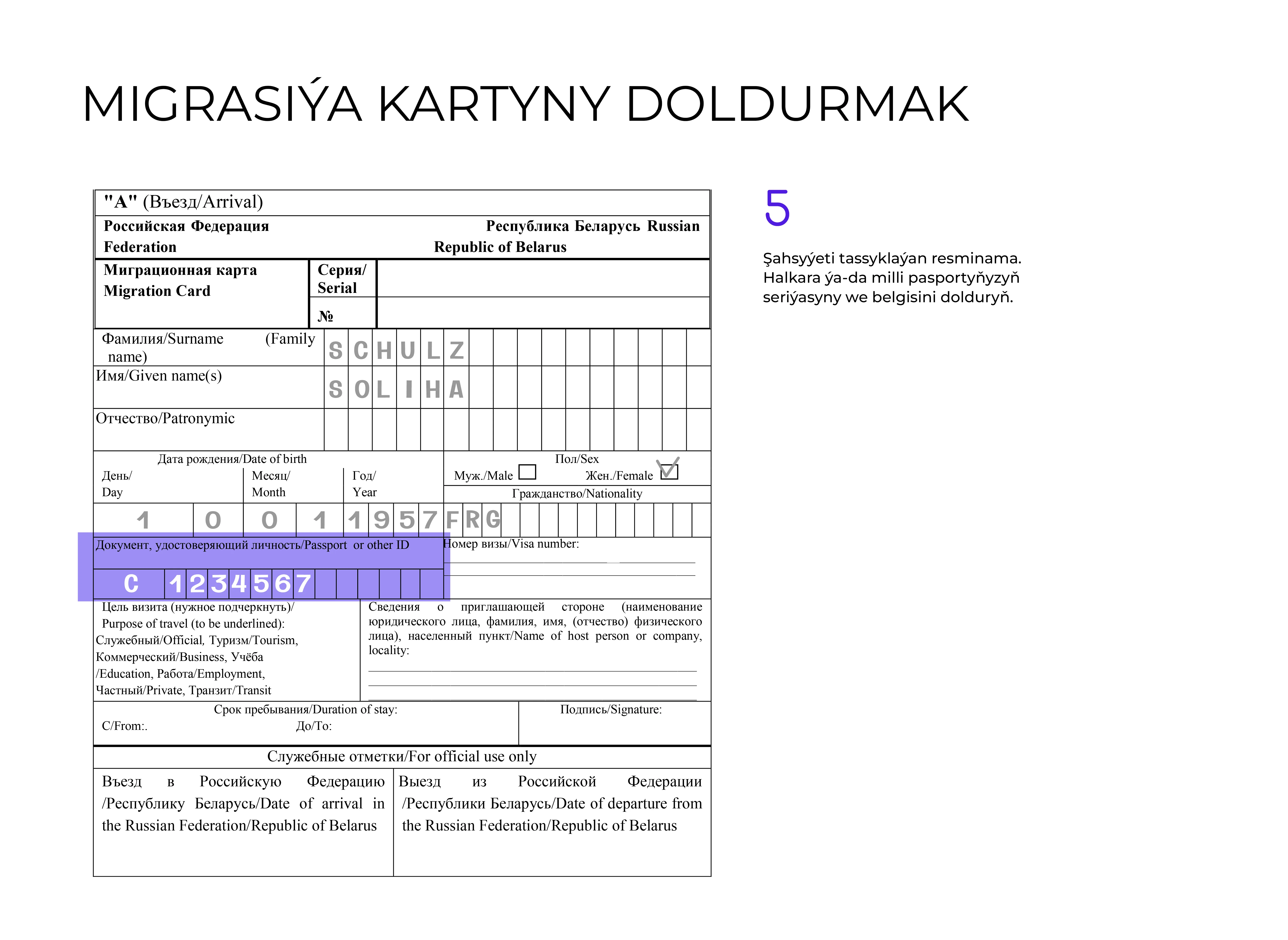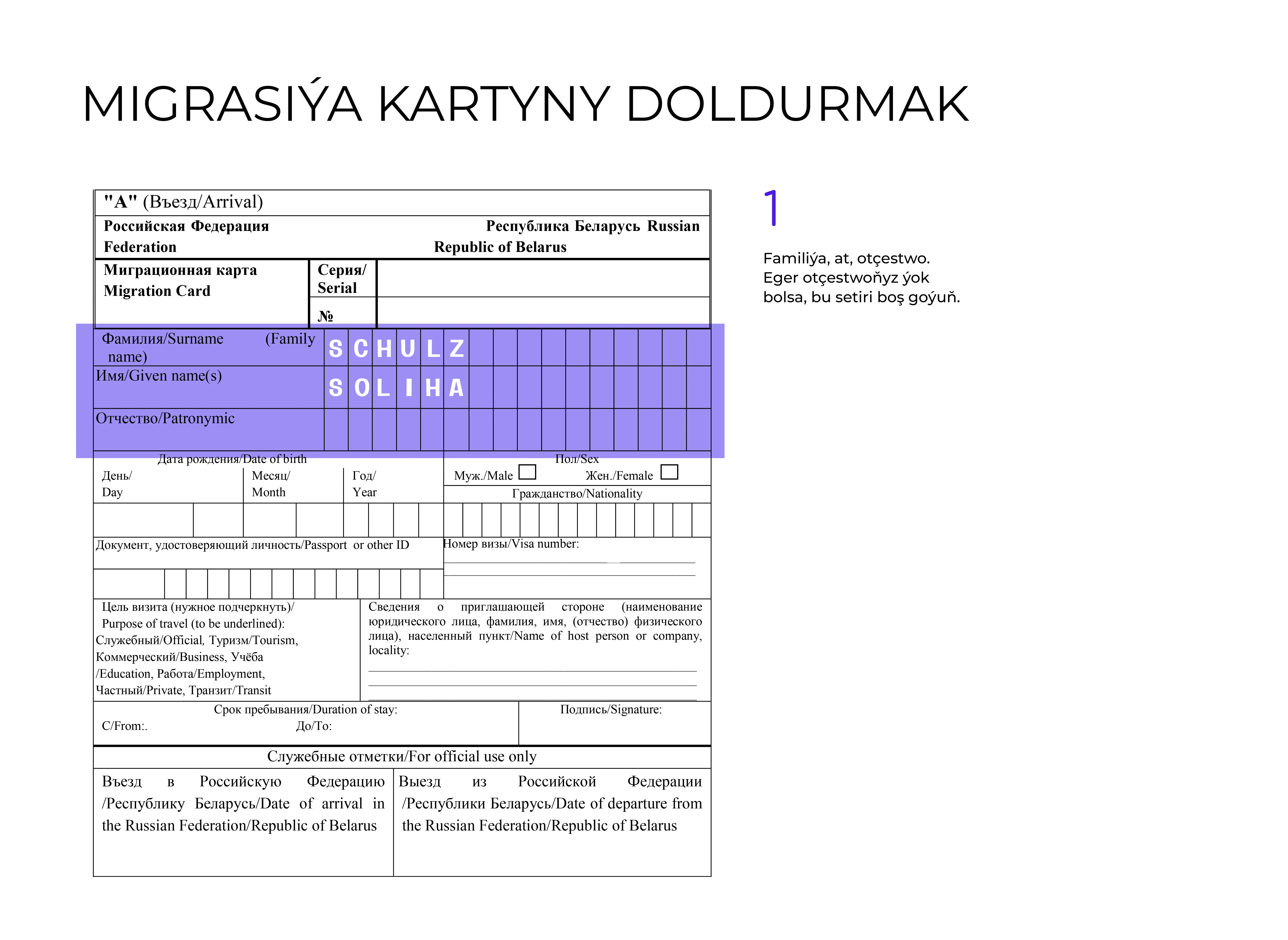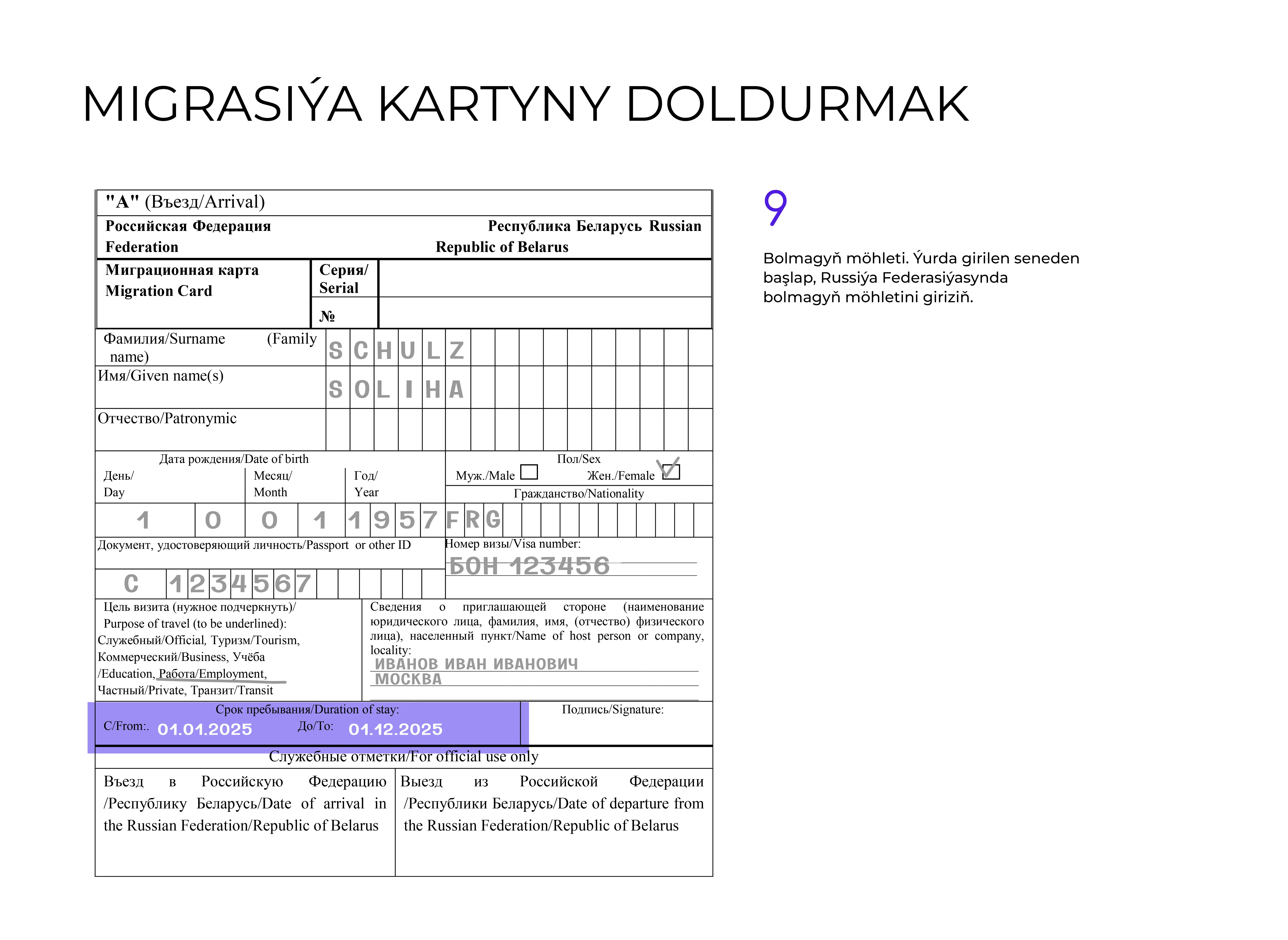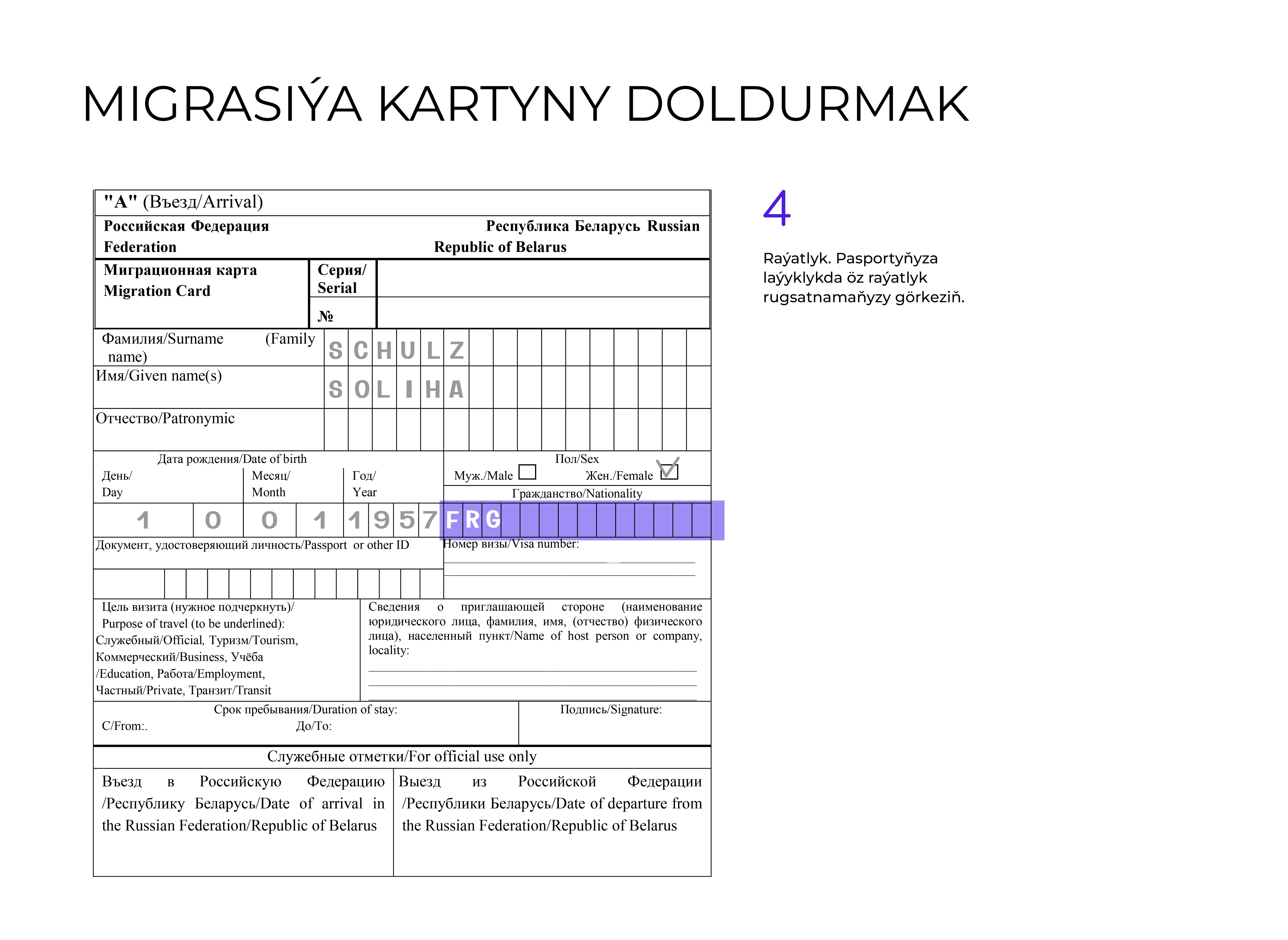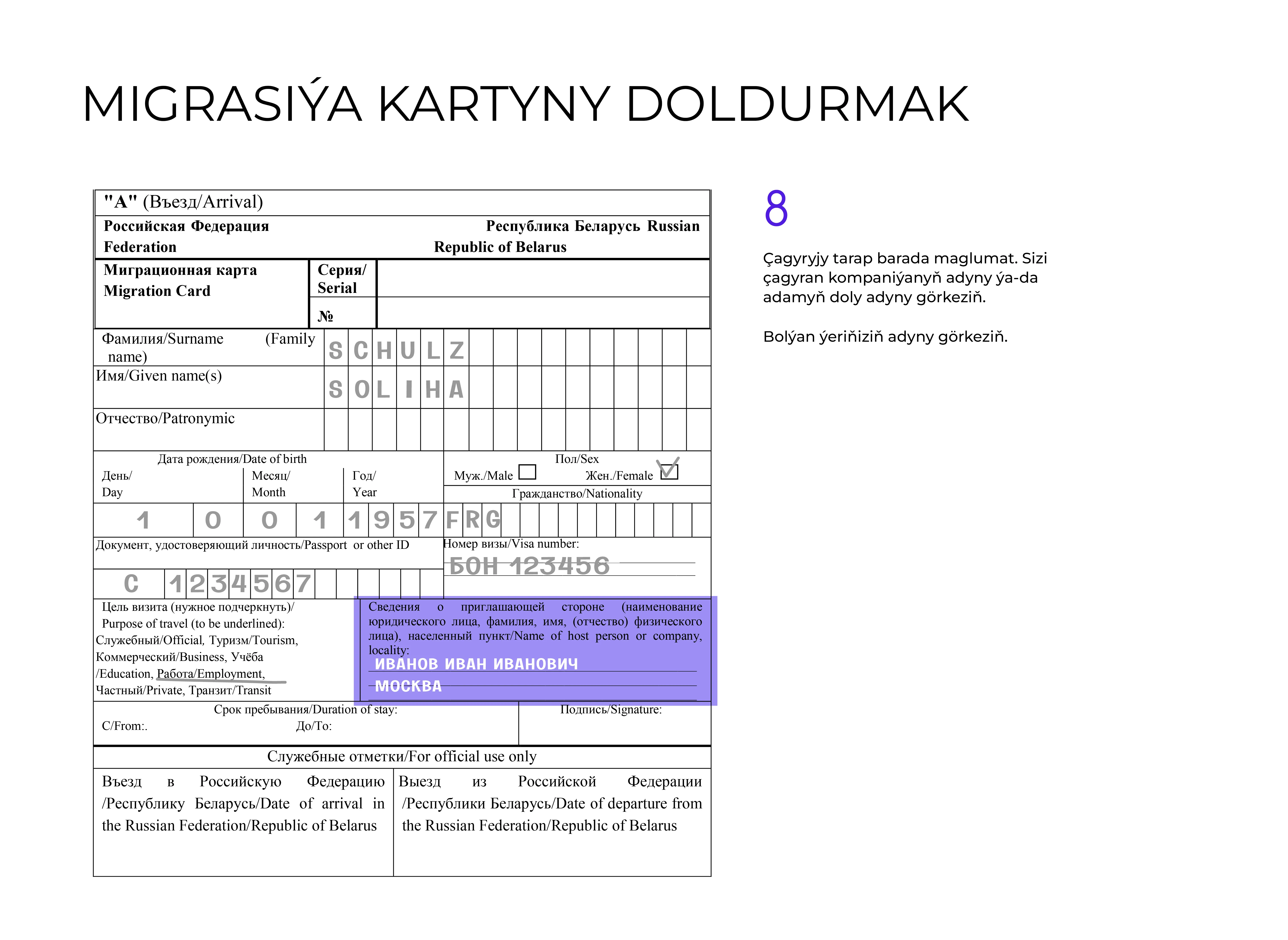 - Ýurduň çägine gireniňizde migrasiýa kartyny dolduryň we Russiýa Federasiýasynyň çäginden çykanyňyzda ony wezipeli adama tabşyryň.