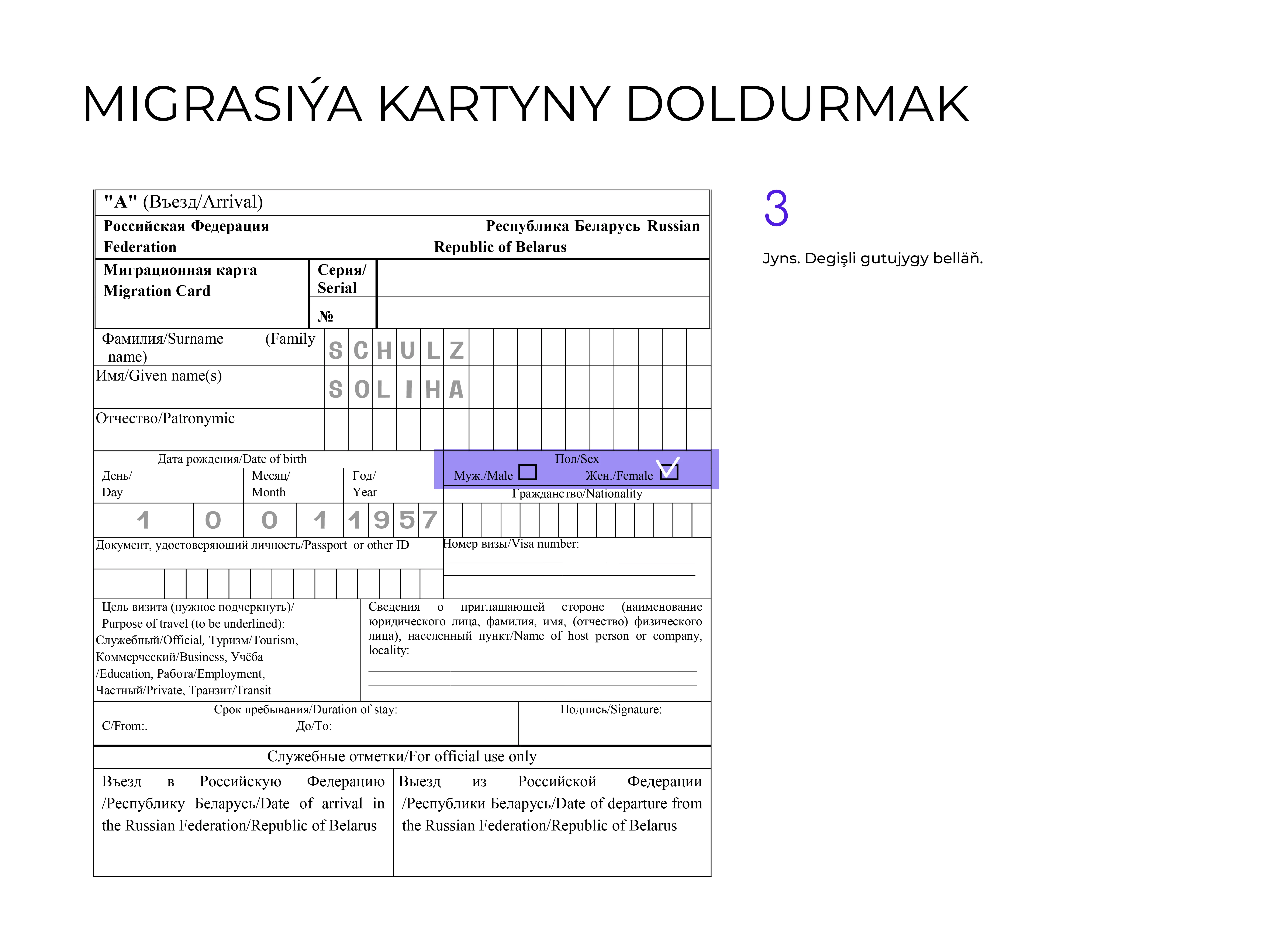 Migrasiýa kartasyny doldurmak aňsat, ýöne muny üns bilen we dogry ýerine ýetirmek örän möhümdir. Migrasiýa kartynyň anketasy A we B bölümlerinden ybaratdyr. Onuň A bölümi serhet işgärinde, B bölegi bolsa migrantda galýar.