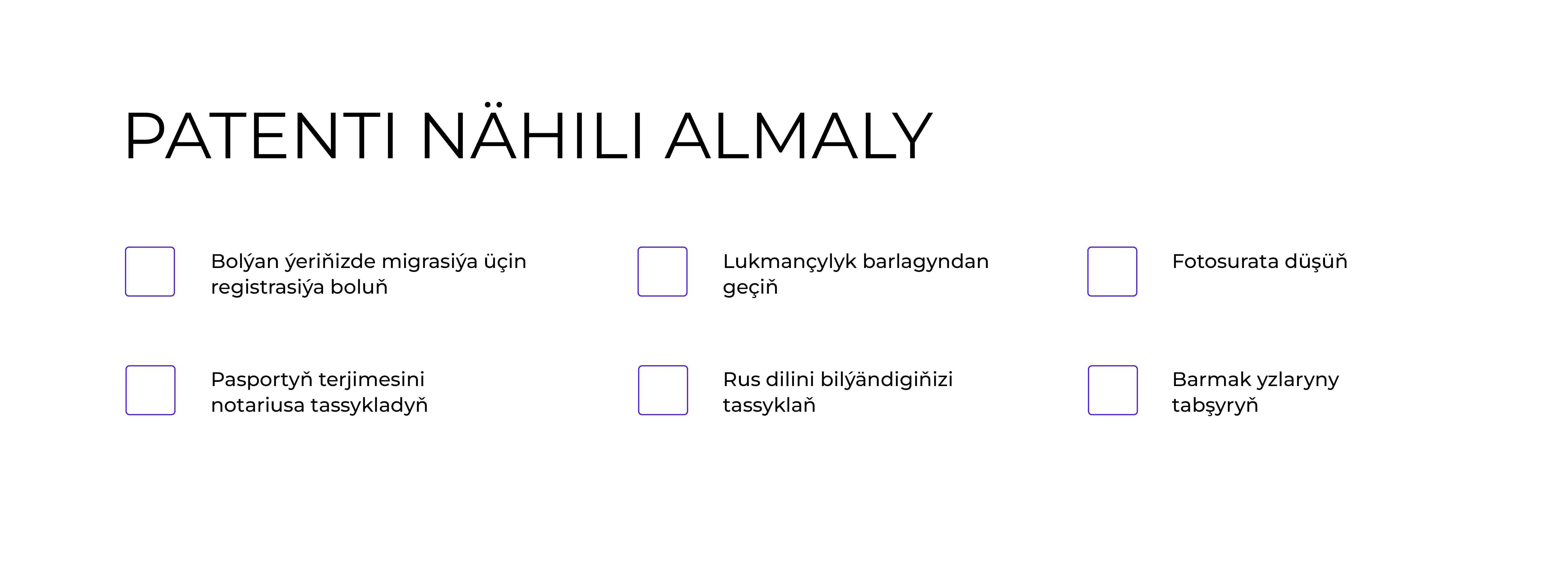 Patent almak üçin, bolýan ýeriňizde migrasiýada hasaba durmak, pasportyň notarial tassyklanan terjimesini etdirmek, lukmançylyk barlagyndan geçmek, rus diliniň başlangyç bilimini tassyklamak, fotosurata düşmek we daktiloskopiýa prosedurasyndan geçmek zerurdyr. Patent hem, iş rugsatnamasy hem Içeri işler ministrliginiň (МВД) migrasiýa bölümlerinde berilýär.
