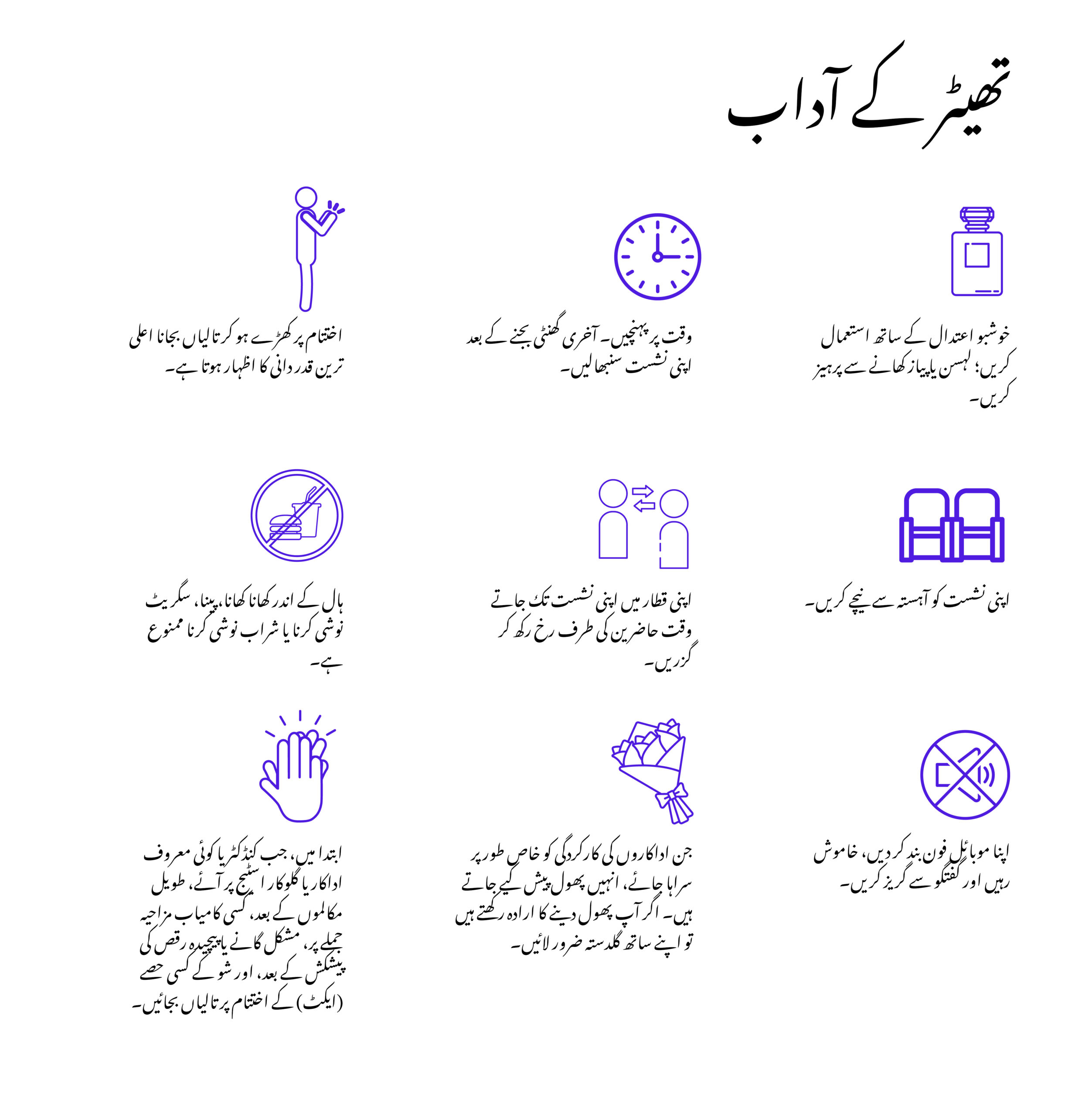 - اگر آپ کو کوئی ضروری کام ہو تو وقفے کے دوران باہر جا سکتے ہیں۔ پرفارمنس کے دوران ہال چھوڑنا مناسب نہیں سمجھا جاتا۔