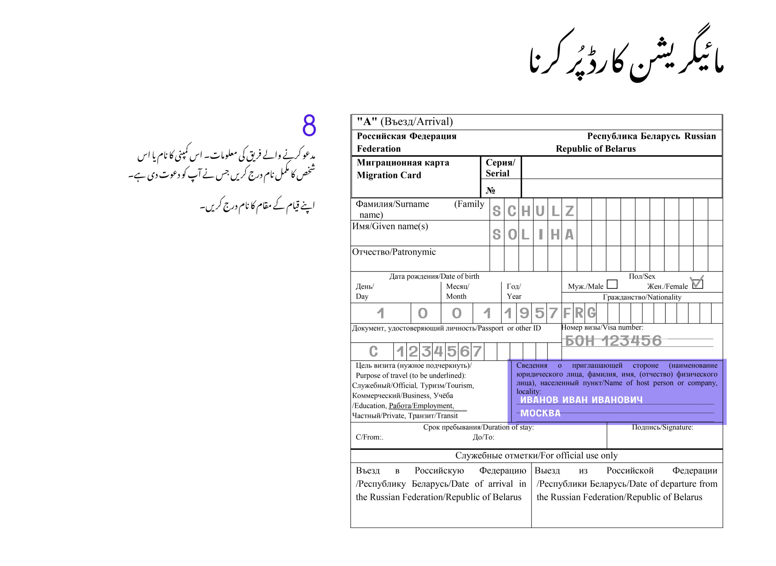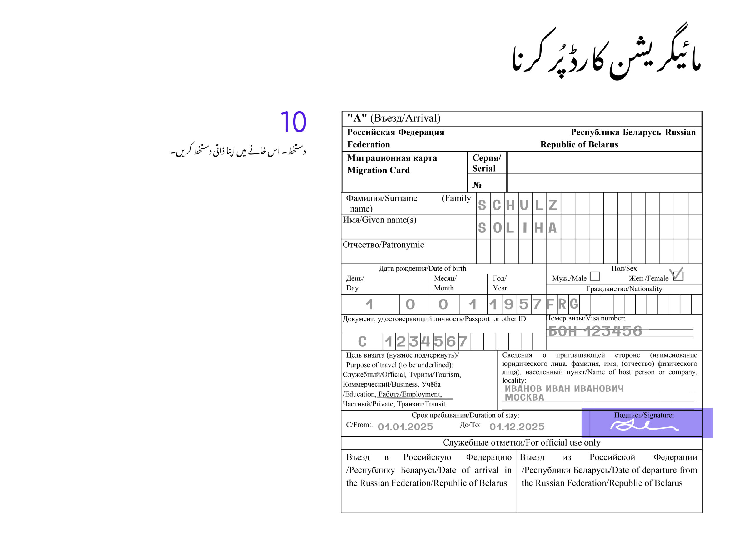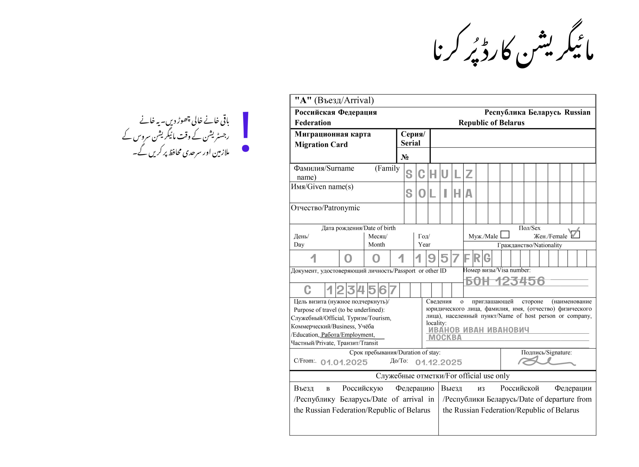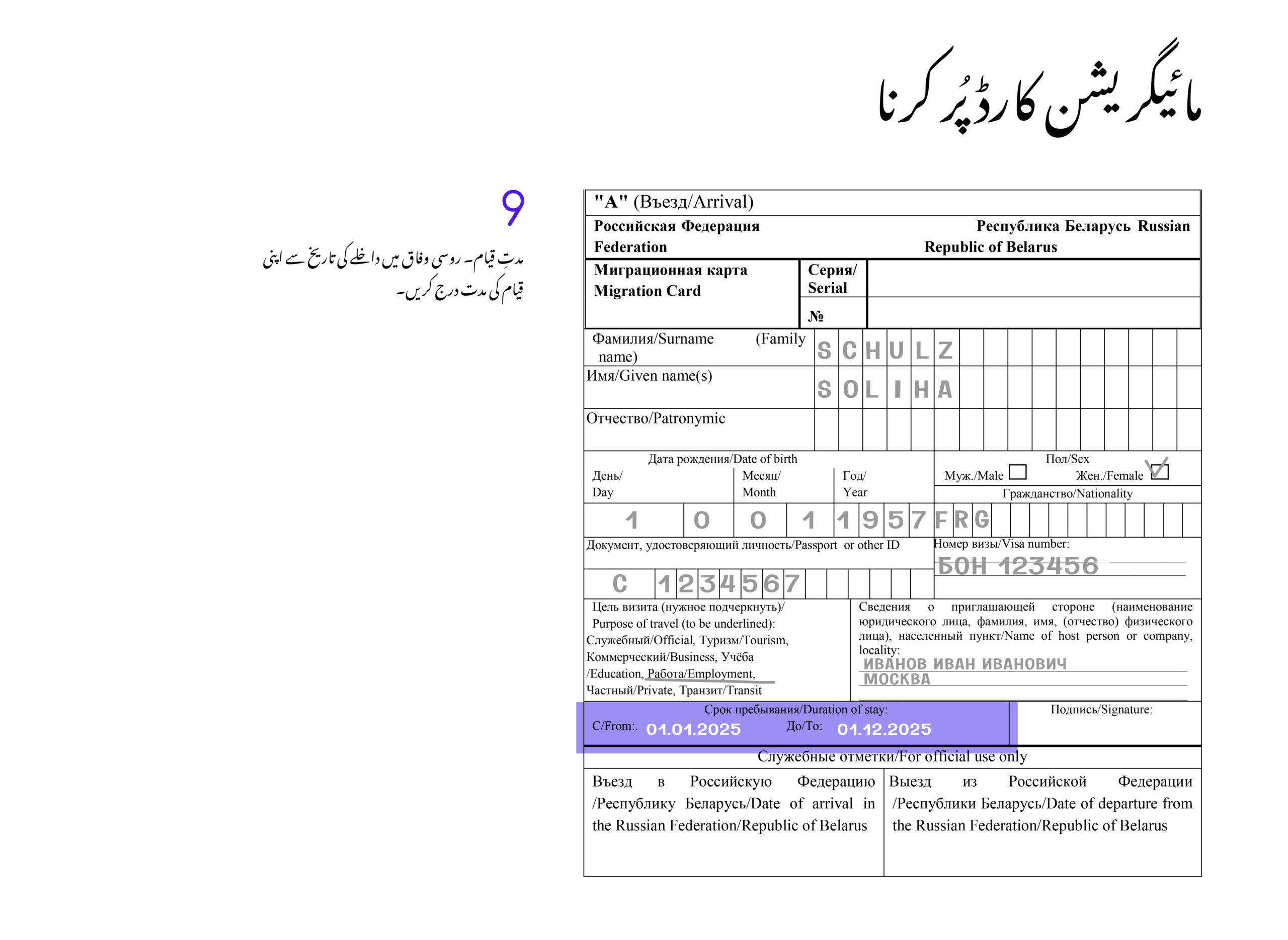 - روس میں داخل ہوتے وقت مائیگریشن کارڈ پُر کریں اور روسی وفاق کے علاقے سے روانگی کے وقت اسے متعلقہ اہلکار کے حوالے کریں۔