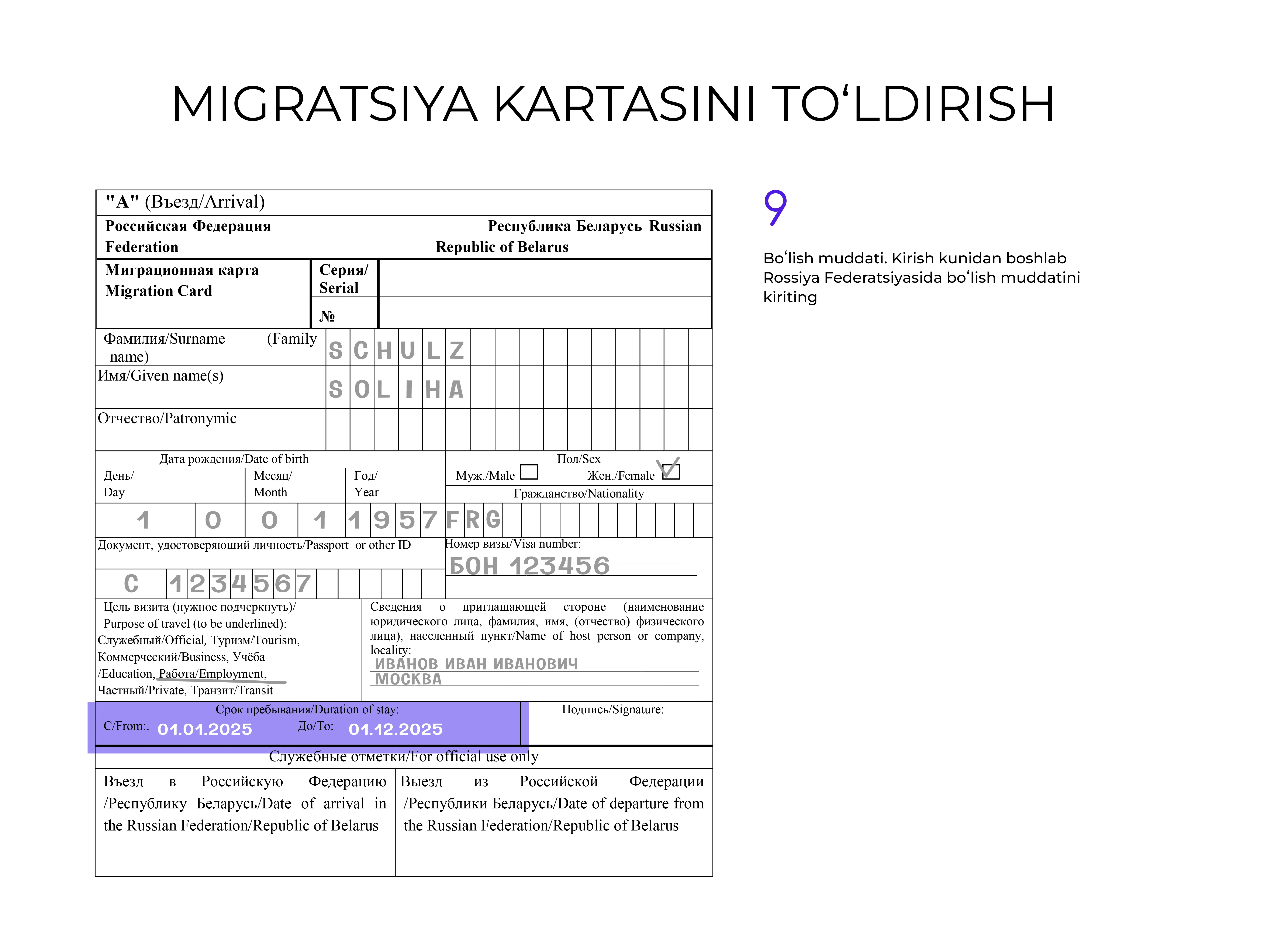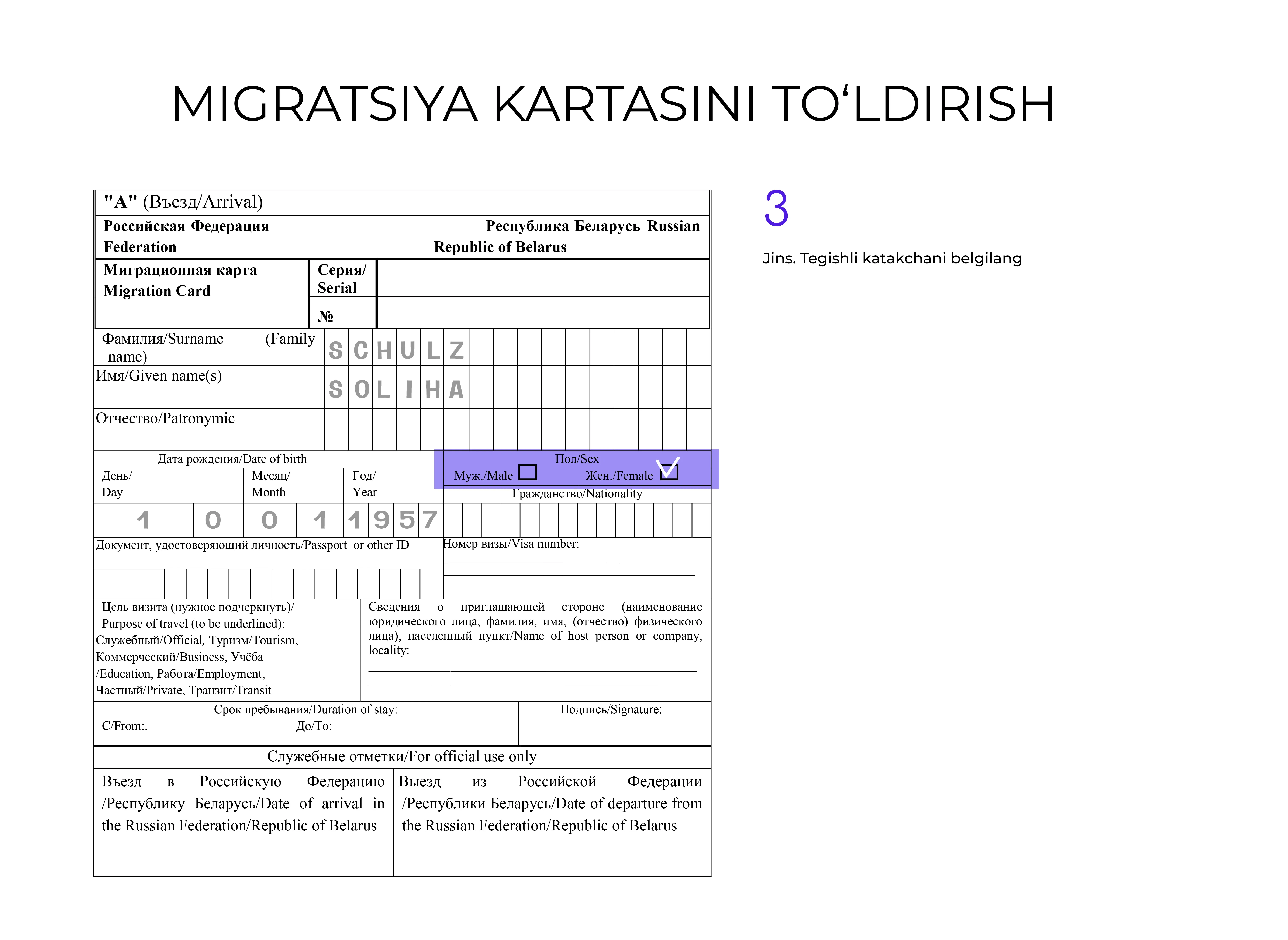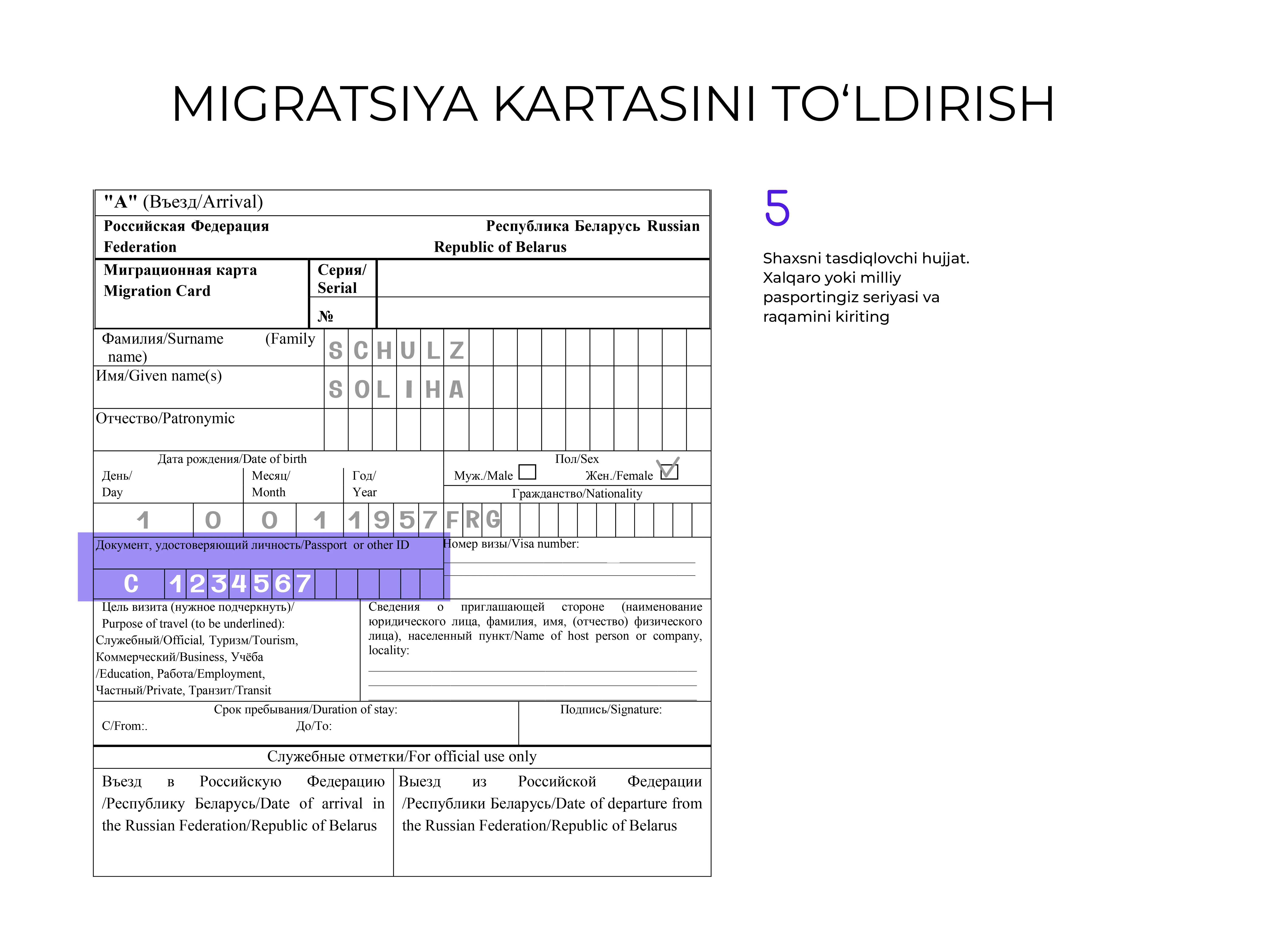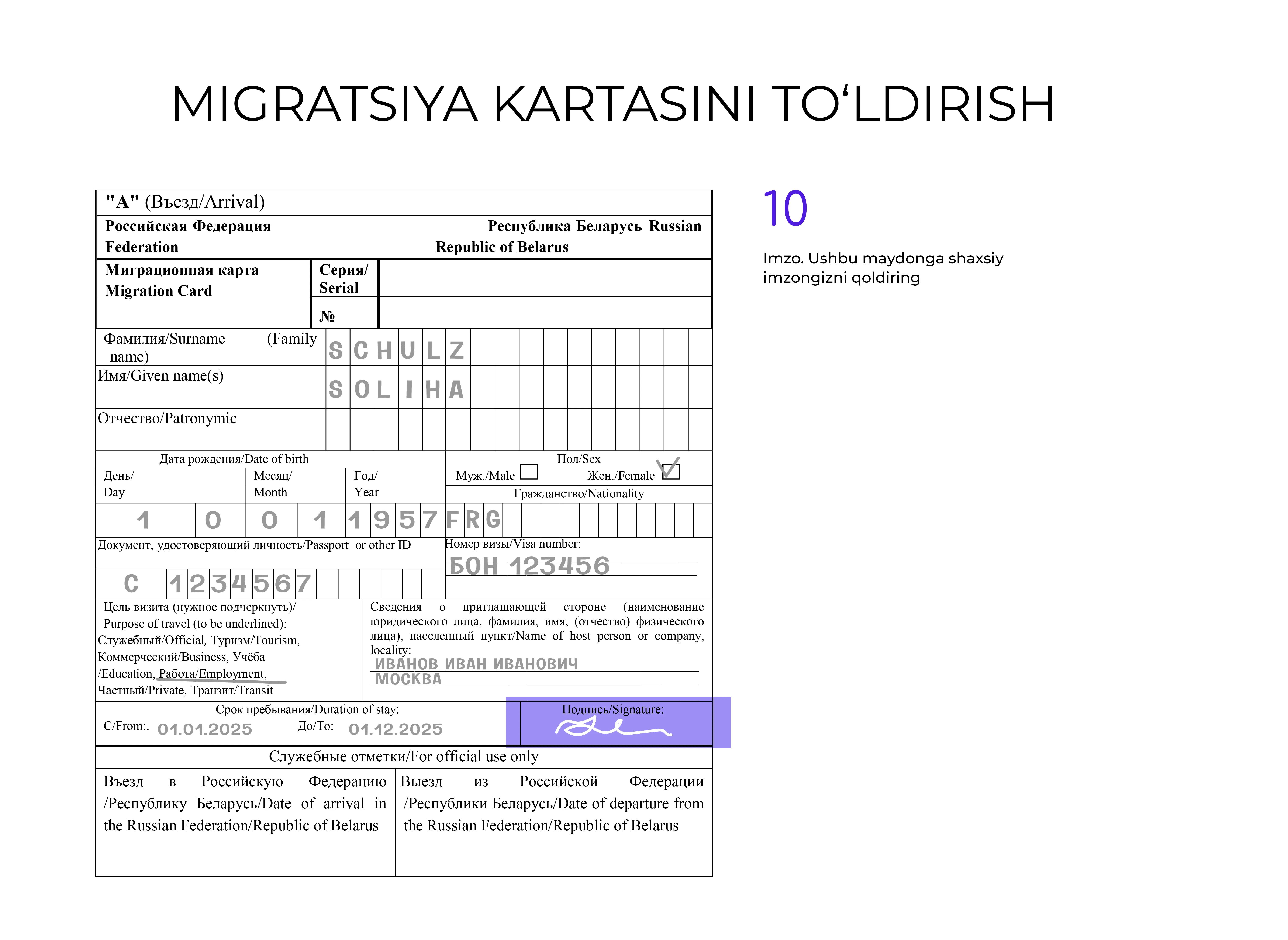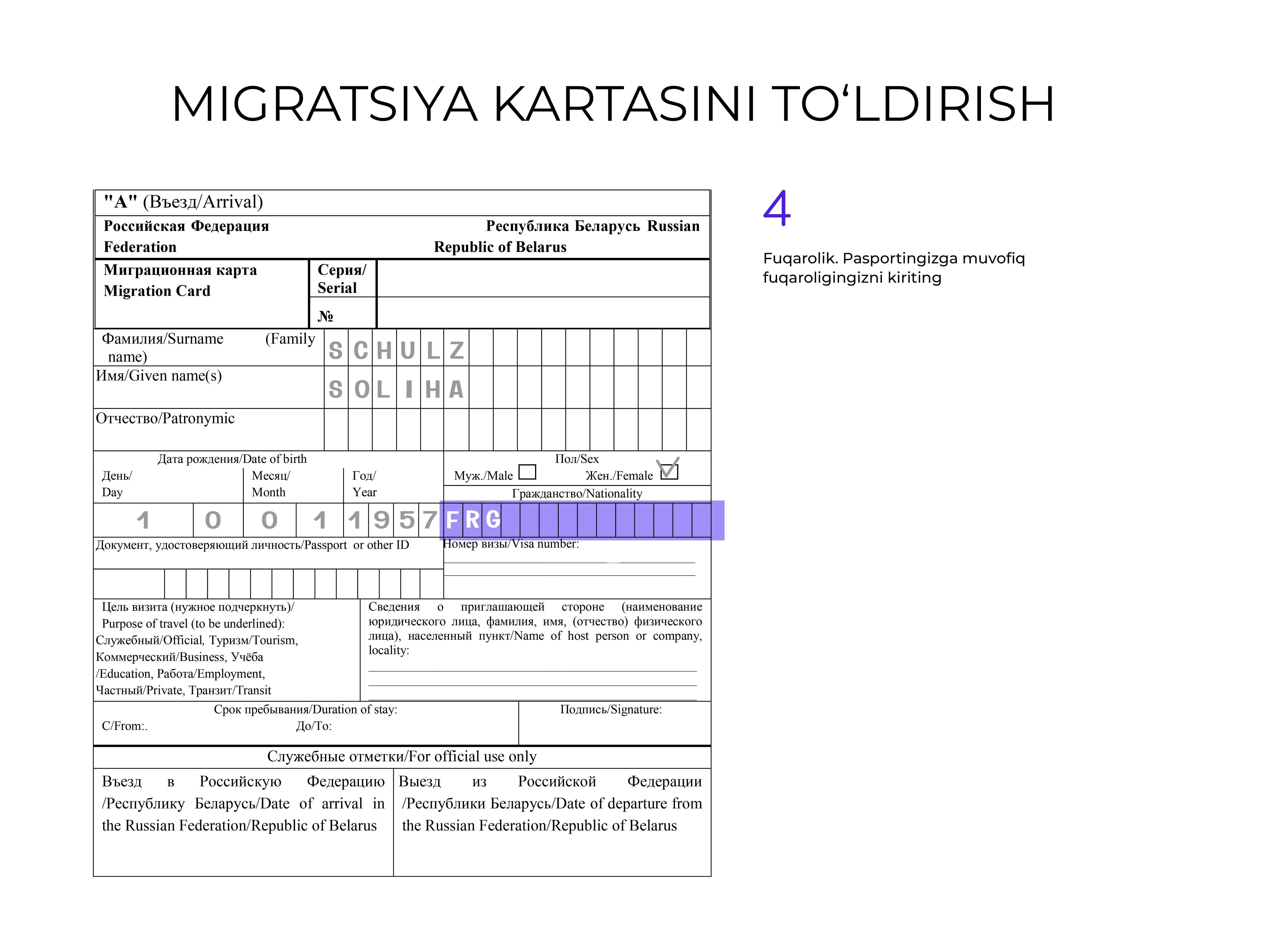 Hujjatni rus tilida toʻldirish tavsiya etiladi, lekin u lotin harflarida ham amalga oshirilishi mumkin.
