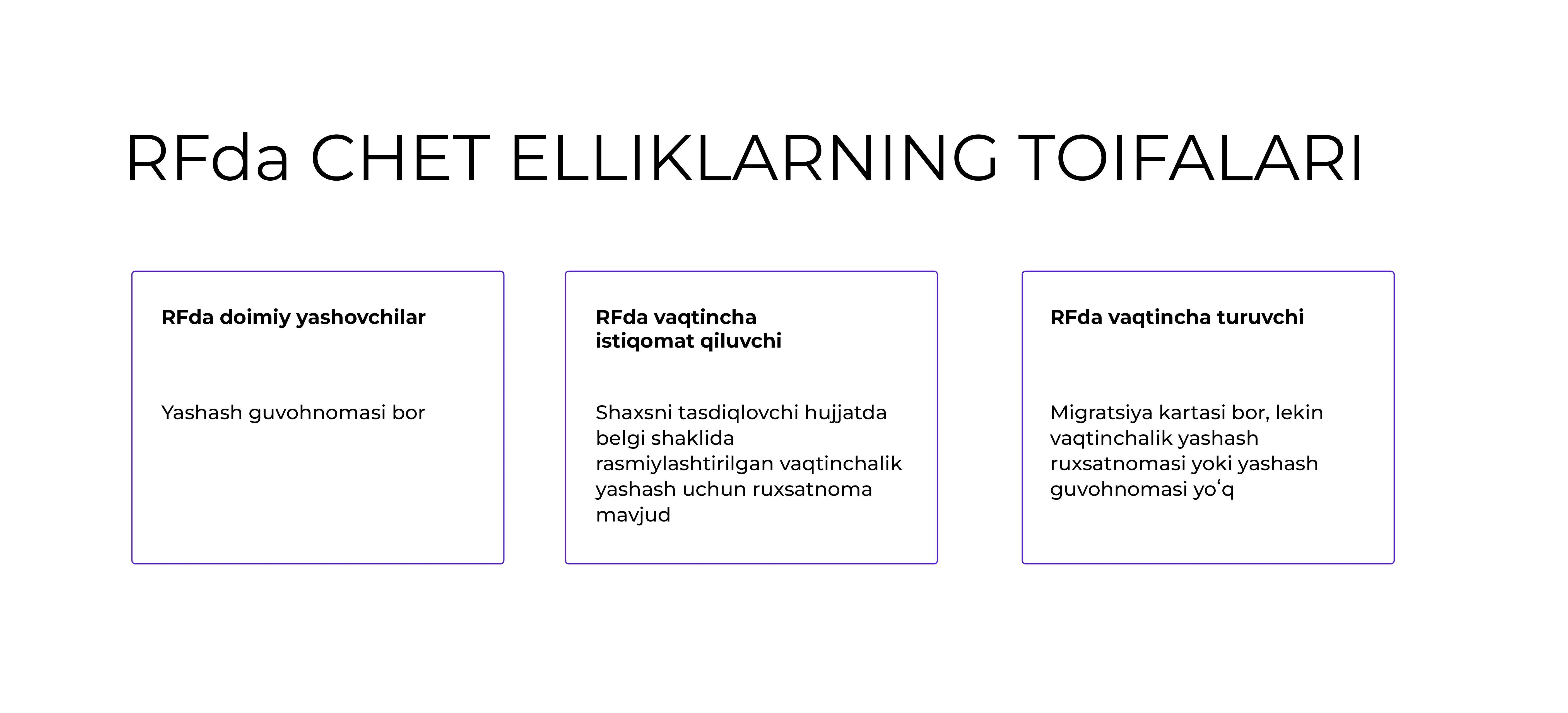 yoki xalqaro shartnomada belgilangan ayrim hollar bundan mustasno. Rossiya Federatsiyasida boʻlgan chet el fuqarolari uch toifaga boʻlingan: