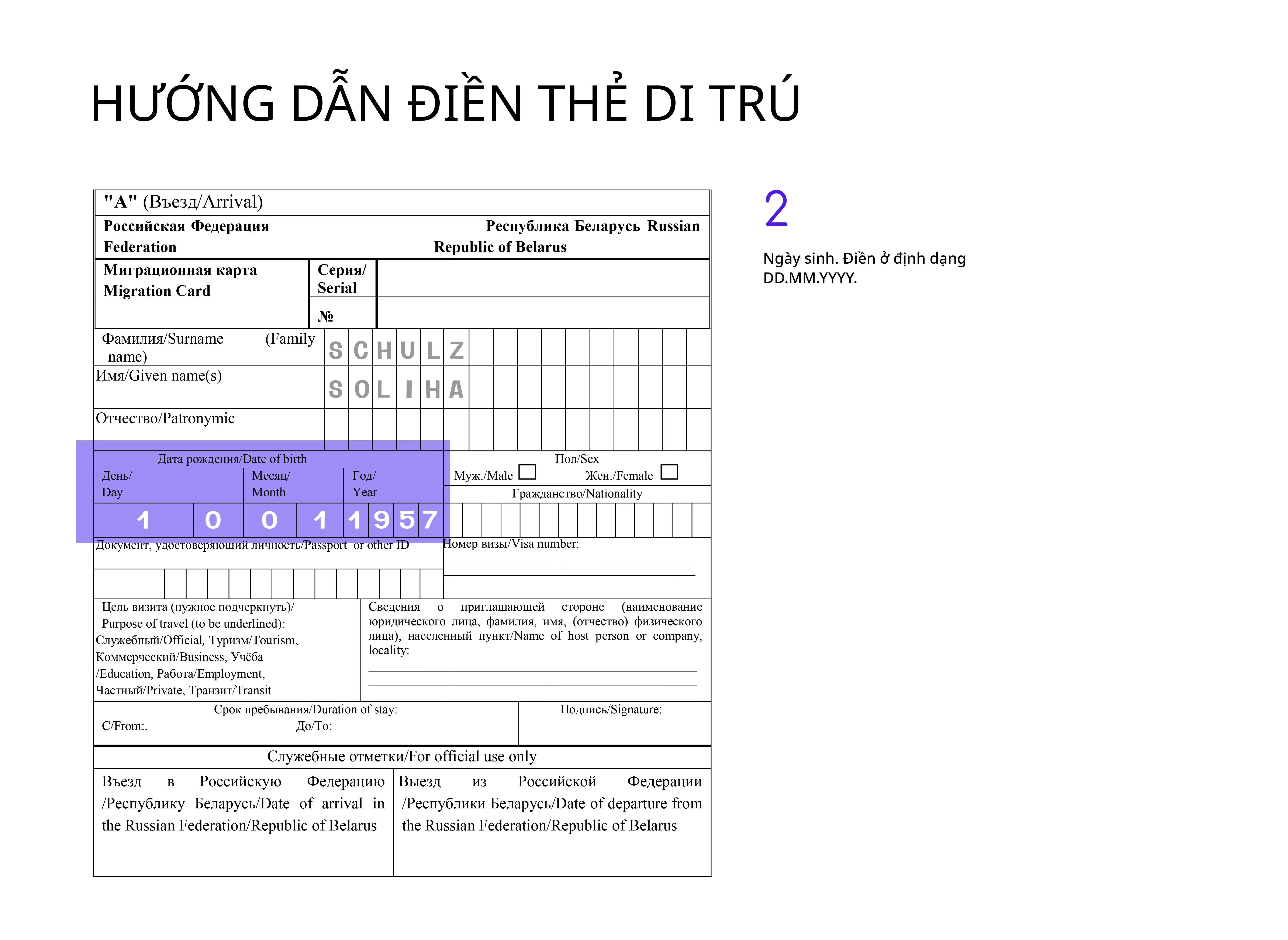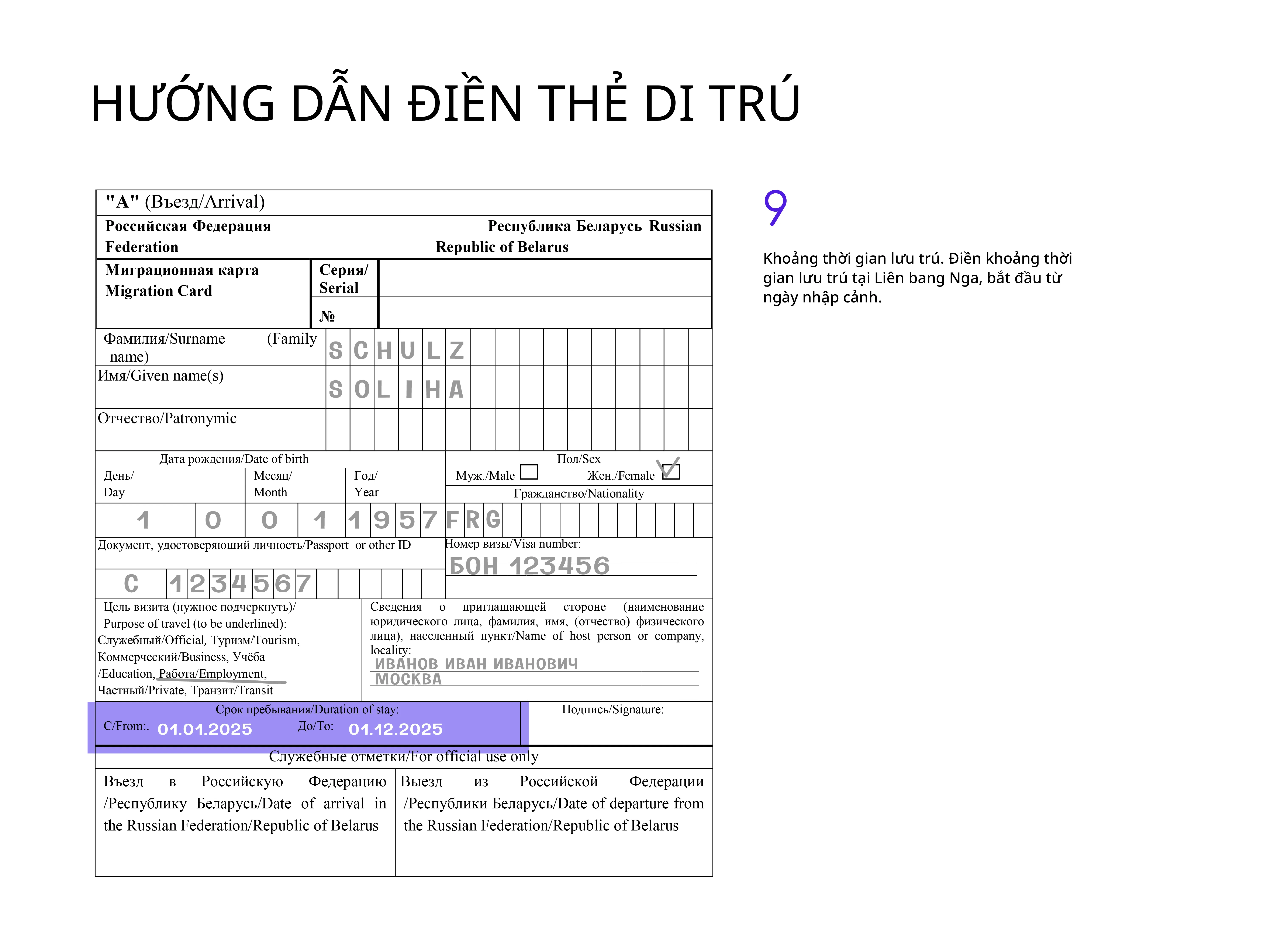 Tốt nhất là điền thẻ di trú bằng tiếng Nga, nhưng dùng chữ Latinh cũng được chấp nhận.