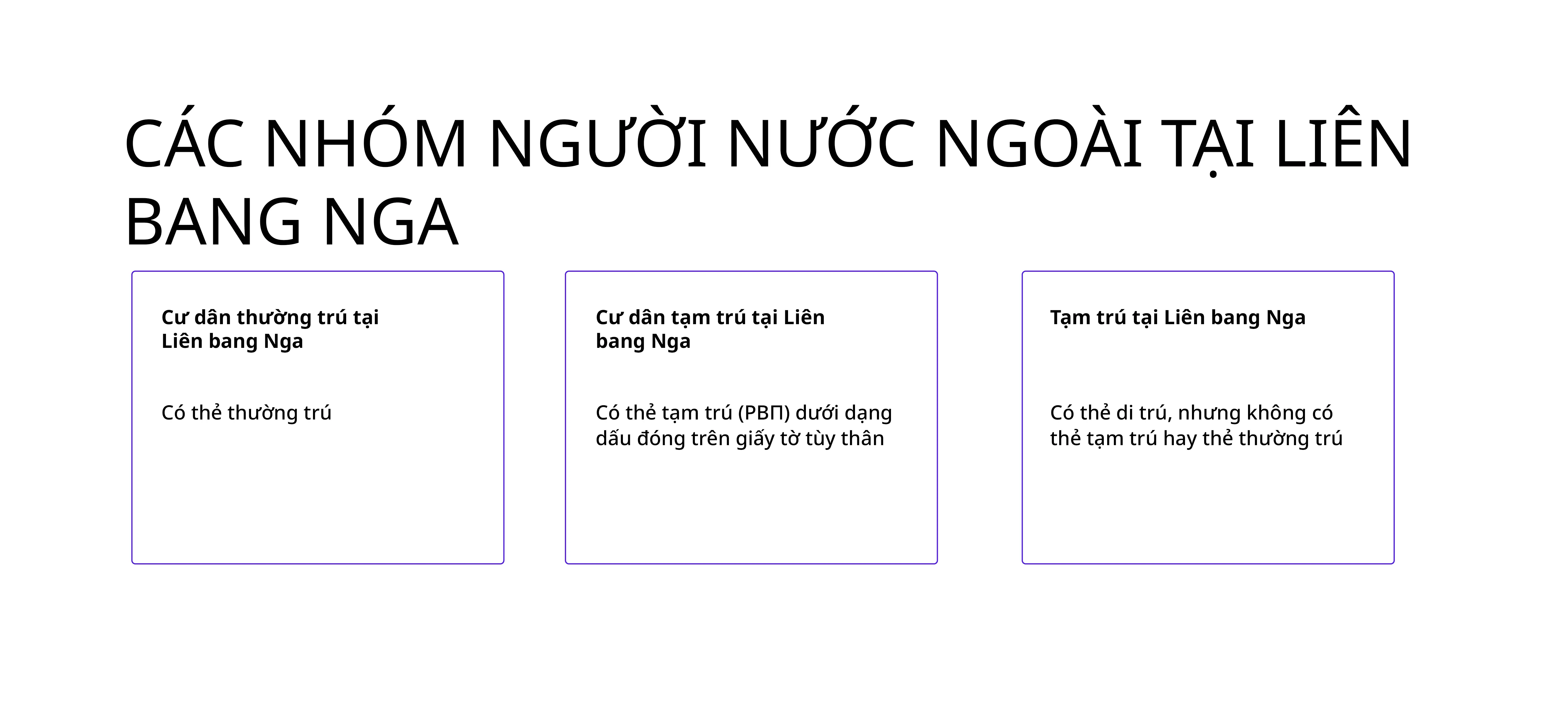 Theo Hiến pháp Liên bang Nga, người nước ngoài được trao các quyền như công dân Nga, ngoại trừ một số trường hợp được quy định bởi luật liên bang hoặc hiệp ước quốc tế. Người nước ngoài lưu trú tại lãnh thổ Liên bang Nga được chia thành 3 loại: